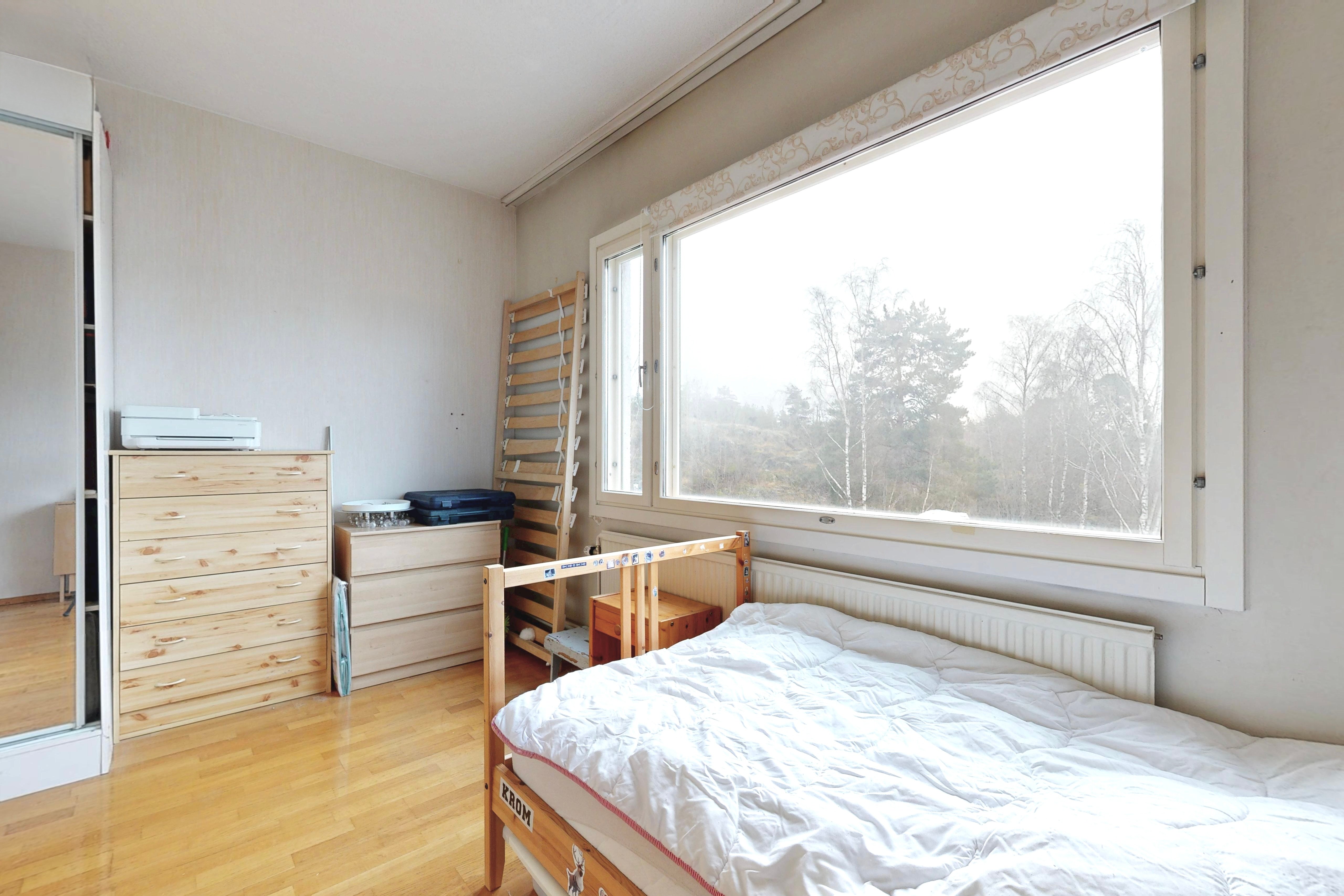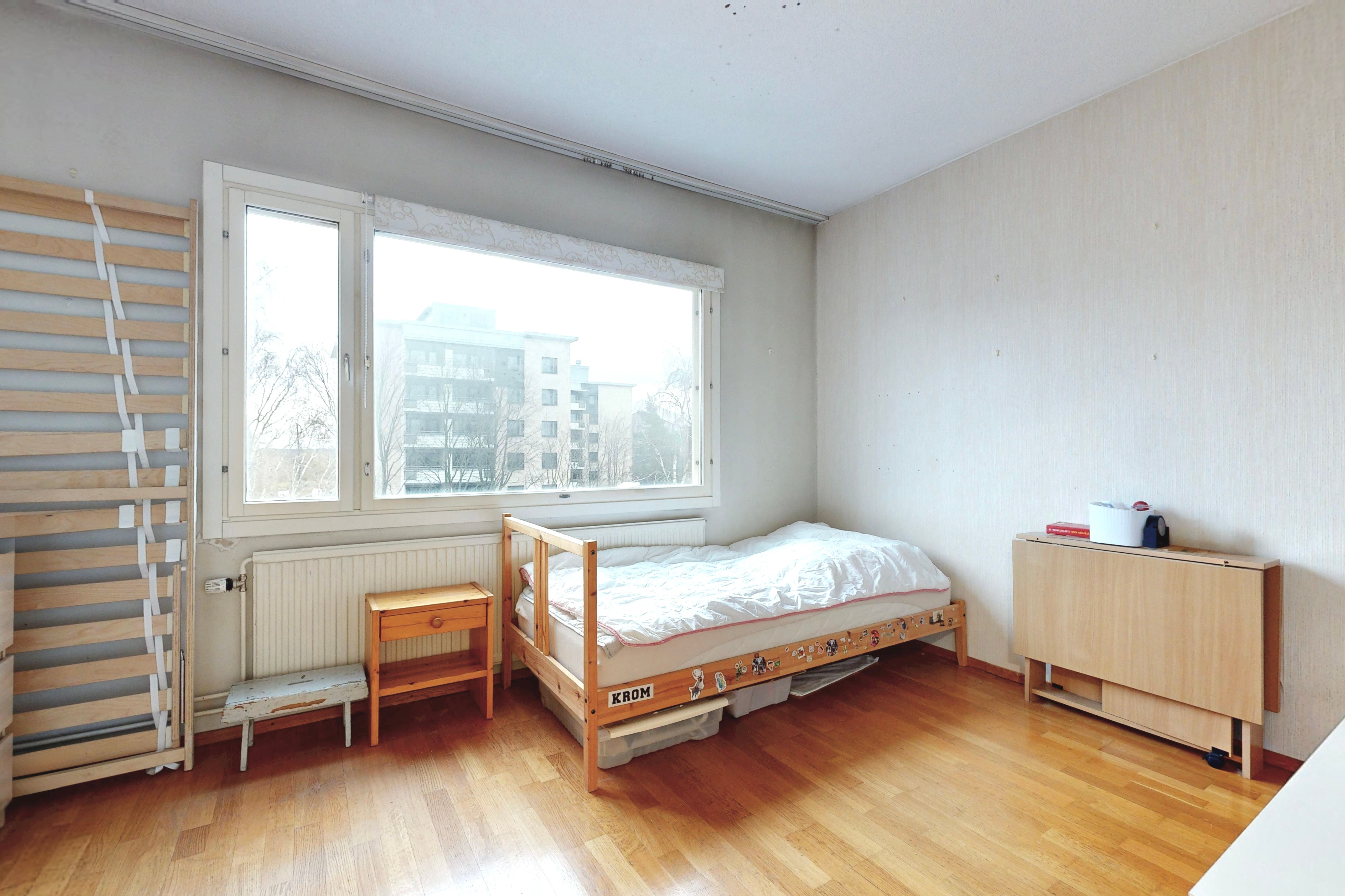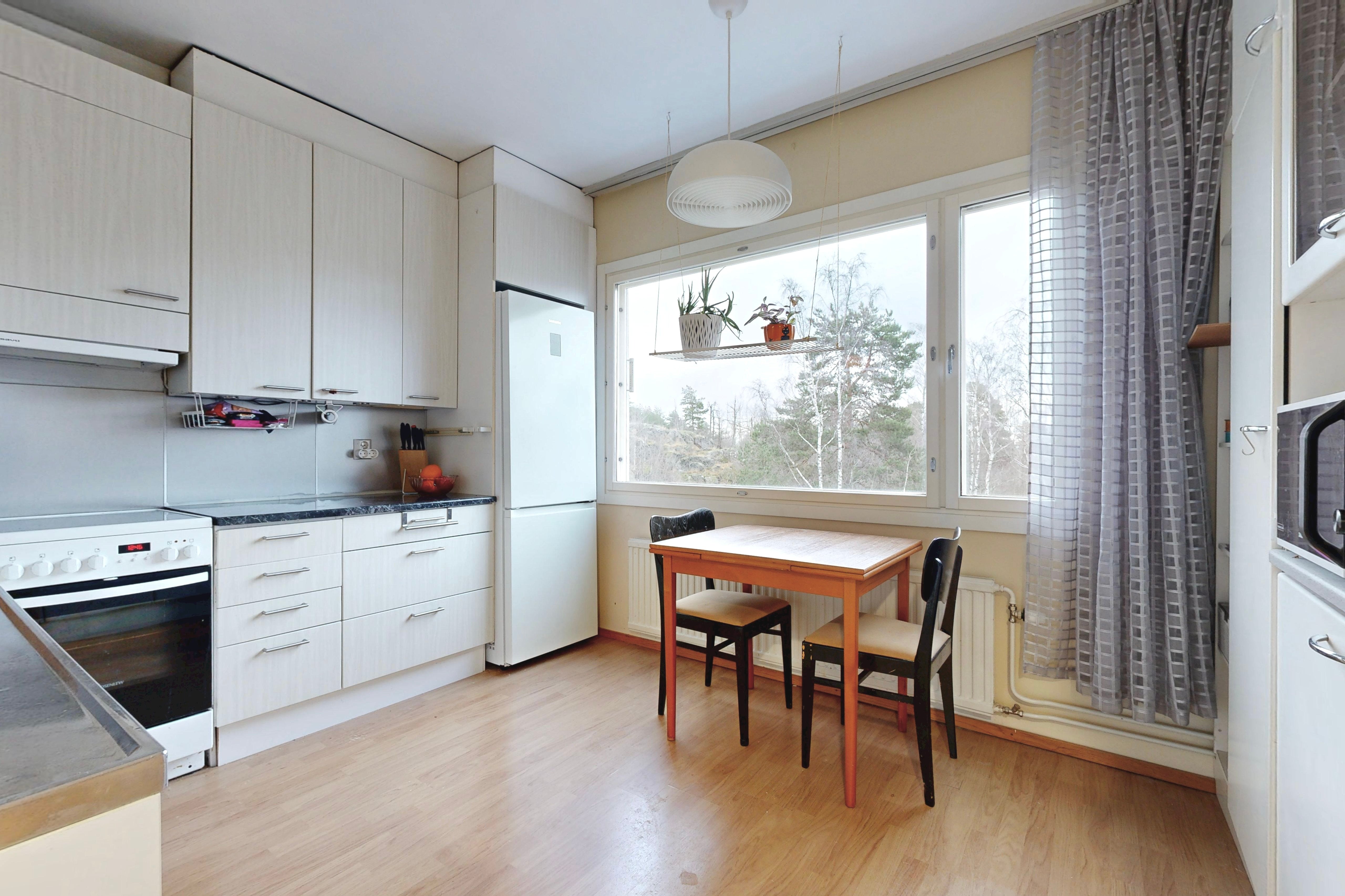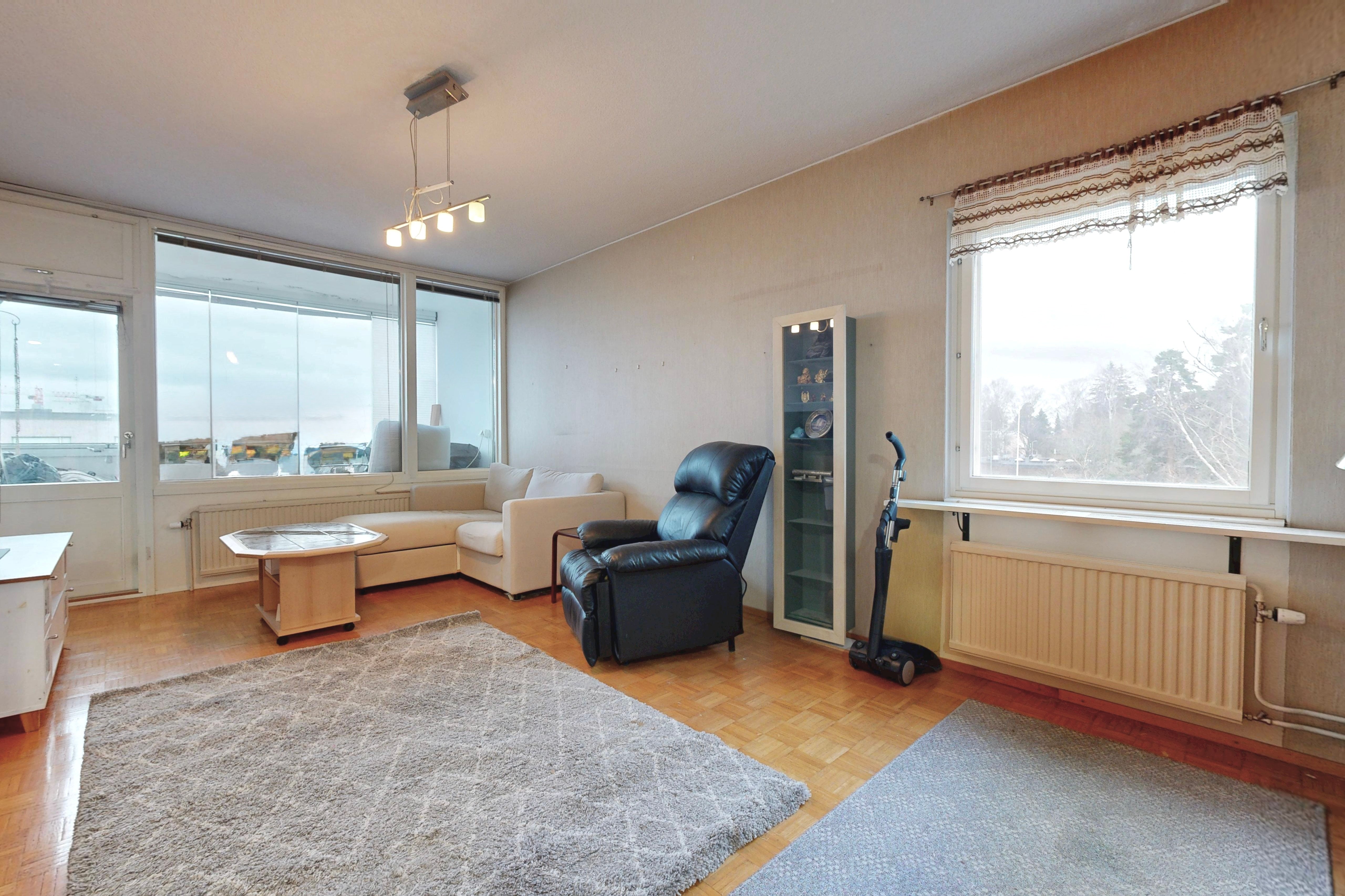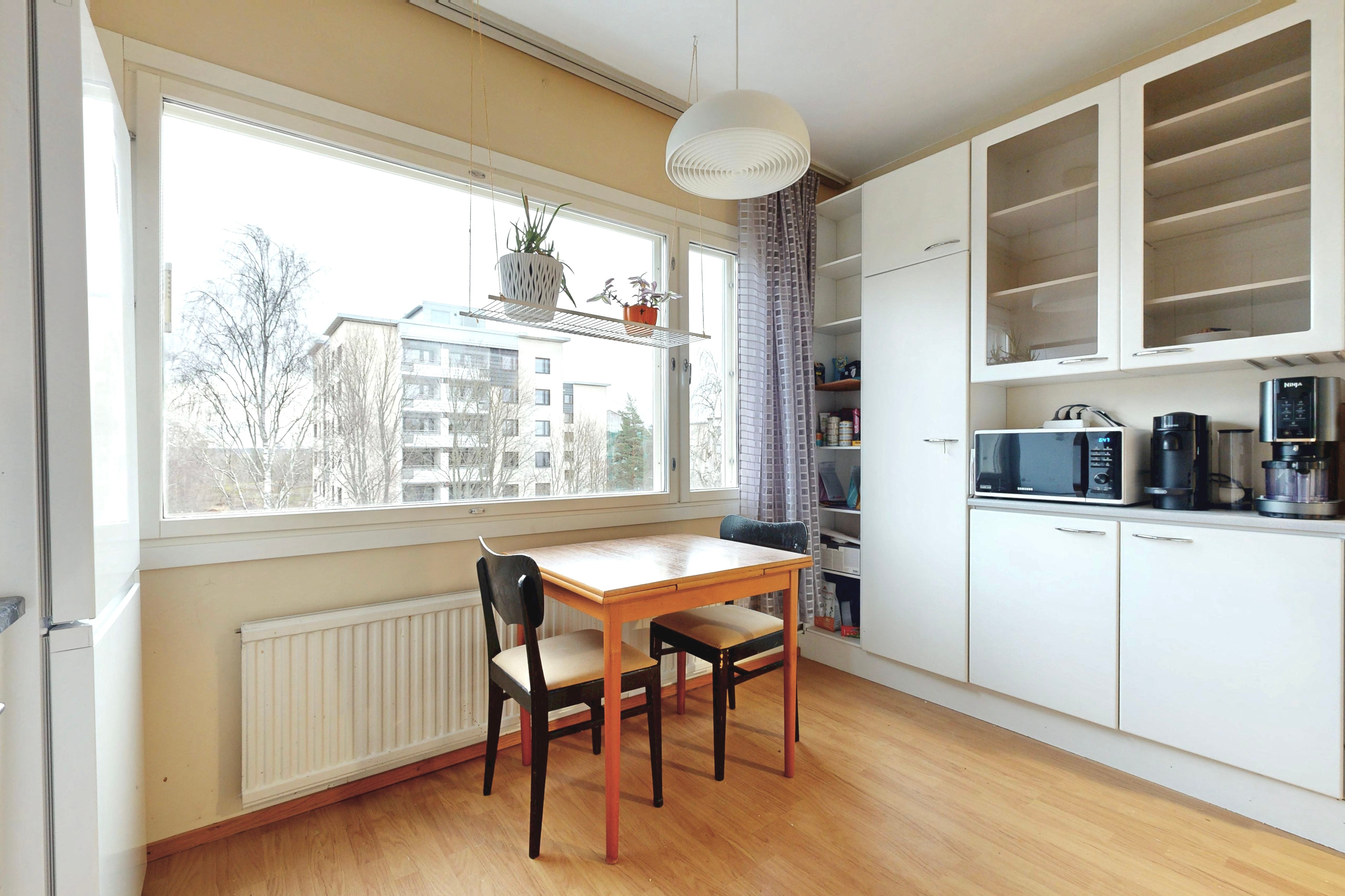 Tämä päätyhuoneisto tarjoaa mainion pohjaratkaisun ja valoisuutta kolmeen suuntaan. Tilava olohuone, minkä yhteydessä lasitettu parveke. Olohuoneen vieressä toinen makuuhuone, jonka vierestä löytyy reilun kokoinen vaatehuone. Pitkästä eteisestä on käynti toiseen makuuhuoneeseen, josta löytyy tilaa ison sängyn lisäksi esimerkiksi työpisteelle. Keittiöstä löytyy runsaasti kaappi- ja laskutilaa. Kylpyhuone on juuri uusittu putkiremontin yhteydessä.
