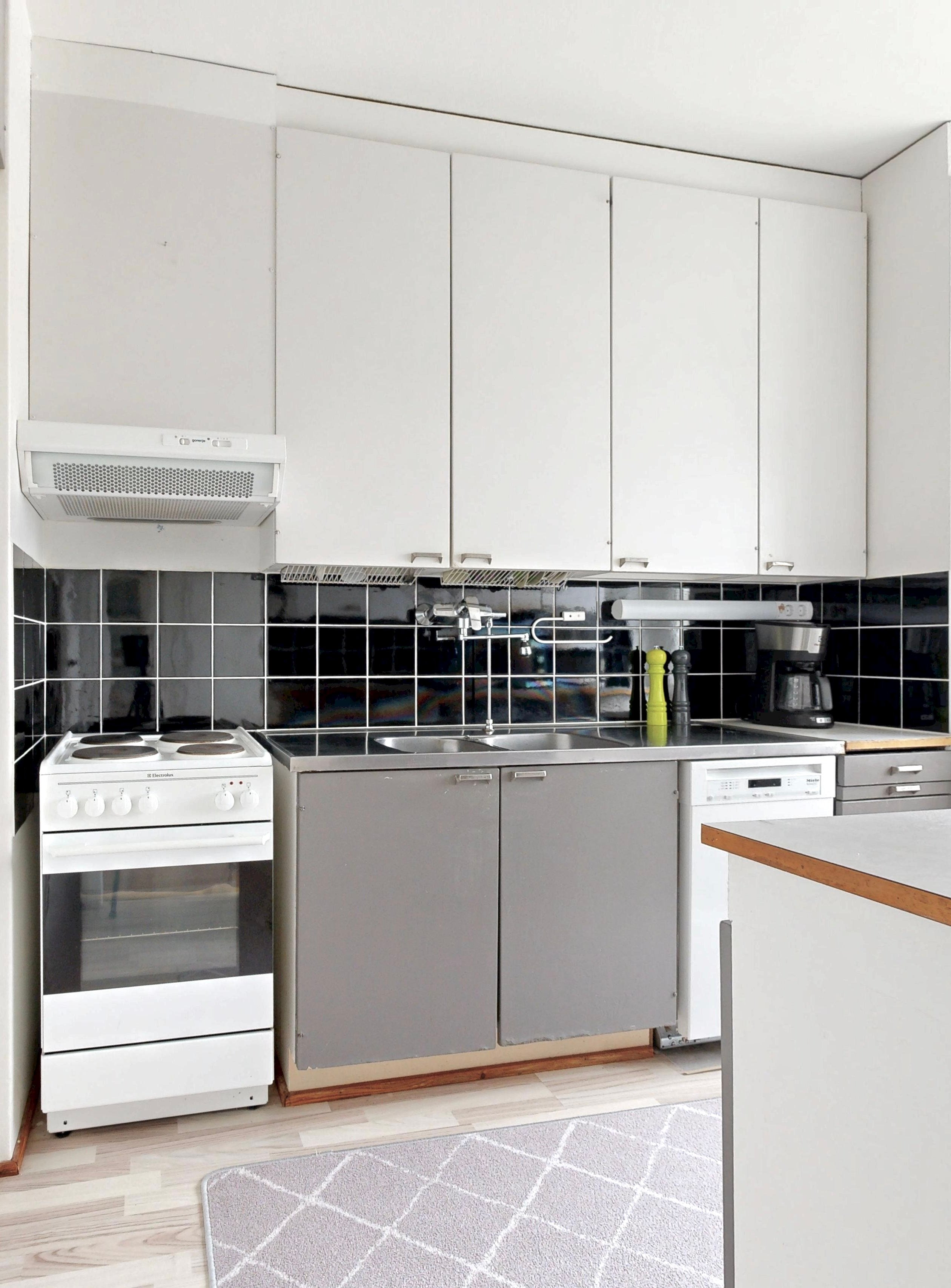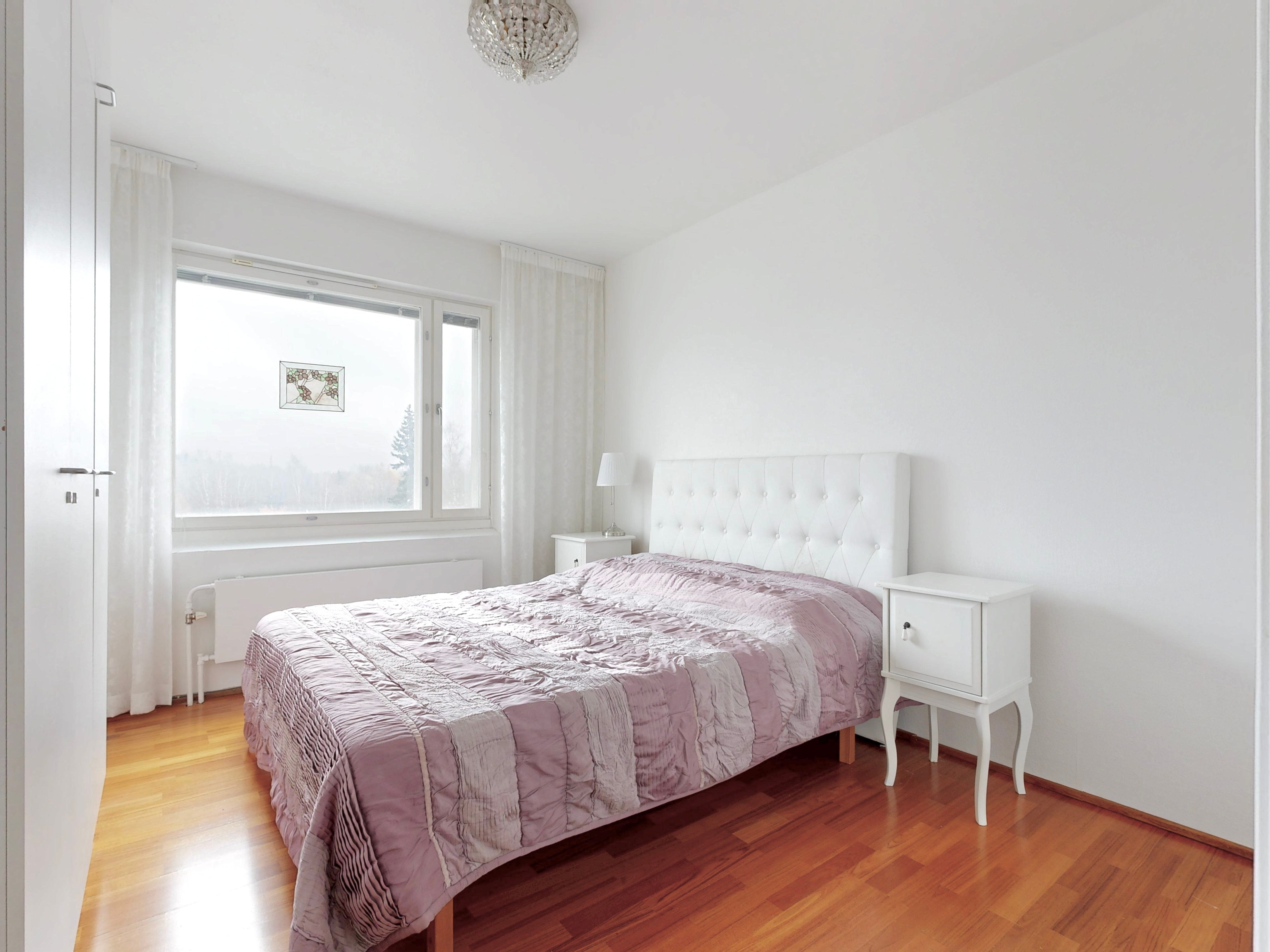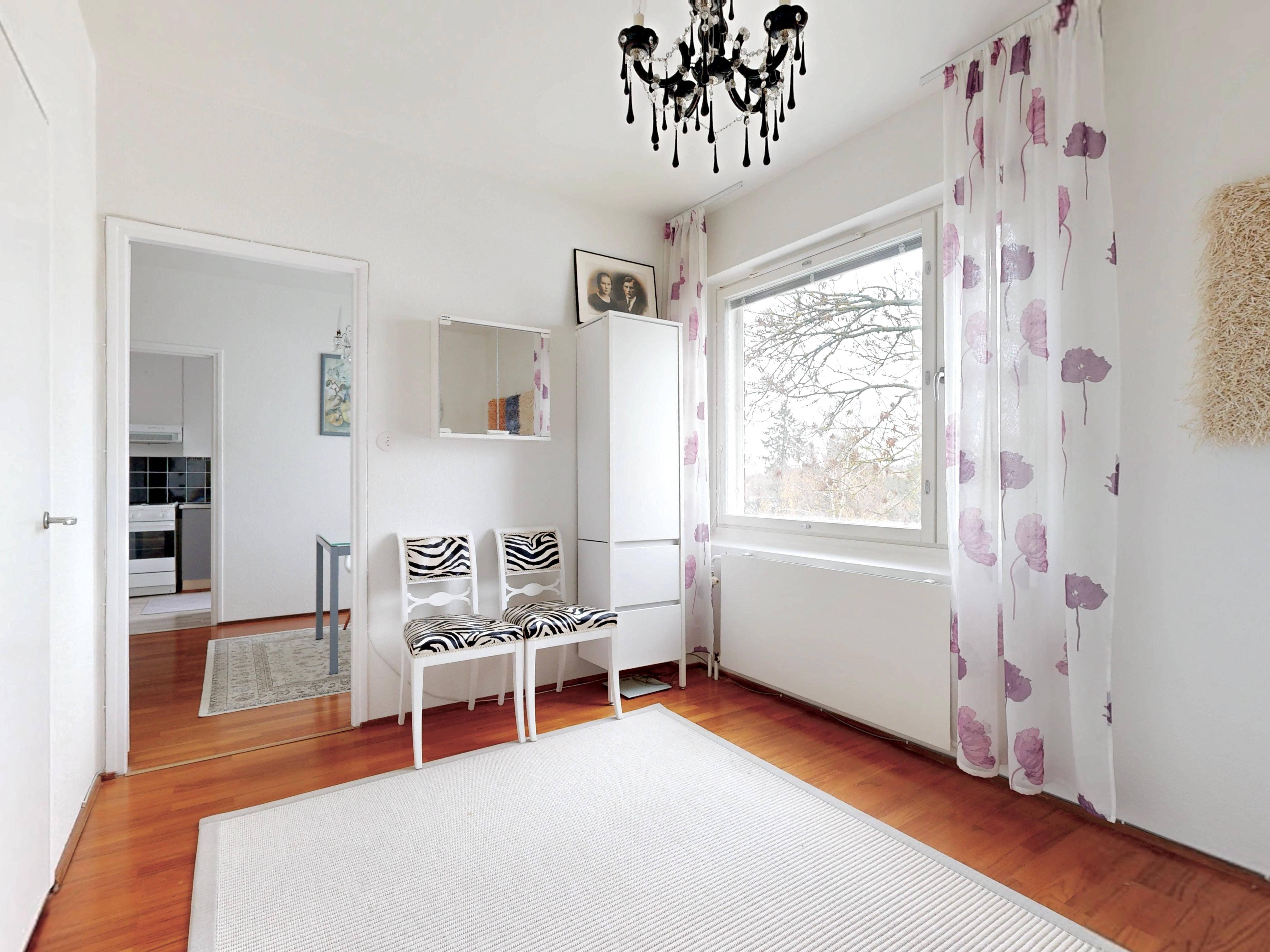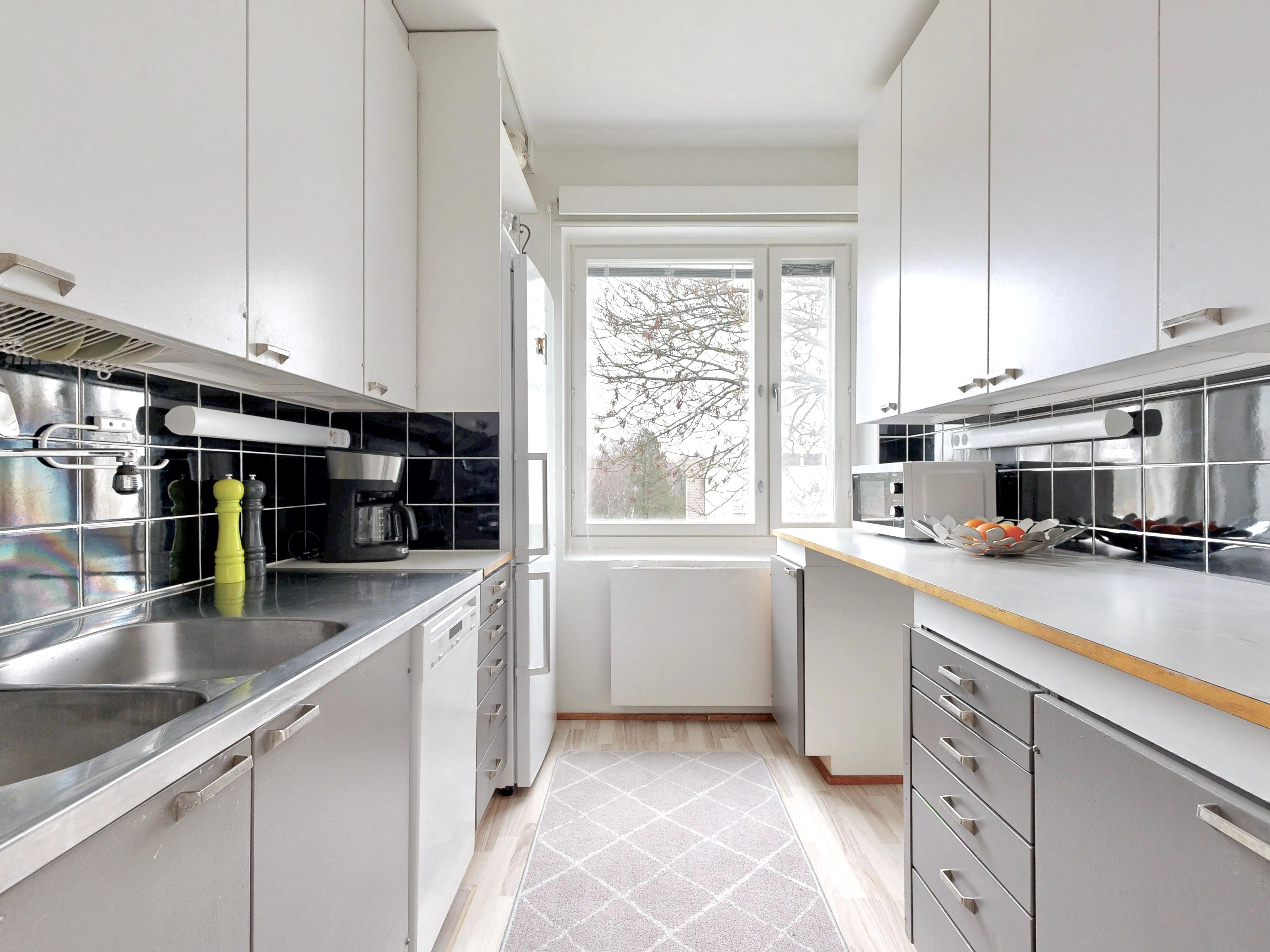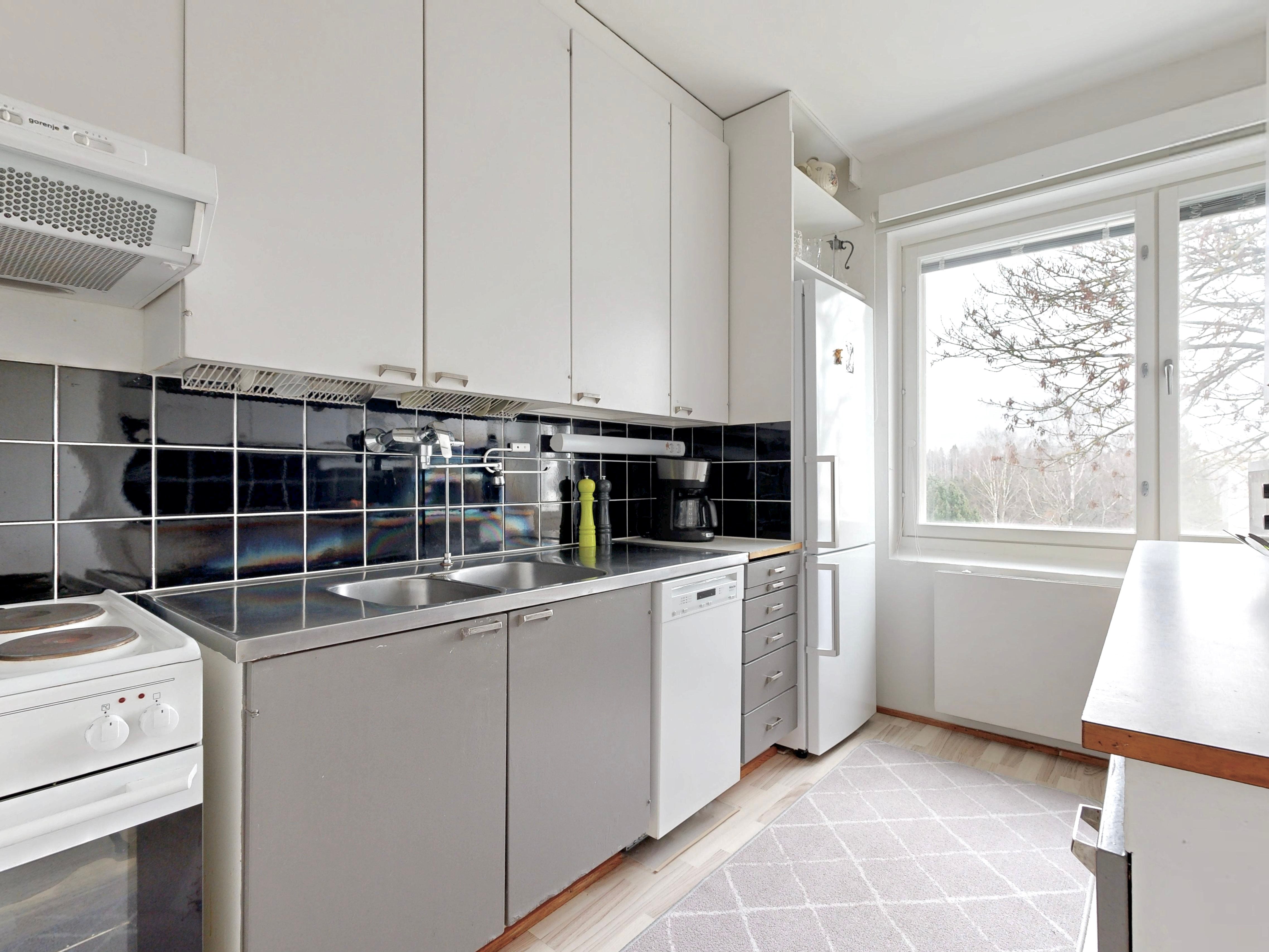 kaapistot ja hyvin kaappi-ja laskutilaa. Keittiön vieressä erillinen ruokailutila. Kaksi makuuhuonetta, jotka toimivat hyvin eri käyttötarkoituksiin esim. työ- ja lastenhuoneena. Tyylikäs kylpyhuone on remontoitu putkiremontin yhteydessä, jossa tilaa pyykinpesukoneelle.