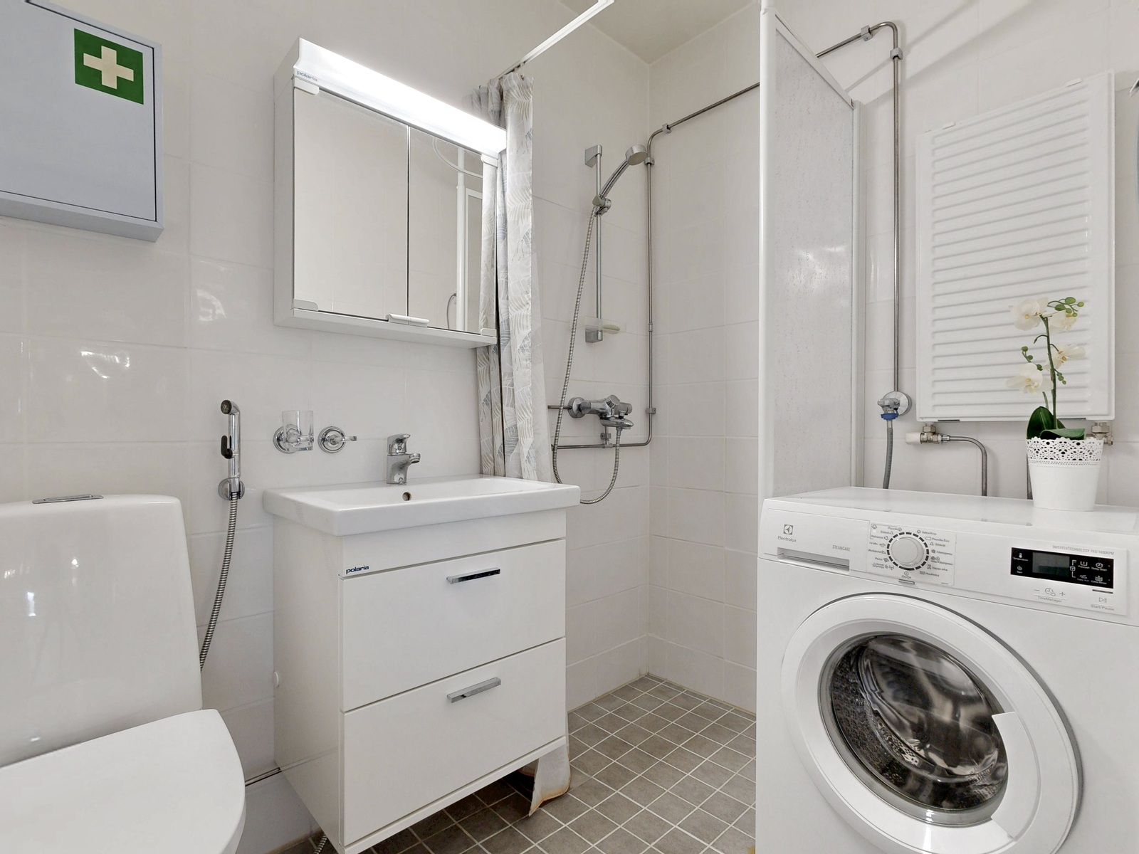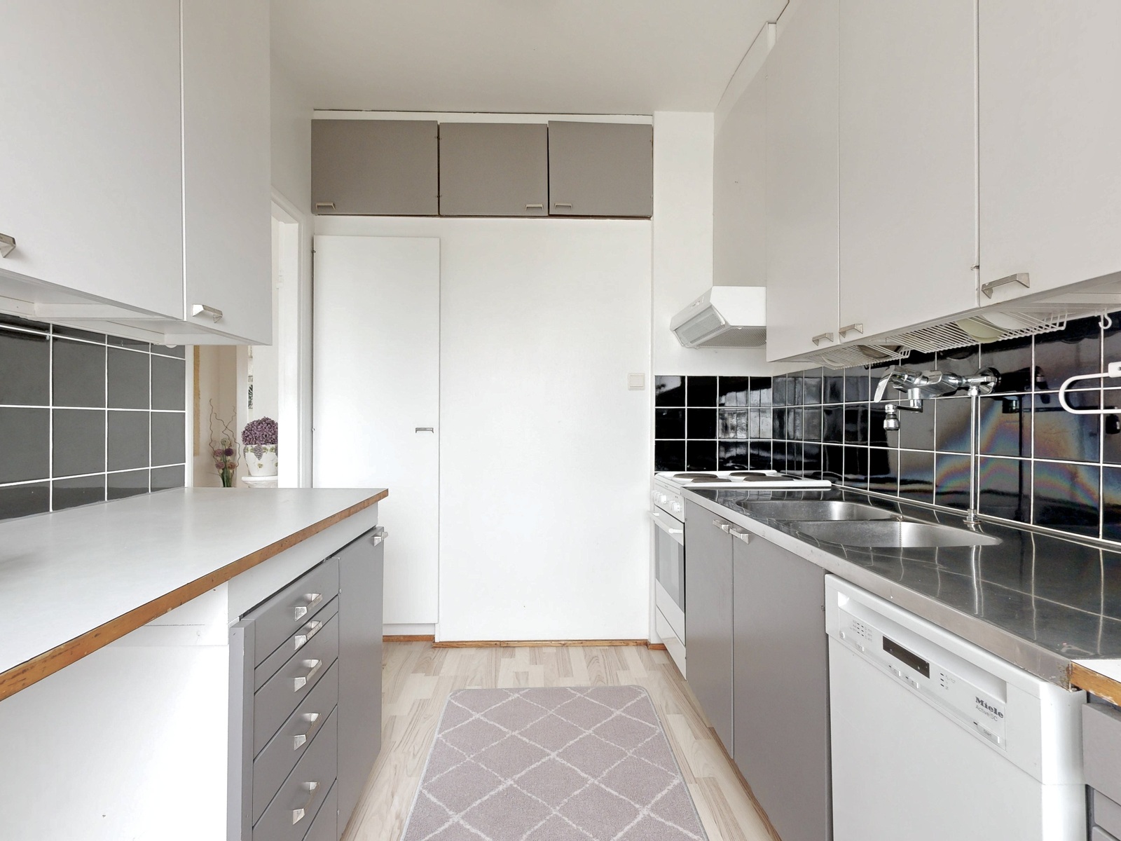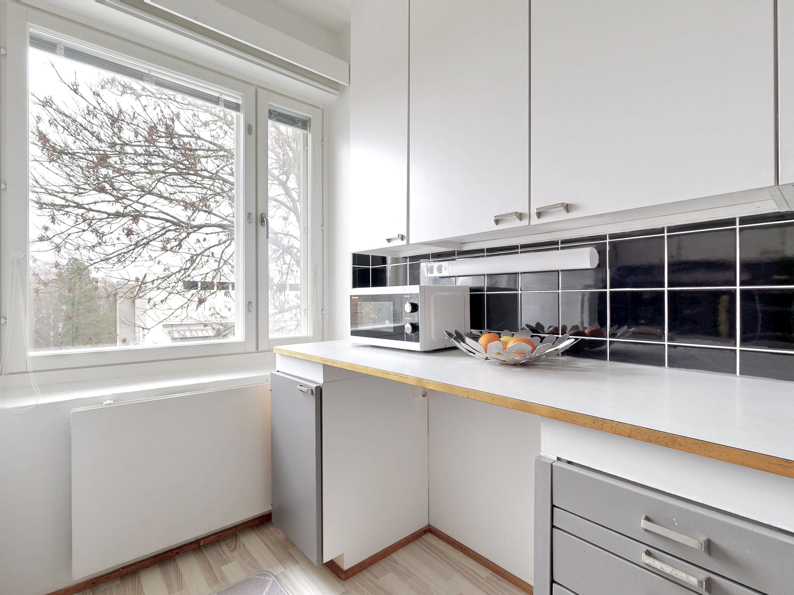 kaapistot ja hyvin kaappi-ja laskutilaa. Keittiön vieressä erillinen ruokailutila. Kaksi makuuhuonetta, jotka toimivat hyvin eri käyttötarkoituksiin esim. työ- ja lastenhuoneena. Tyylikäs kylpyhuone on remontoitu putkiremontin yhteydessä, jossa tilaa pyykinpesukoneelle.