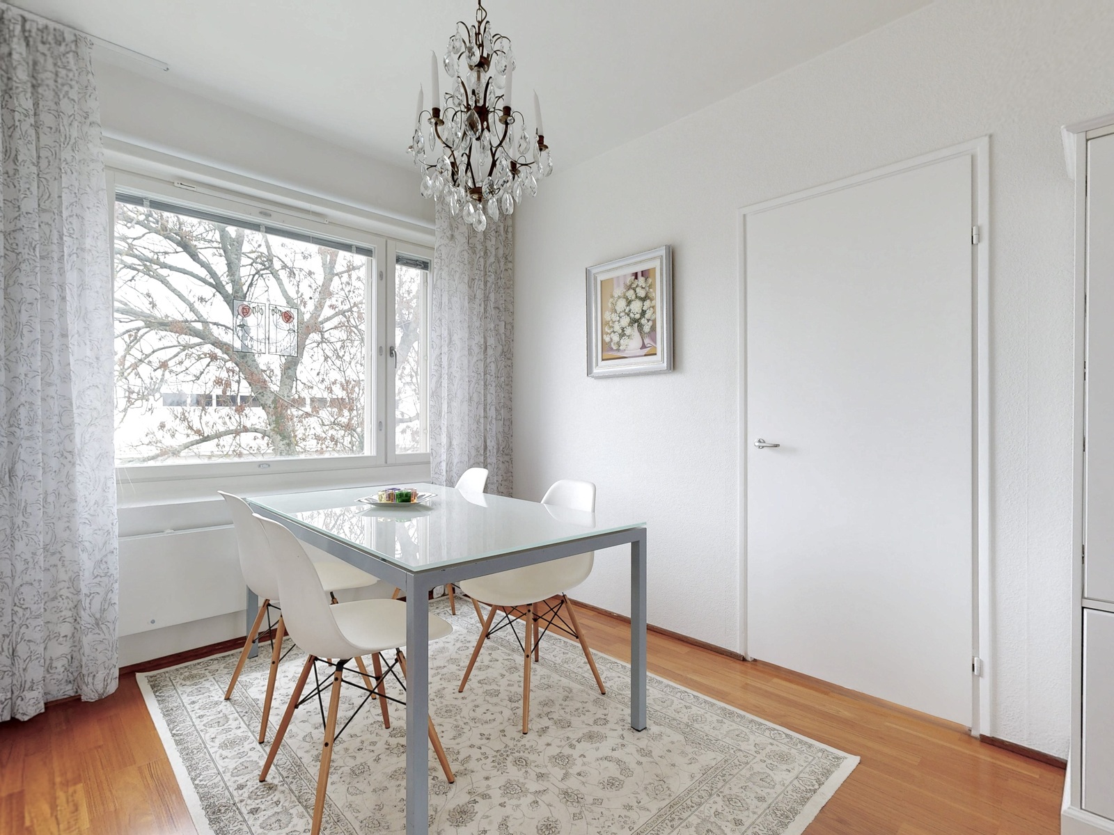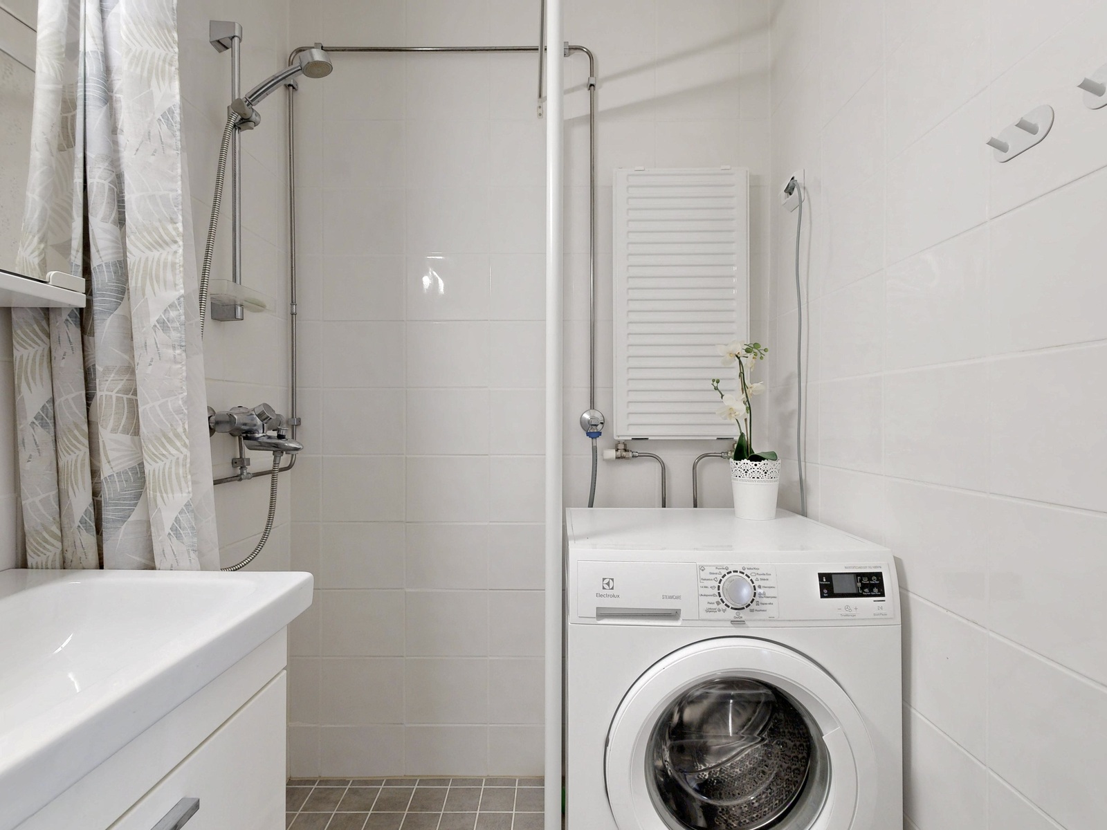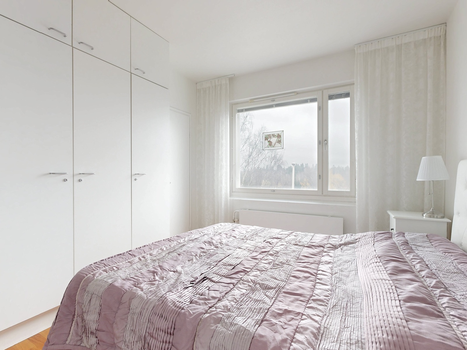 kaapistot ja hyvin kaappi-ja laskutilaa. Keittiön vieressä erillinen ruokailutila. Kaksi makuuhuonetta, jotka toimivat hyvin eri käyttötarkoituksiin esim. työ- ja lastenhuoneena. Tyylikäs kylpyhuone on remontoitu putkiremontin yhteydessä, jossa tilaa pyykinpesukoneelle.