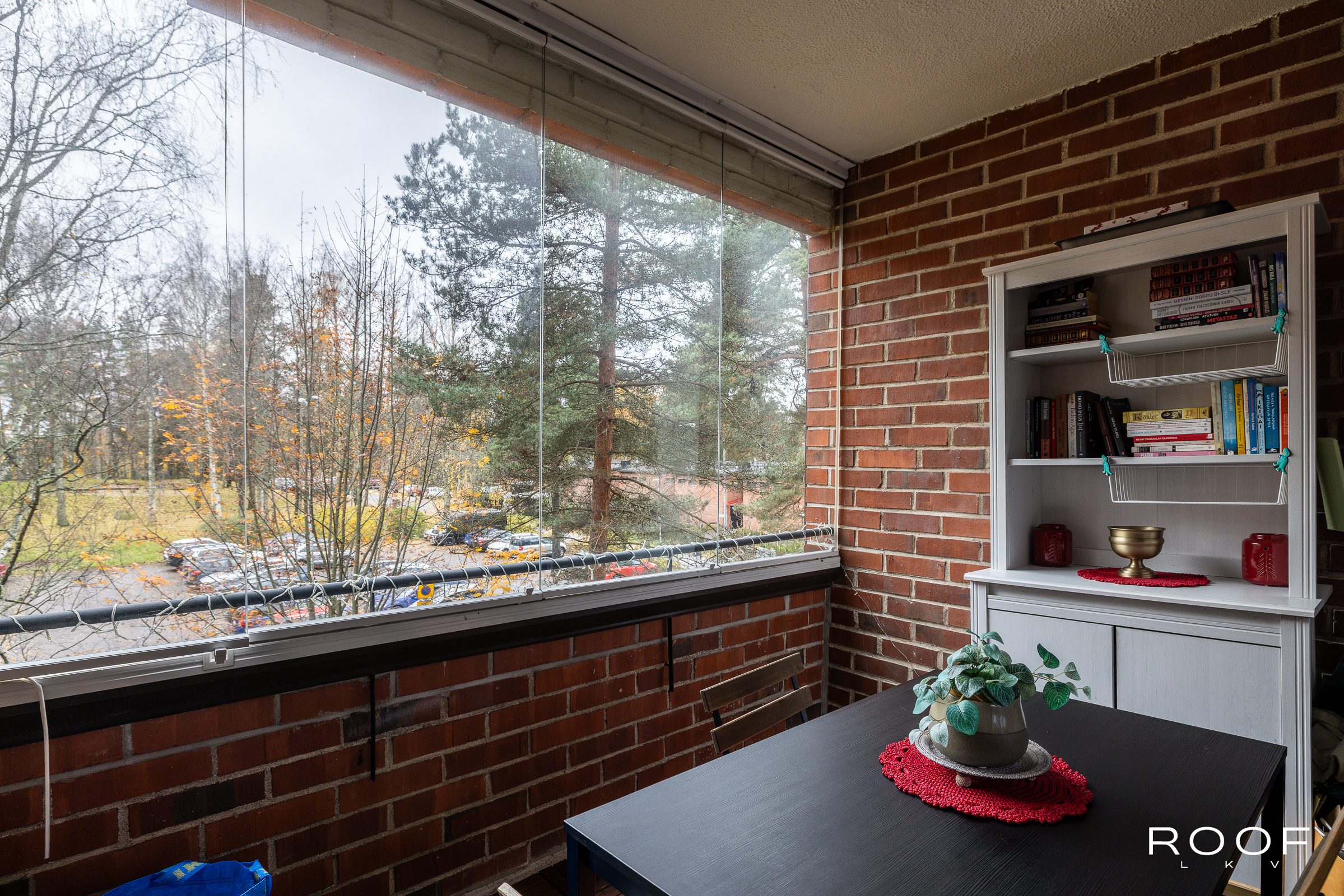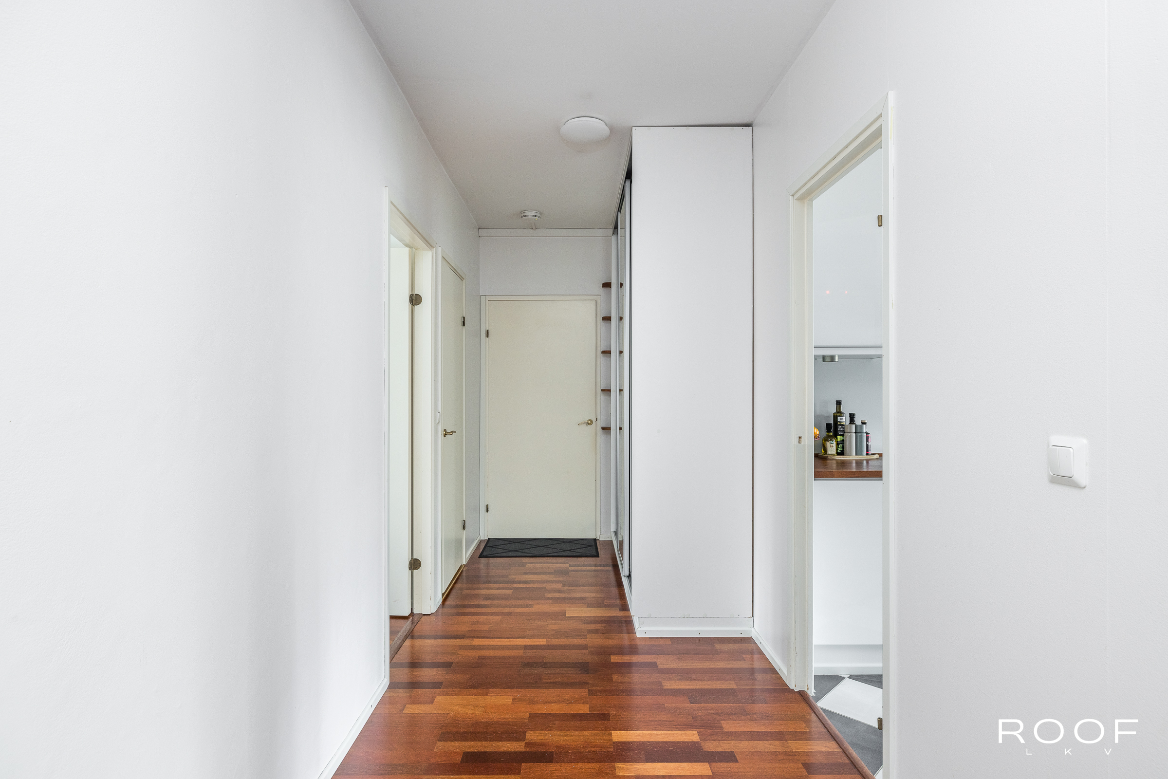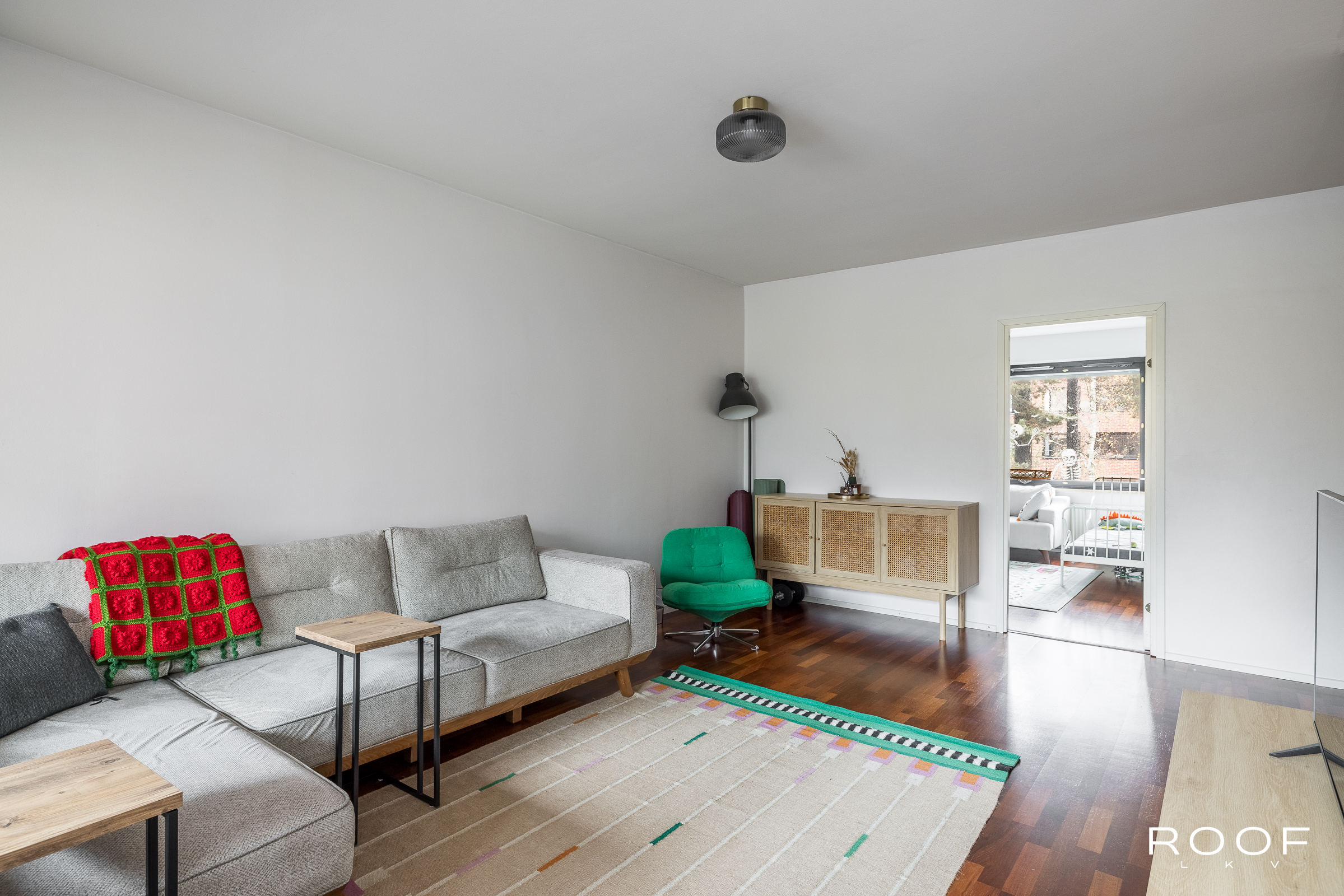 Tässä kodissa katseen vangitsijana on Merbau-puu, jota on käytetty tyylikkäästi lattiamateriaalina sekä keittiön työtasossa. Kodin pinnat on siistissä kunnossa. Keittiössä on reilusti lasku- ja säilytystilaa, ruokailupöydän saat mahtumaan keittiöön ja suuremman ruokailuryhmän saa halutessaan olohuoneen puolelle. Osassa asunnoissa on avattu keittiön ja olohuoneen välinen seinä, jolloin on mahdollista saada avokeittiö. Kylpyhuone on uusittu linjasaneerauksen yhteydessä, kylpyhuoneeseen on valittu astetta laadukkaammat materiaalit. Olohuoneesta on käynti lasitetulle eteläparvekkeelle. Molemmat makuuhuoneet ovat tilavia, toisessa makuuhuoneessa on vaatehuone.