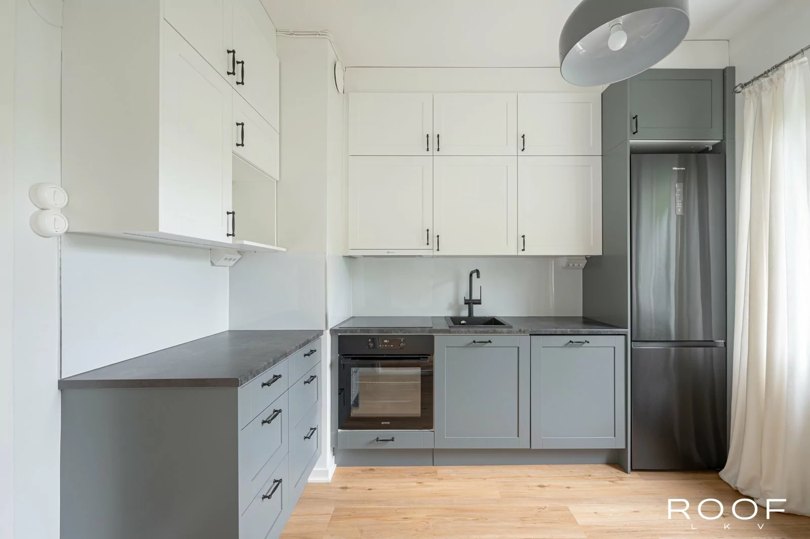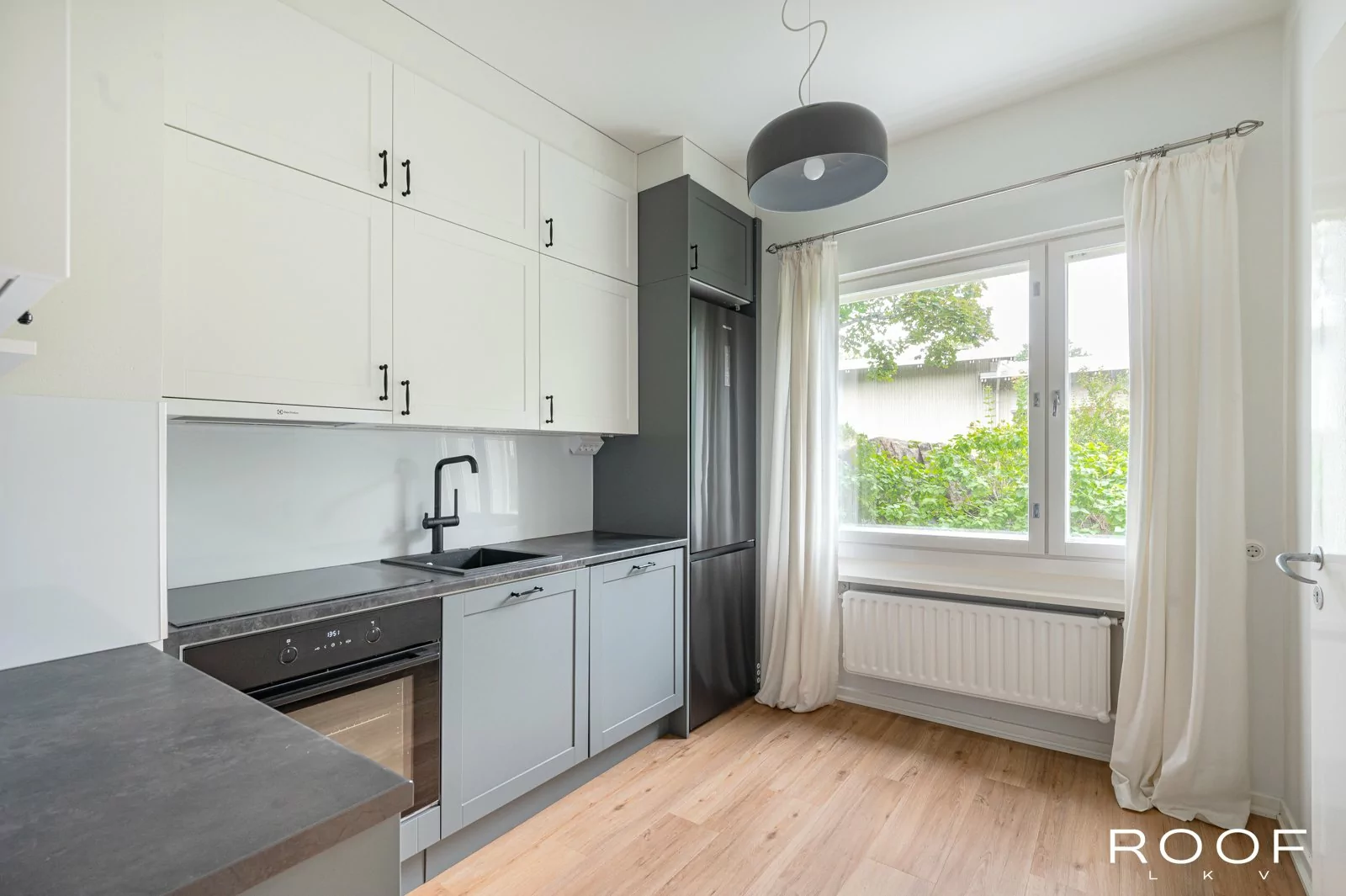 Huoneisto on pintasaneerattu vuonna 2021, jolloin myös keittiö uudistettiin kokonaisuudessaan. Tunnelma on kodikas ja huomio kiinnittyy selkeyteen.