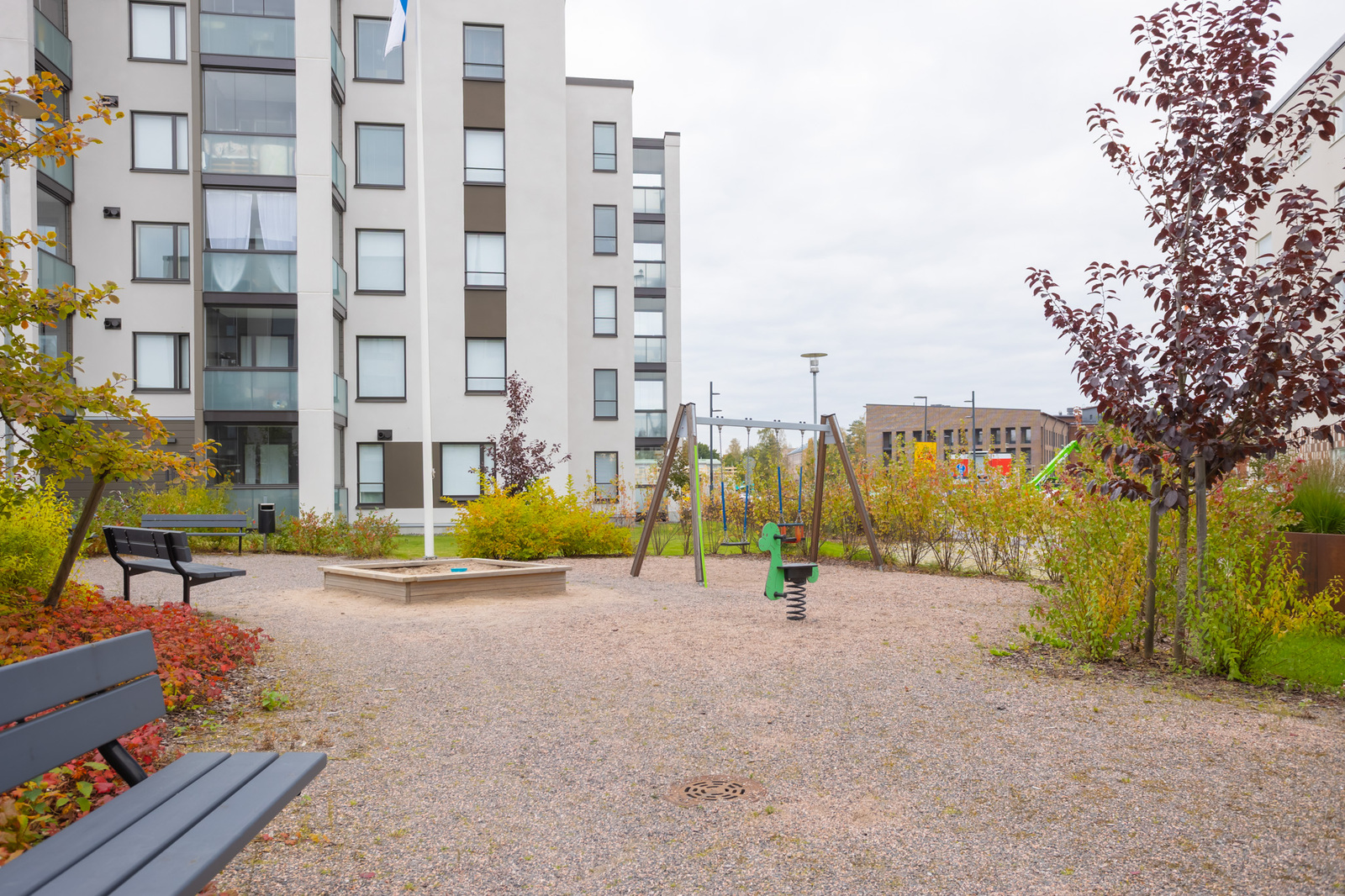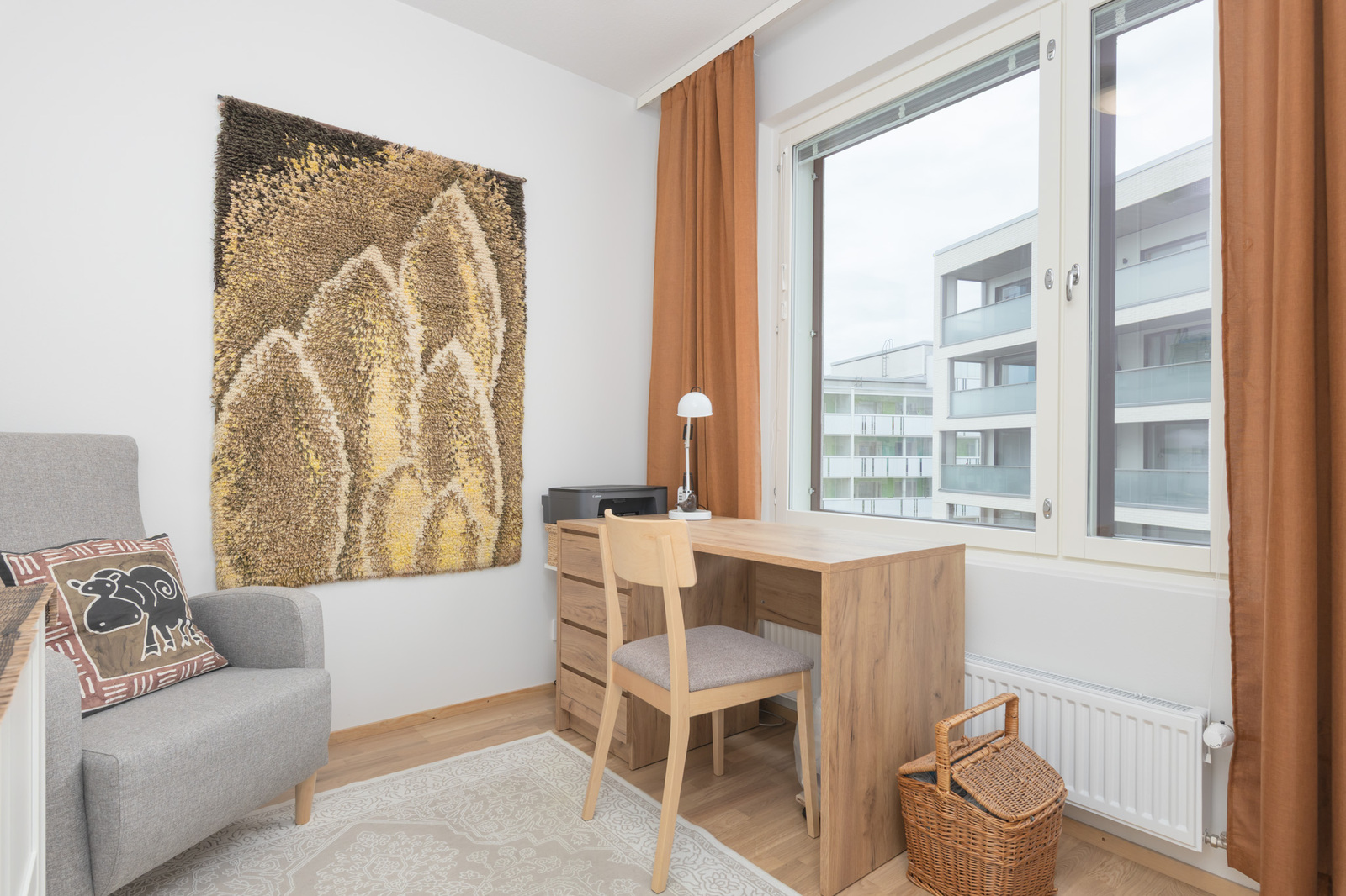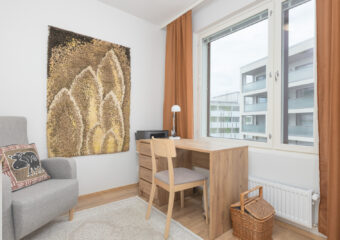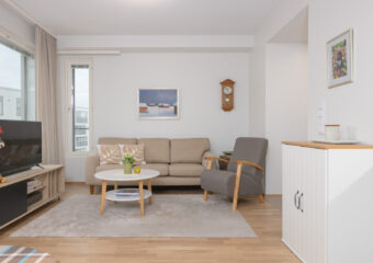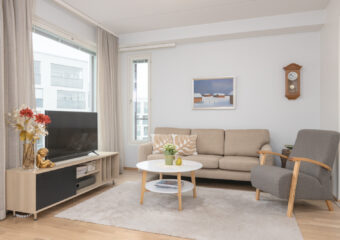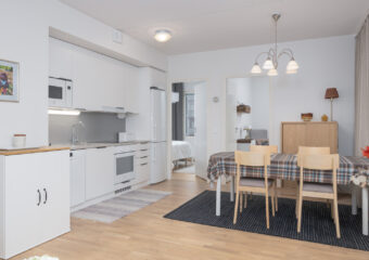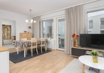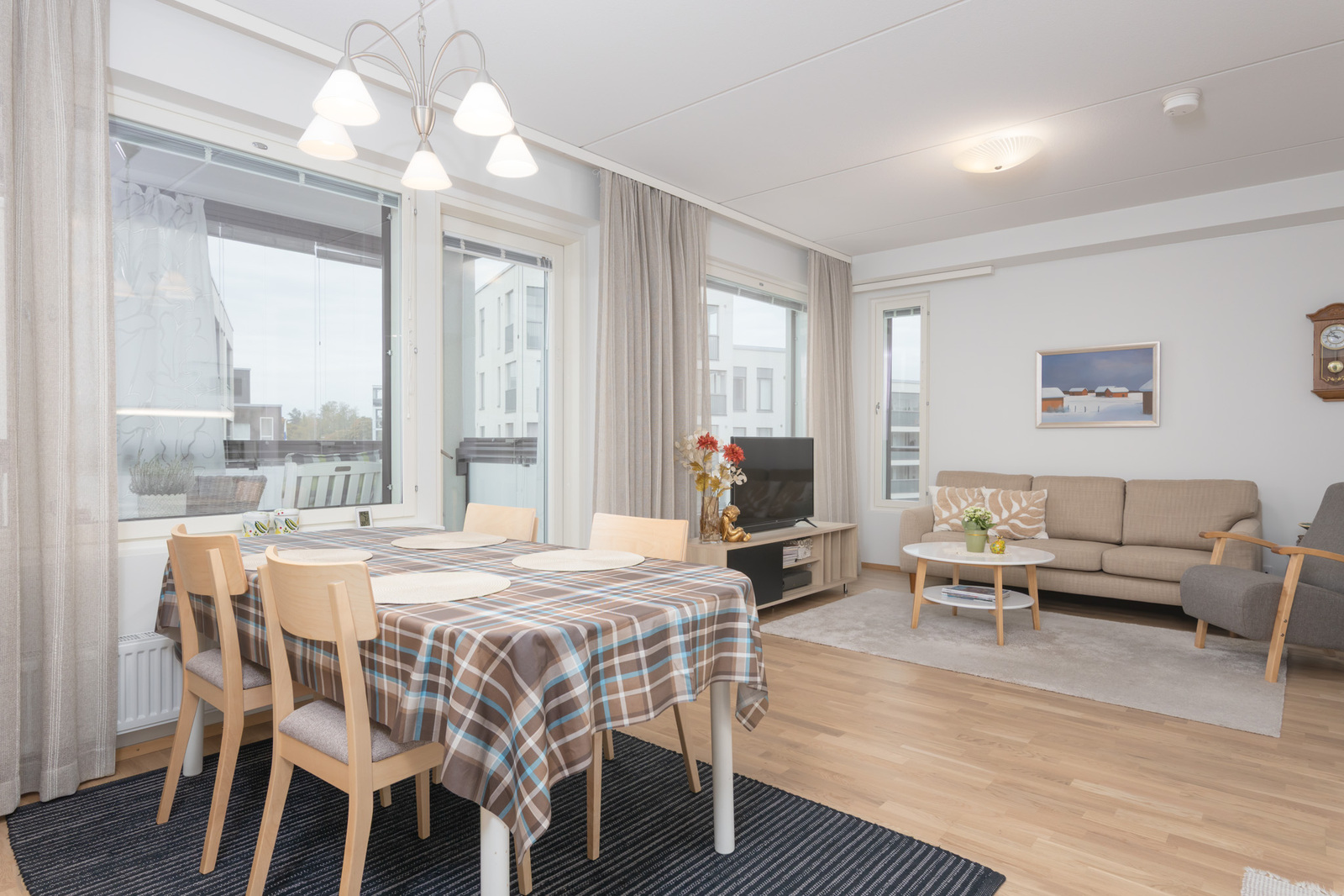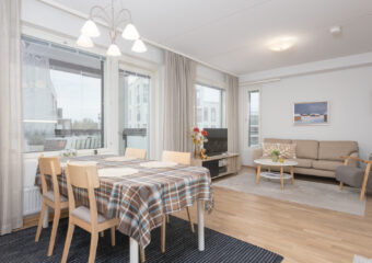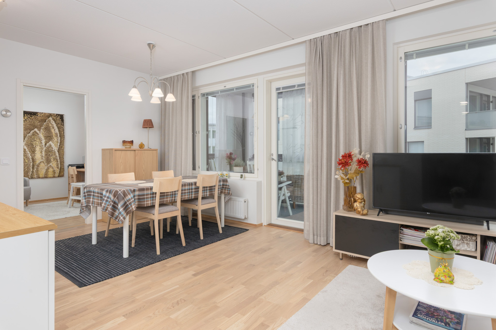 Tämä hissitalon ylimmässä kerroksessa sijaitseva asunto tarjoaa toimivan ja selkeän pohjaratkaisun. Avoin olohuoneen, ruokailutilan ja keittiön yhdistelmä muodostaa asunnon keskipisteen. Huoneistossa on kaksi WC:tä, joista toinen on erillinen ja toinen kylpyhuoneen yhteydessä. Oma sauna tarjoaa arkeen mukavuutta. Tilava, lasitettu parveke tuo lisäneliöitä ympäri vuoden.