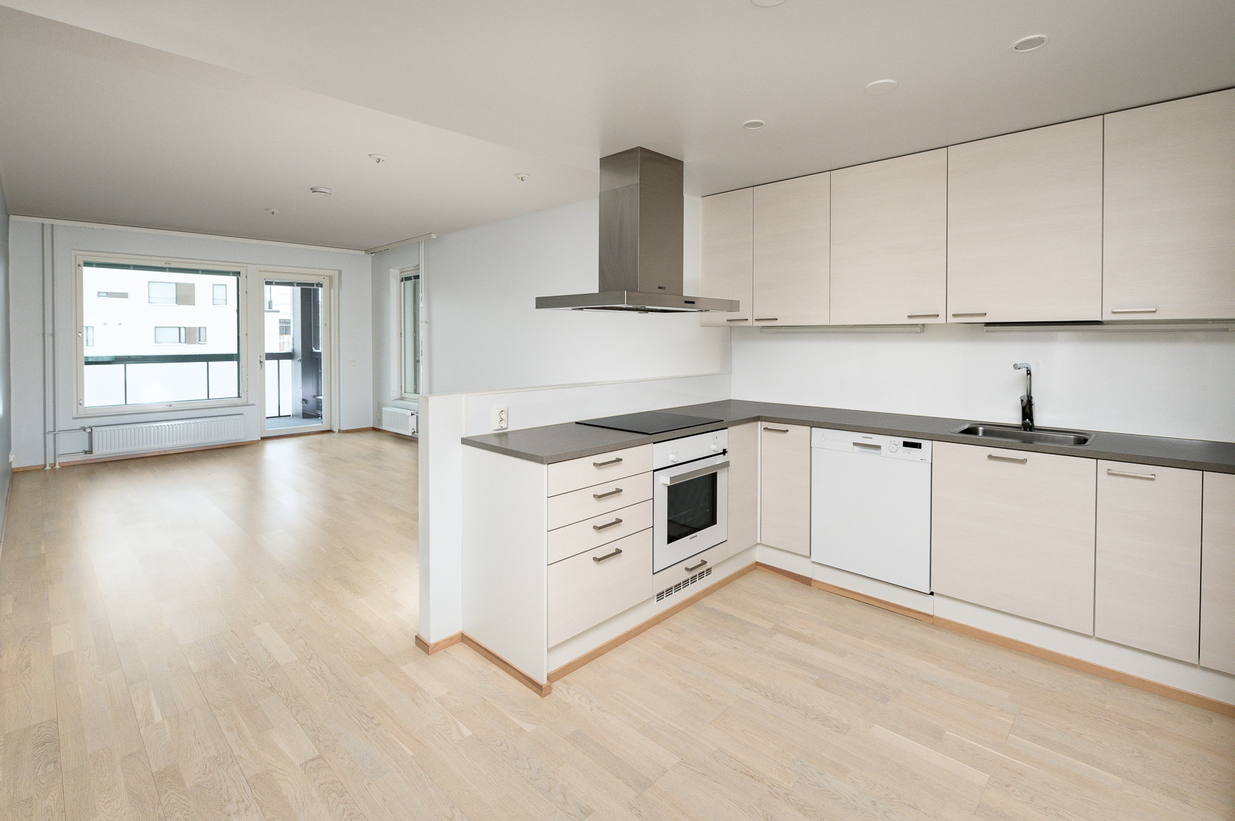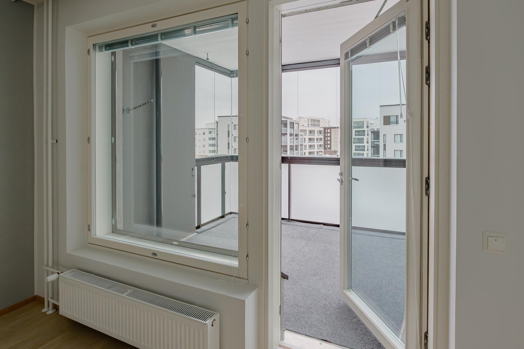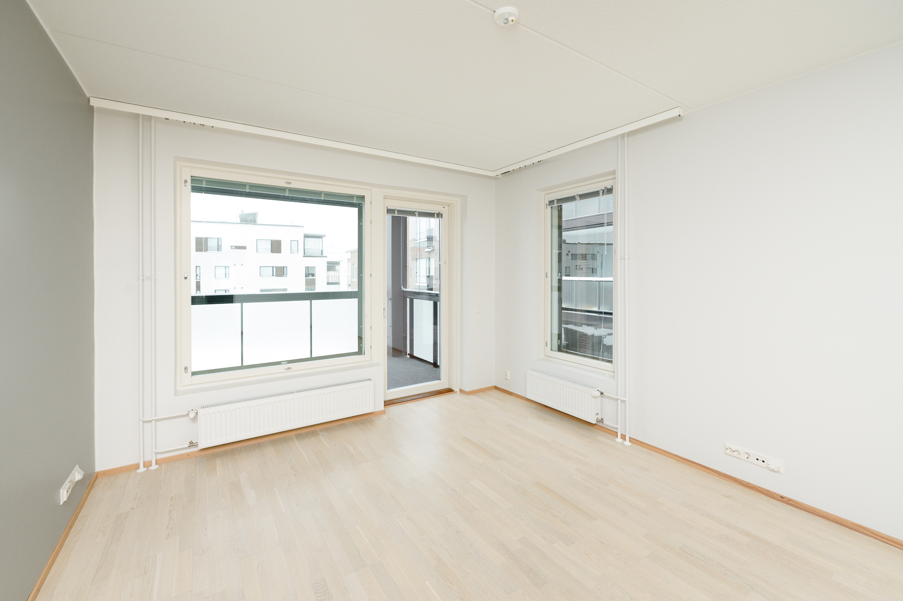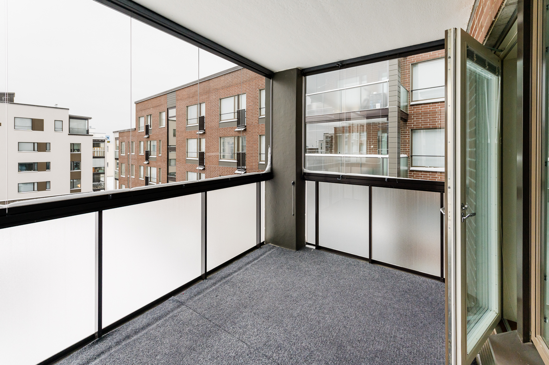 Tämä koti on valoisa ja avara läpitalon päätyhuoneisto, joka sijaitsee neljännessä kerroksessa. Olohuone ja keittiötila on yhtenäistä avointa tilaa, olohuoneesta käynti tilavalle lasitetulle parvekkeelle, parveke sijaitsee taloyhtiön sisäpihan suuntaan.