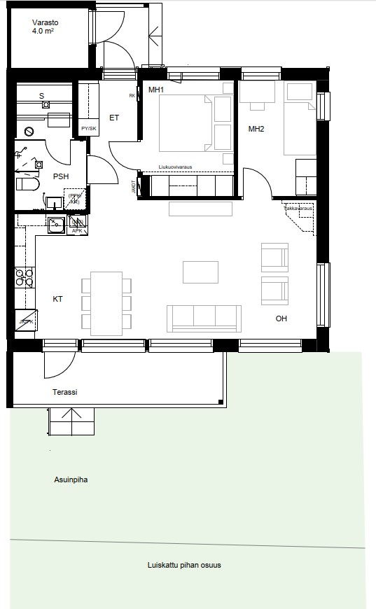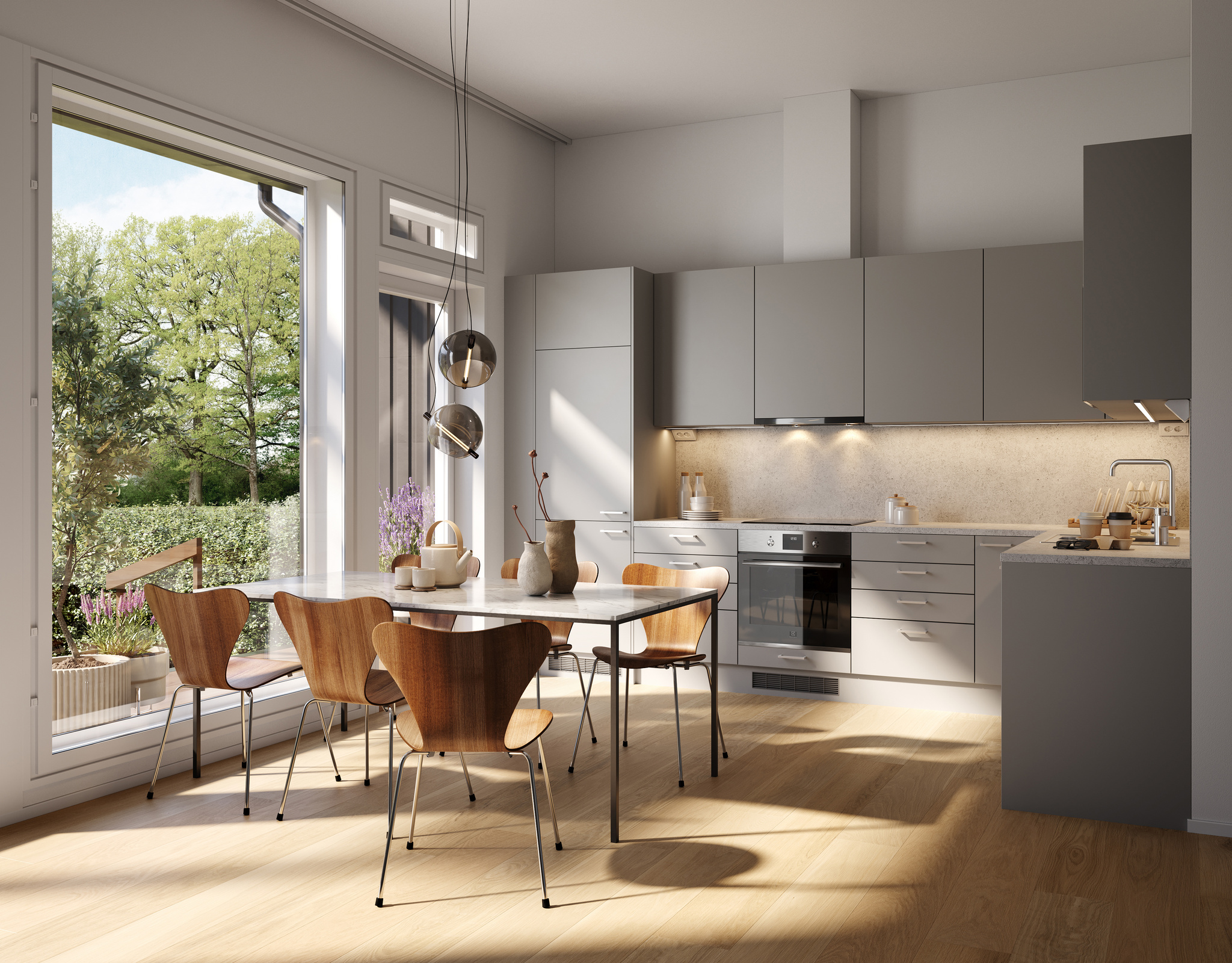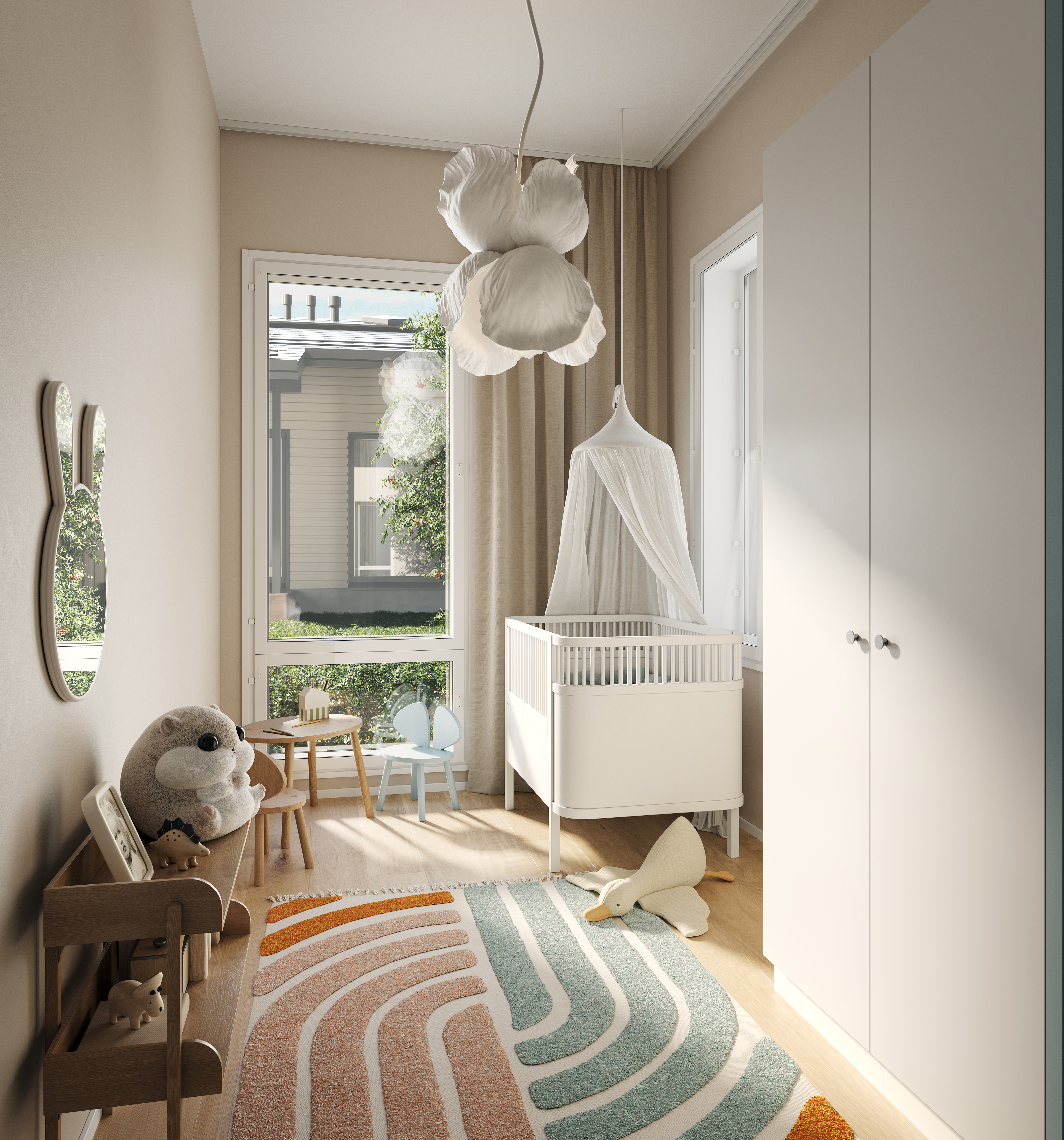 Asunnossa on hulppea 3,2 m huonekorkeus ja lattiasta kattoon ulottuvat ikkunat, jotka tekevät kodista todella valoisan. Kolme makuuhuonetta, avara olohuone-keittiötila sekä oma sauna, jossa rentoutua päivän päätteeksi. Keittiö on hyvin varusteltu, ja kylpyhuoneessa on modernin tyylikäs. Asunnoissa vesikiertoinen lattialämmitys, joka lisää asumismukavuutta.
