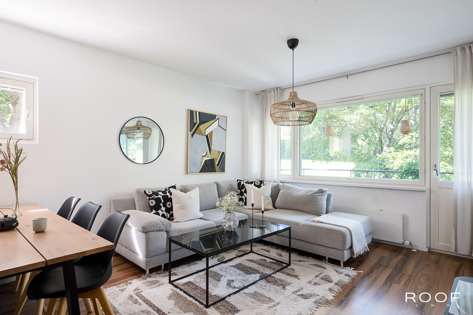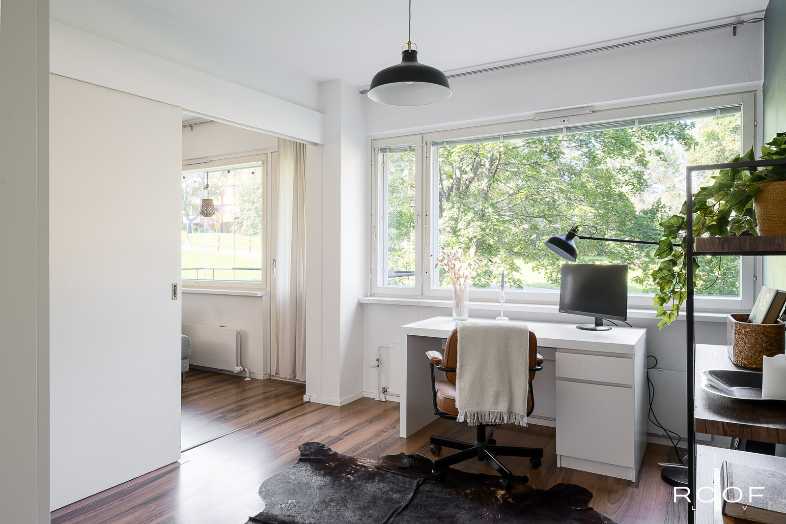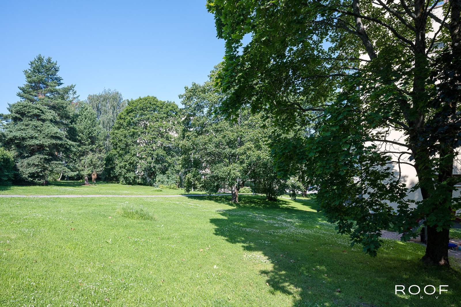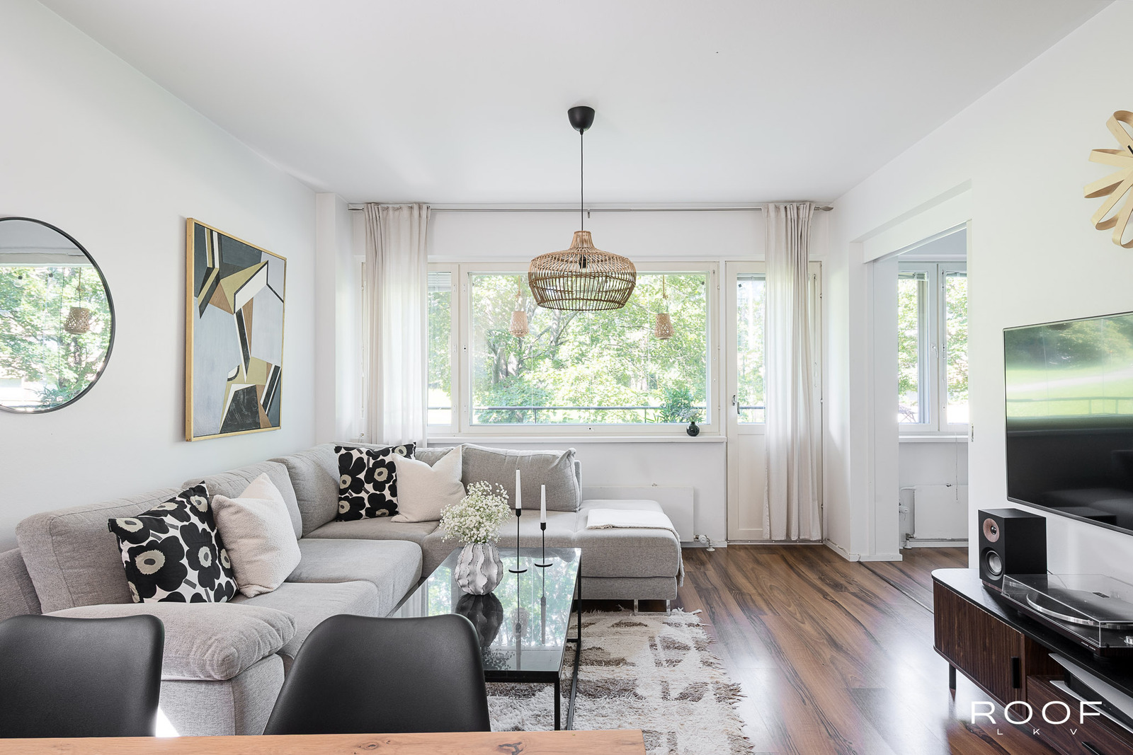 Tämä ensimmäisen kerroksen kolmio on siistikuntoinen ja laadukkailla materiaaleilla varustettu. Kaunis keittiö on remontoitu 2022 linjasaneerauksen yhteydessä, jolloin myös kylpyhuone on uusittu. Asunnossa on kaksi makuuhuonetta, joista toisen yhteydessä on vaatehuone lisäsäilytystilaa tuomassa. Kompaktiin kylpyhuoneeseen mahtuu pesukone. Keittiö ja olohuone ovat yhtenäistä avointa tilaa, josta avautuu puistomainen näkymä.