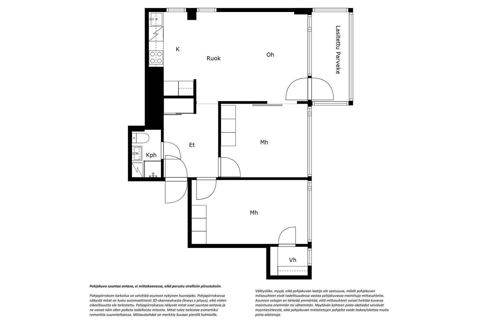 kerrostalo, 3h+avk+kph+eteinen+vh+lasitettu parveke