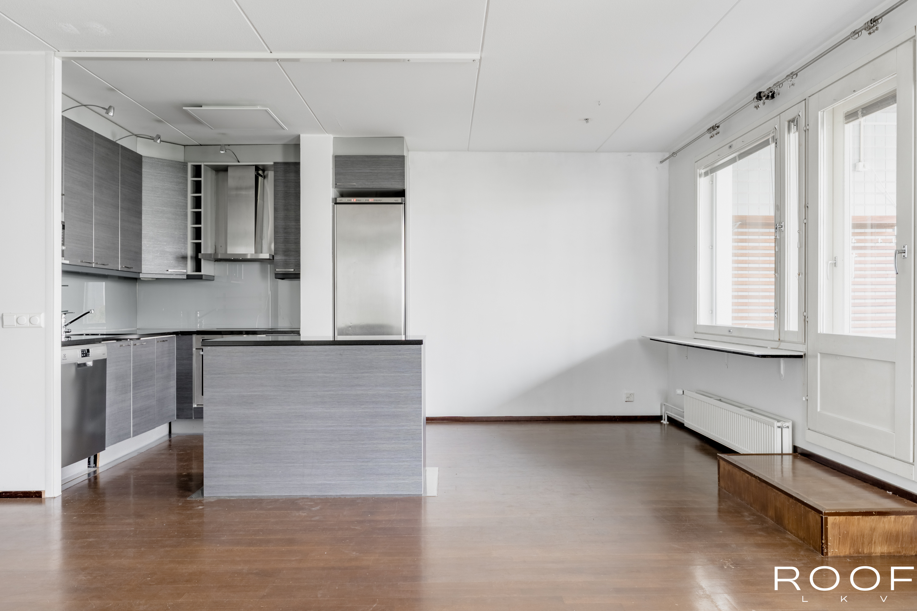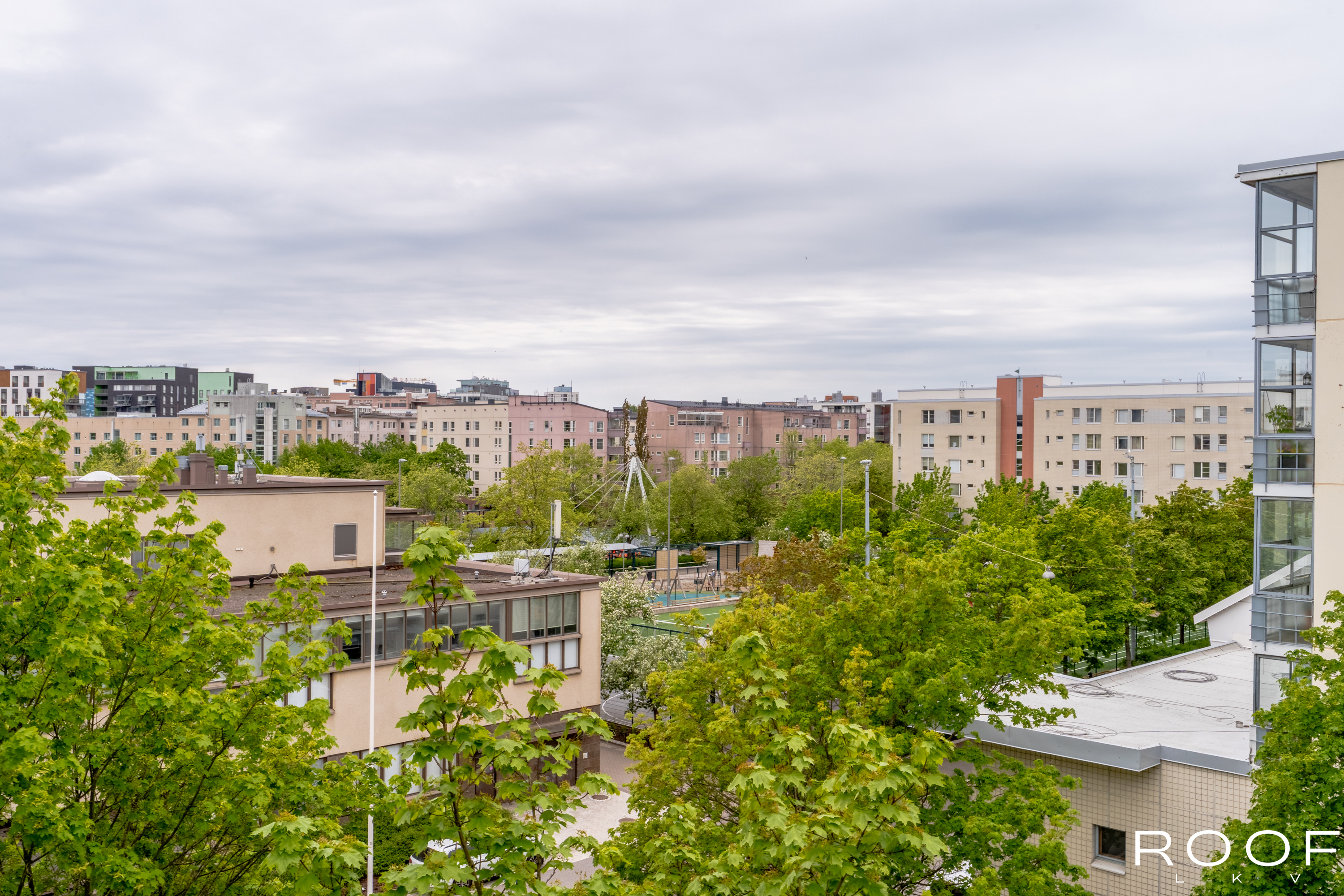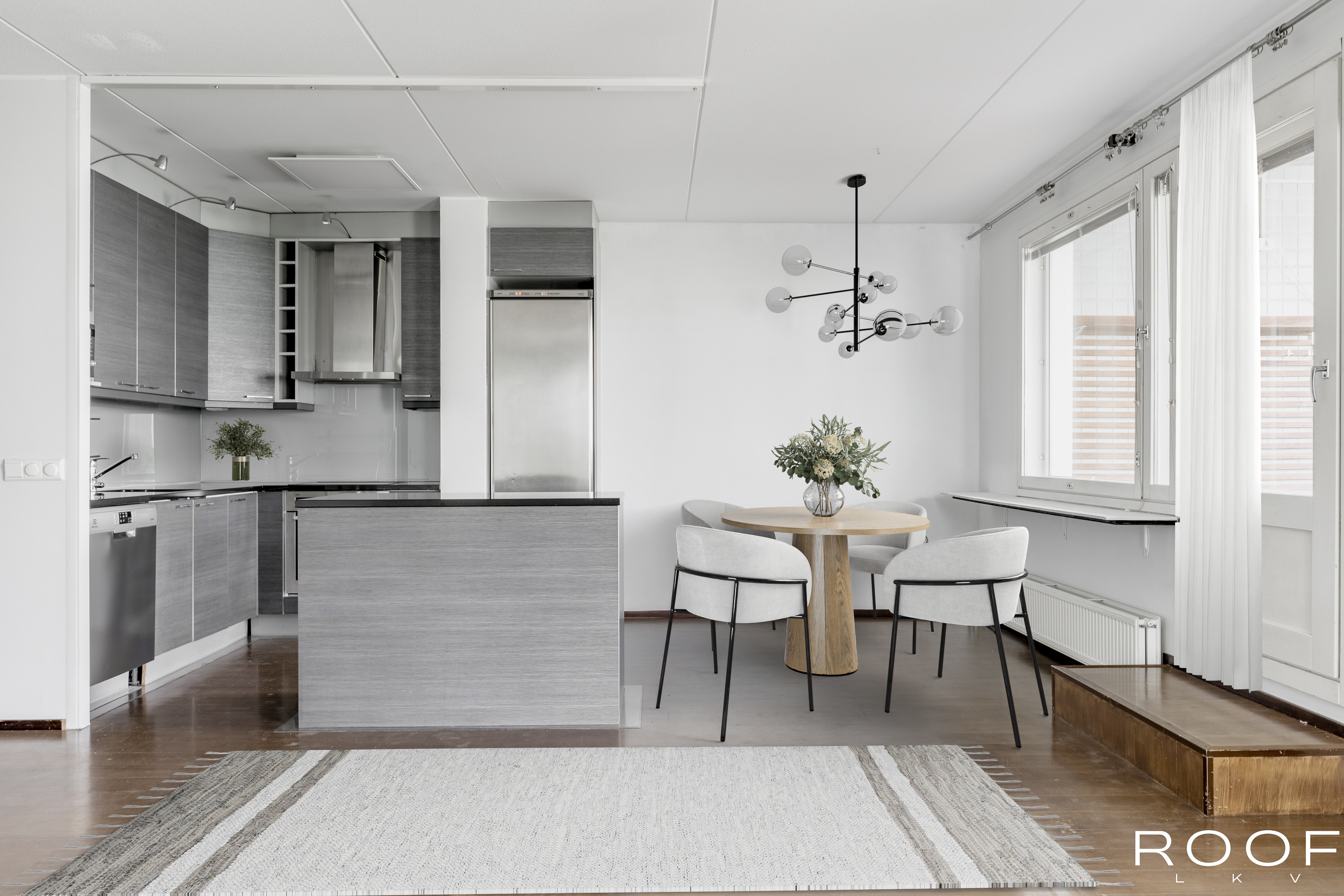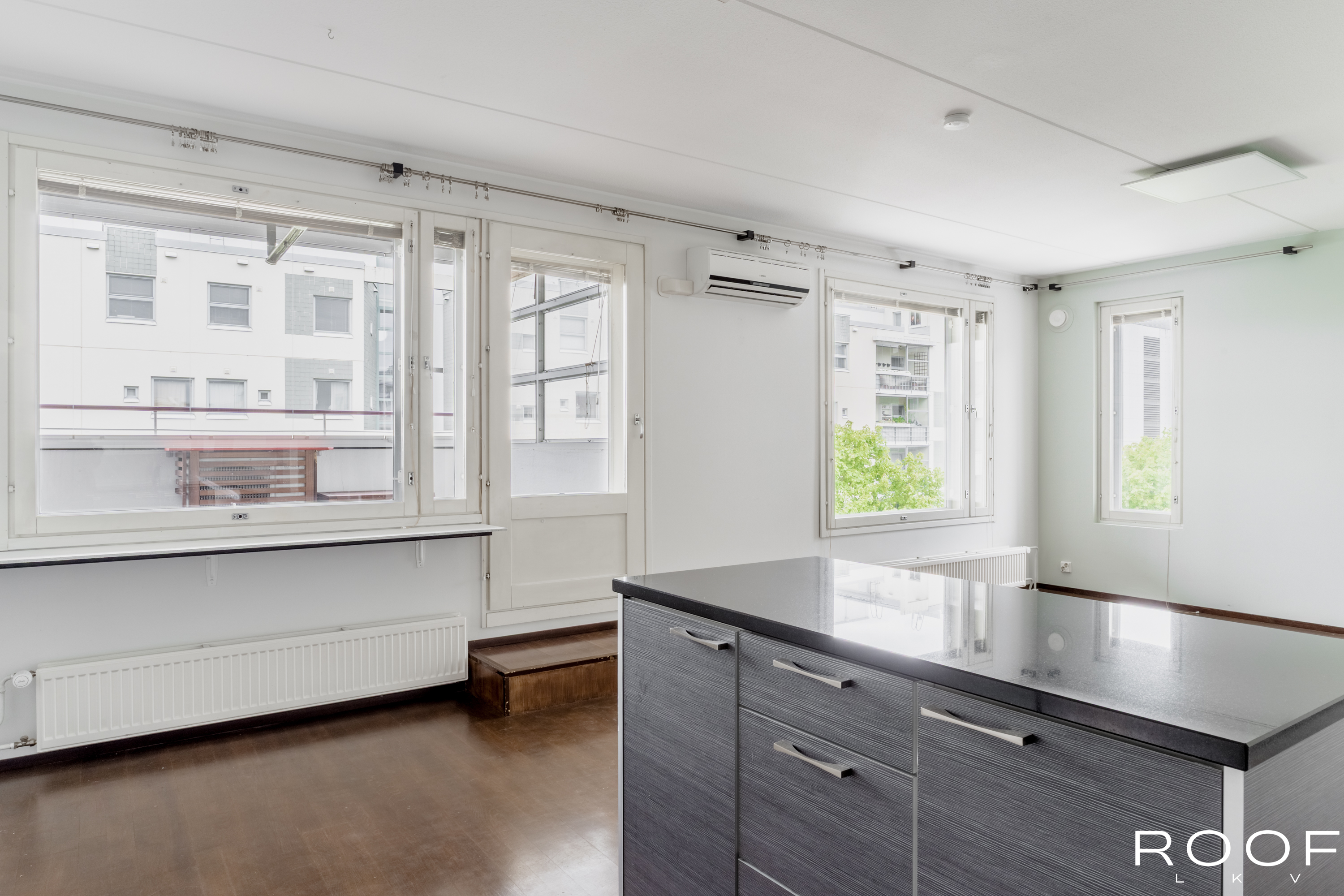 Kodin ehdottomana keskipisteenä toimii valoisa- ja avara keittiön-, ruokailutilan- sekä olohuoneen yhtenäinen tila jonka kruunaa lasitettu länteen avautuva parveke. Lasitetulla parvekkeella kelpaa kesällä nauttia aamupalasta ja samalla täältä voit ihastella vehreitä maisemia, jotka avautuvat aina Ruoholahdenkanavalle asti! Ruokailutilaan mahtuu isompikin ruokailuryhmä ja olohuoneessa on tilaa myös suuremmalle sohvalle, jossa kelpaa päivän päätteeksi rentoutua. Kesähelteillä asumisviihtyvyyden kruunaa ilmalämpöpumppu.