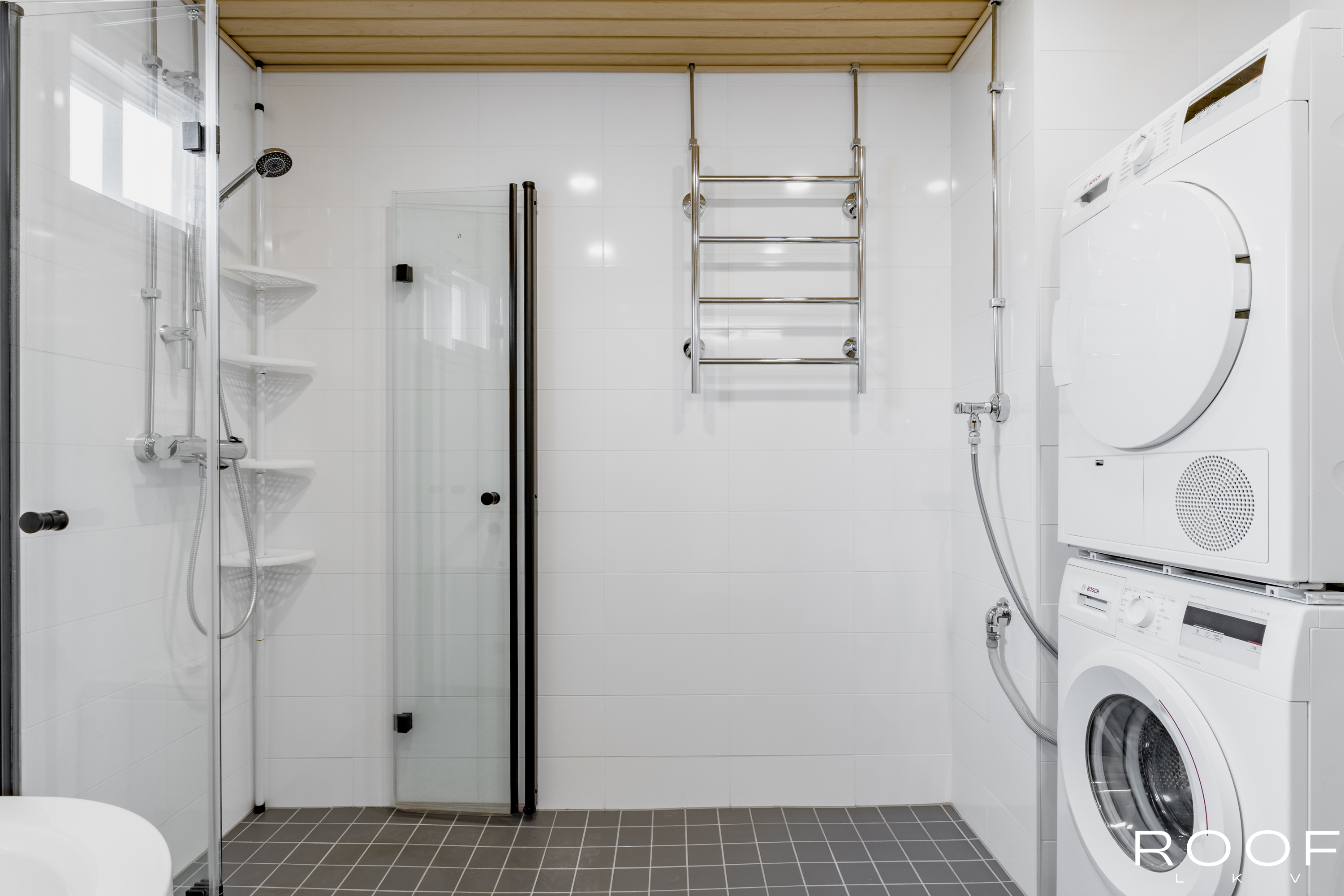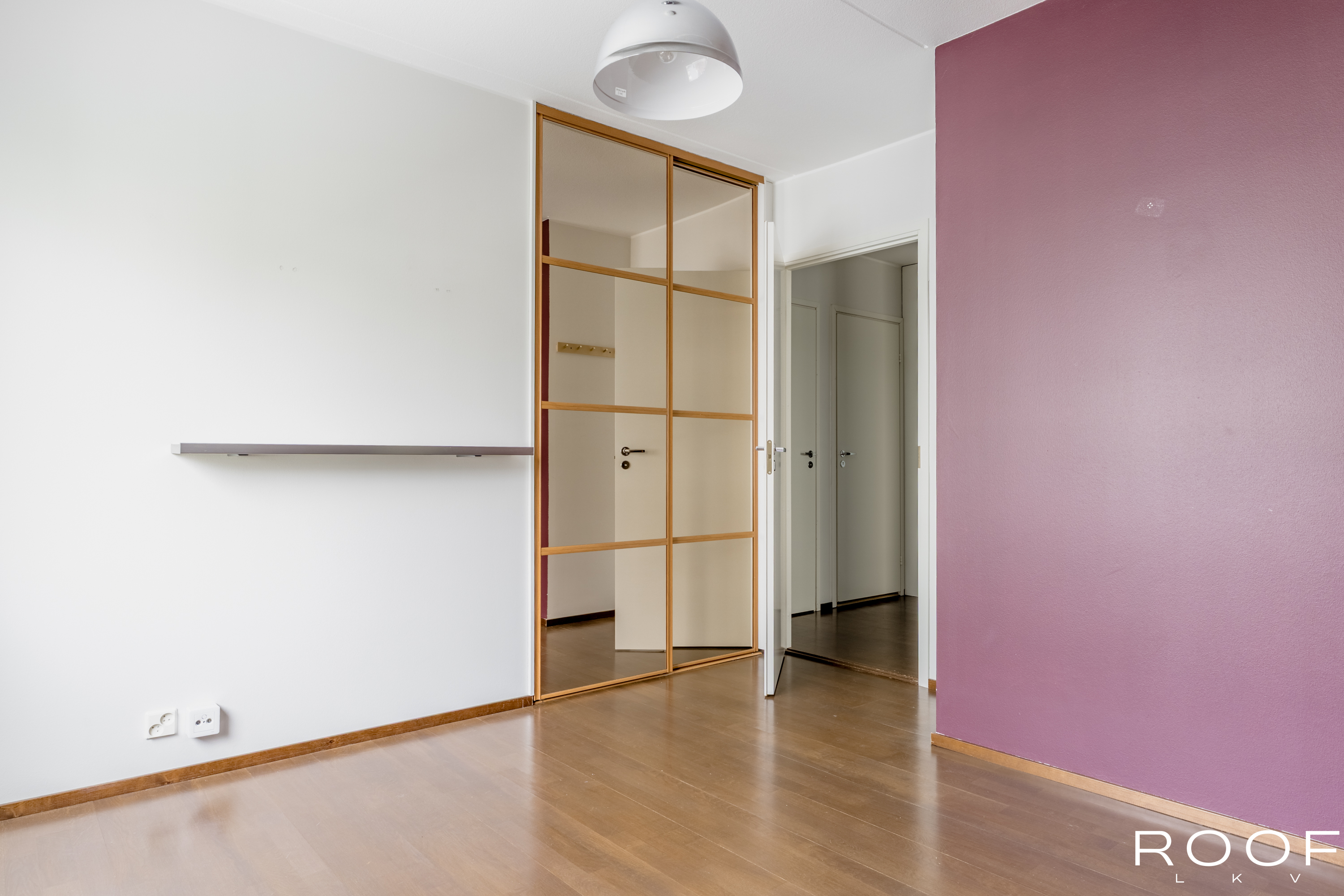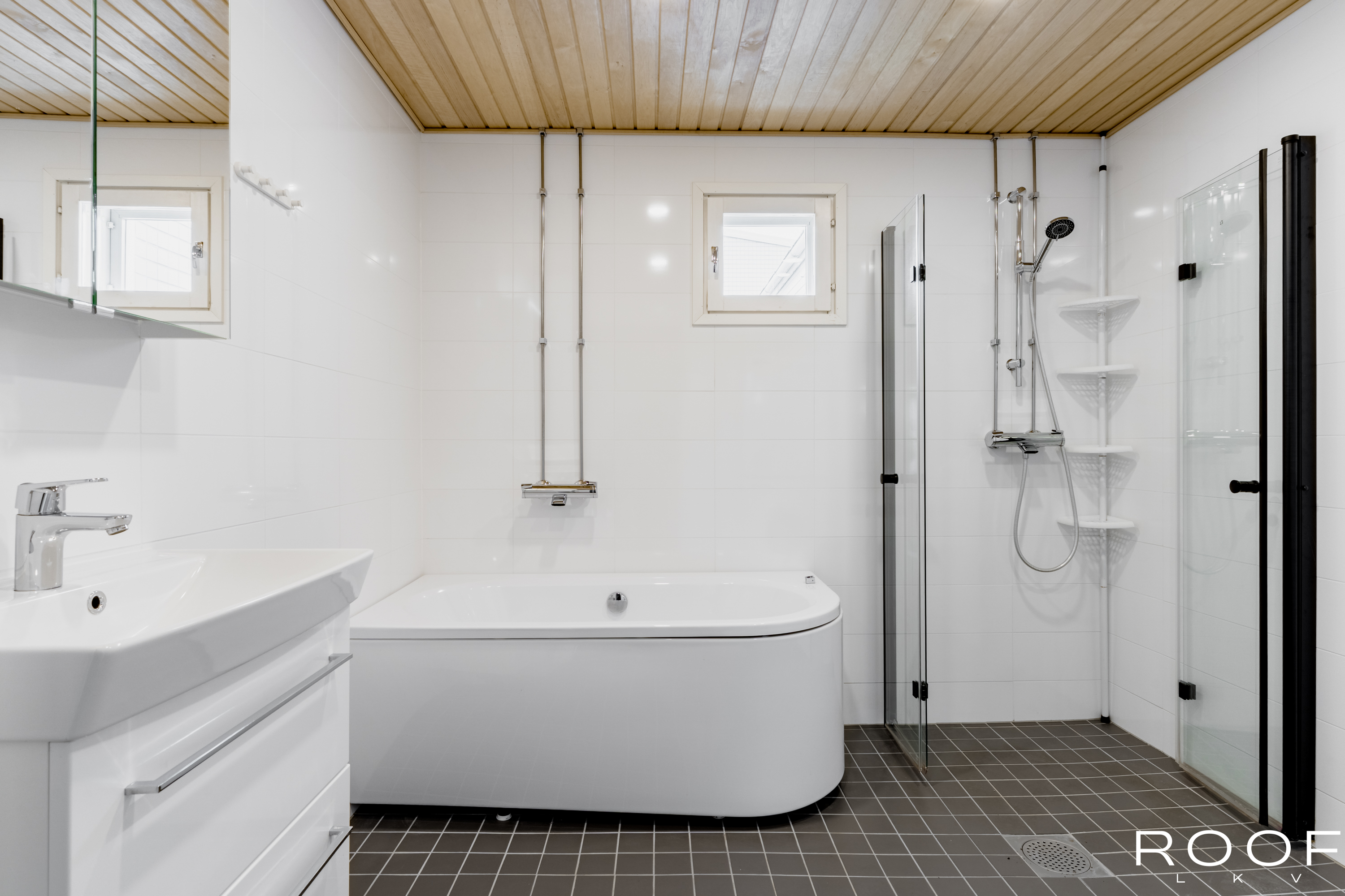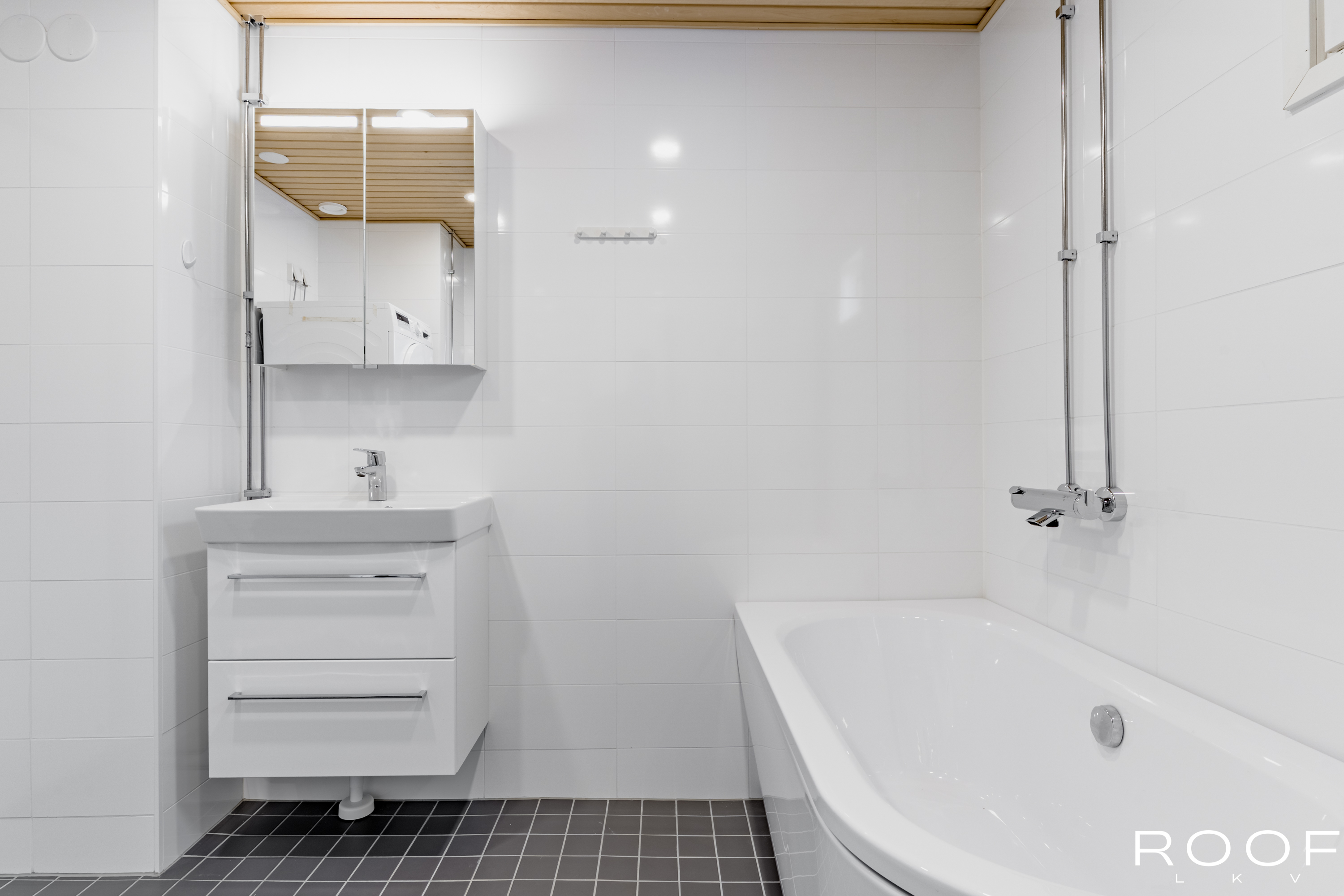 Kummatkin makuuhuoneista ovat sisäpihan suuntaan. Reilunkokoisessa vuonna 2023 uusitussa kylpyhuoneessa sinulla on mahdollisuus rentoutua kylvyn merkeissä ja pyykkihuollolle on myös reilusti tilaa. Erillinen wc helpottaa arjen toimivuutta.