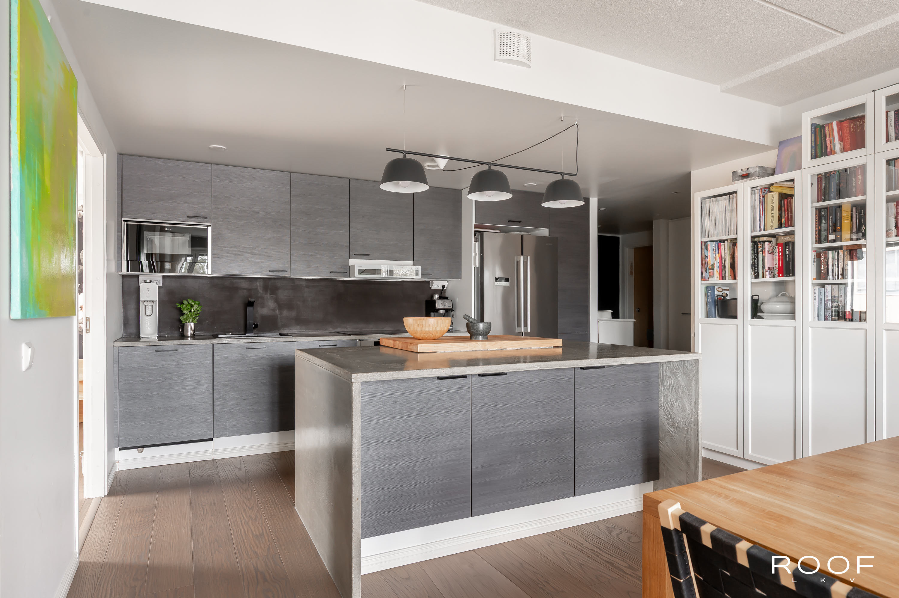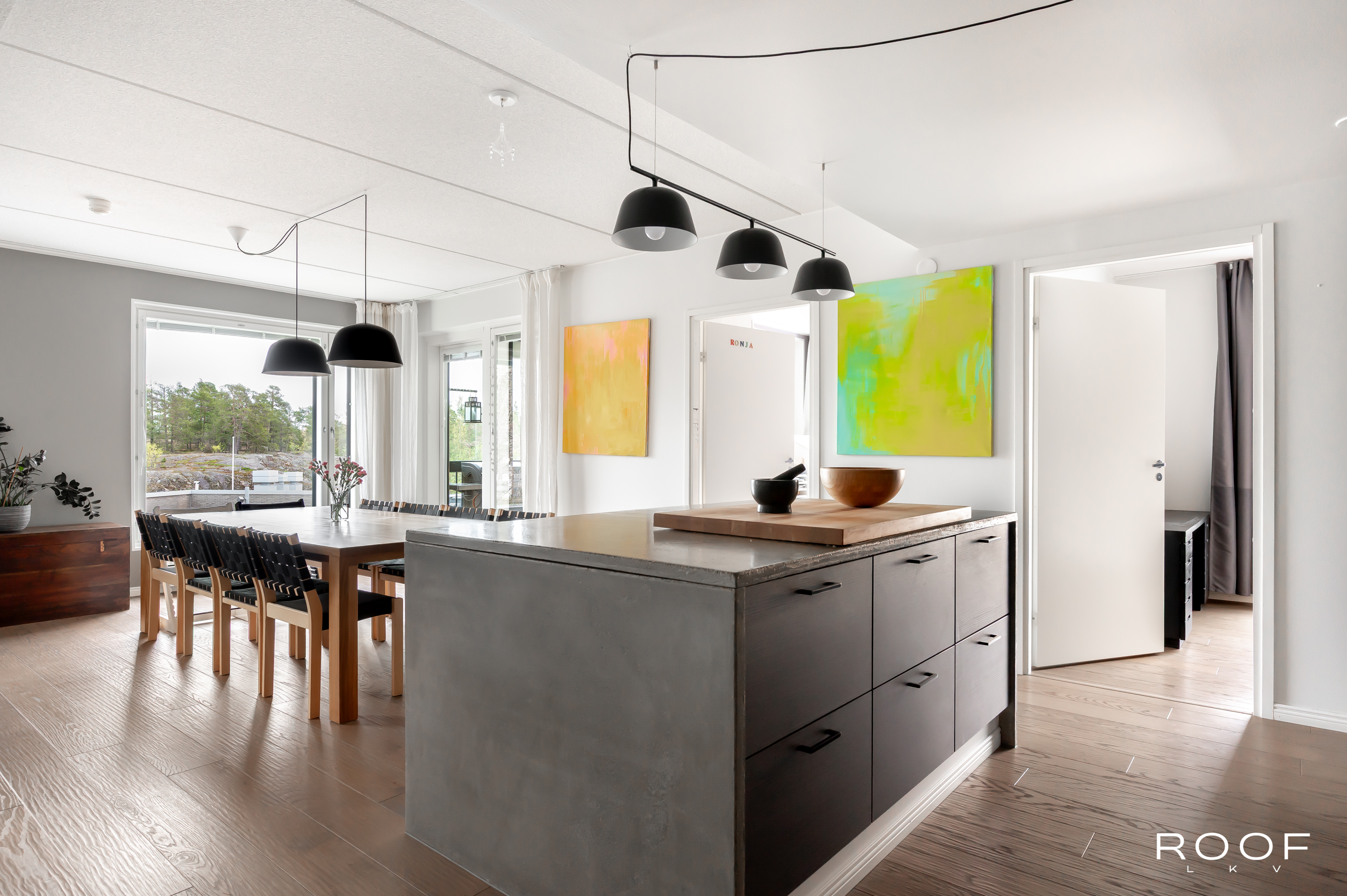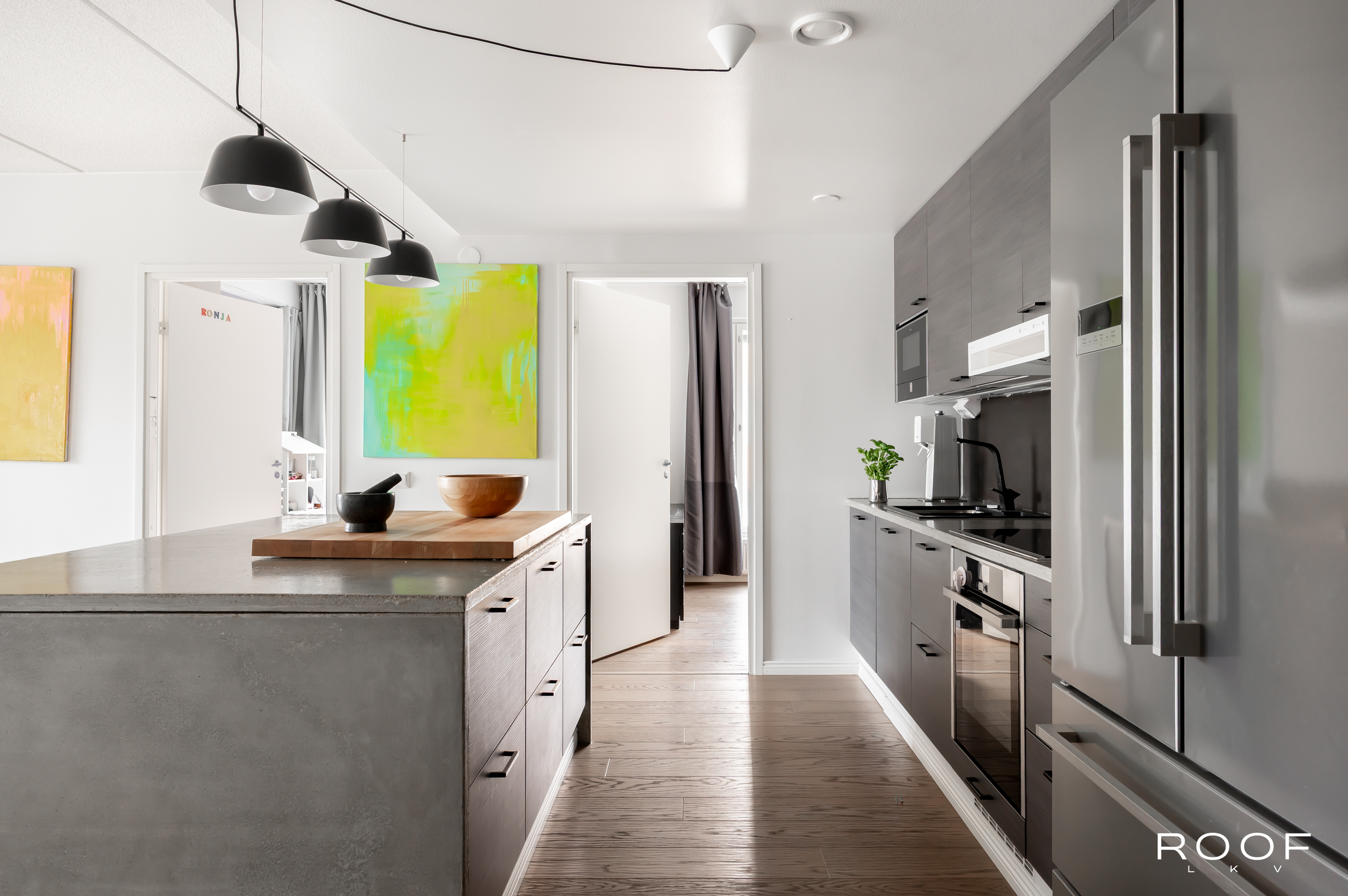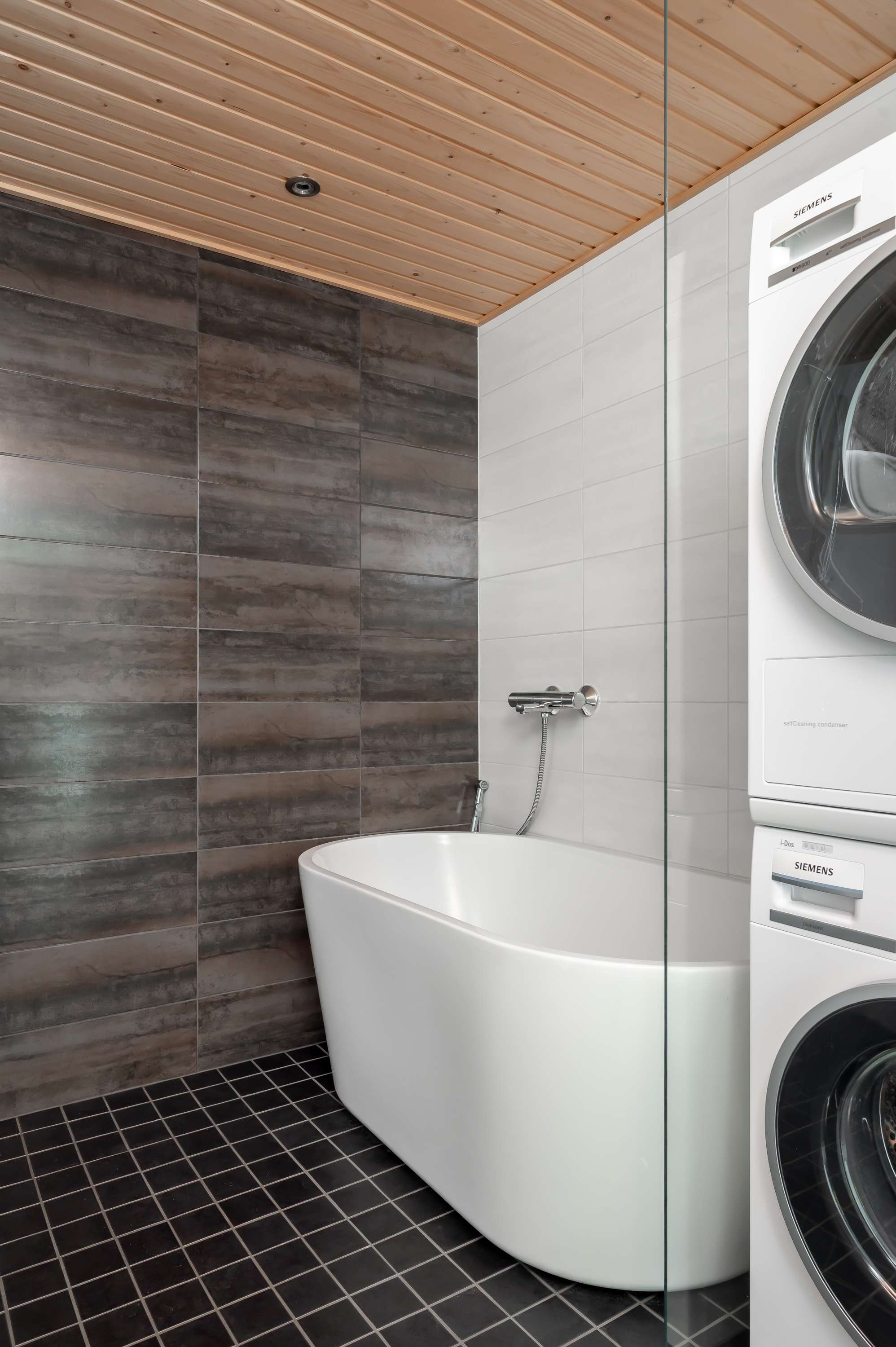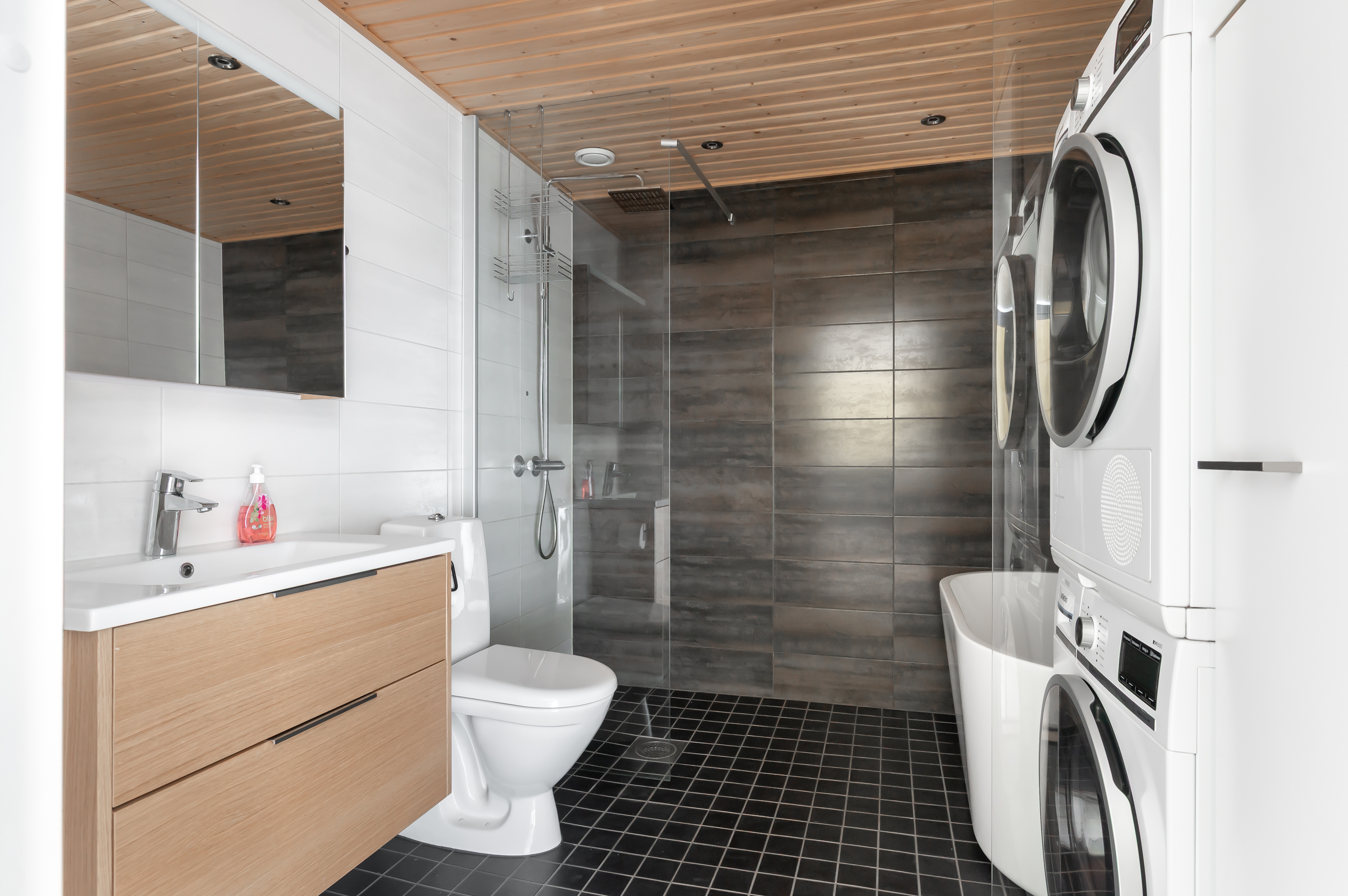 Tyylikkäässä avokeittiössä ovat side-by-side jääkaappipakastin, kalustepeitteinen astianpesukone, höyryuuni ja tilaava saareke. Pesutiloissa on säädettävä mukavuuslattialämmitys.