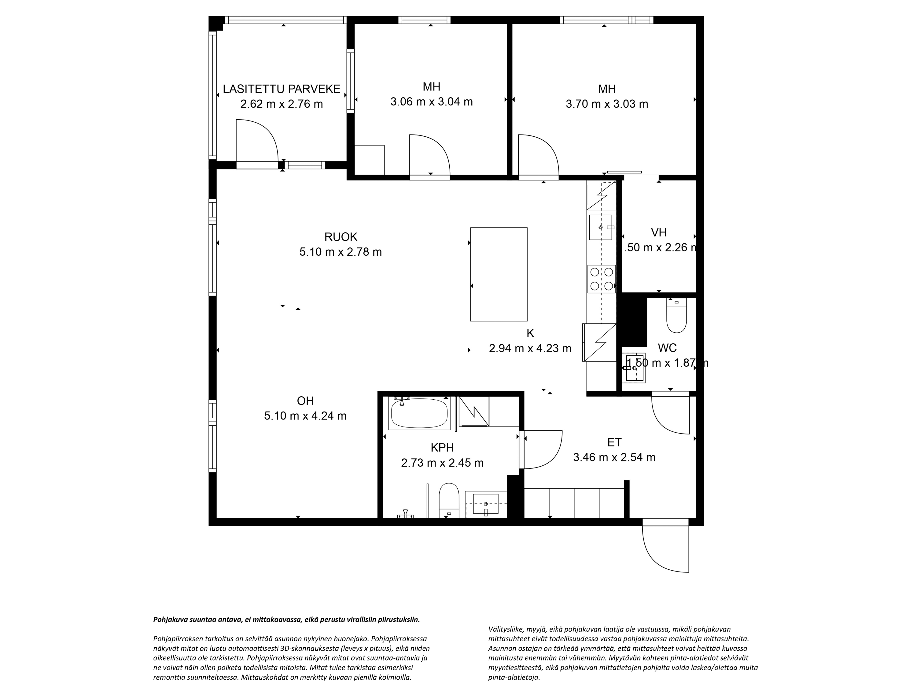 kerrostalo, 3h,avokeittiö, kph, eril.wc, vaatehuone, lasitettu parveke