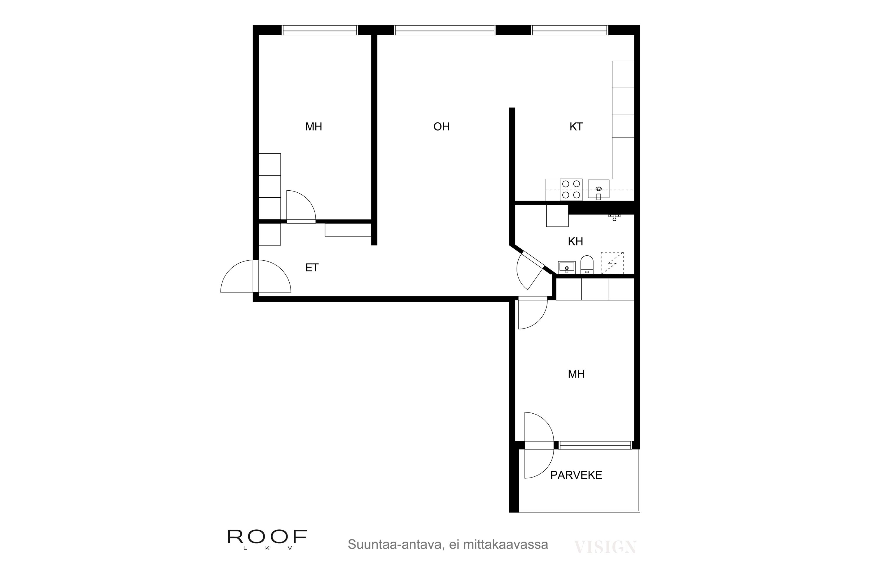 Asunnossa on kaksi makuuhuonetta, tilava olohuone sekä keittiö, jossa on modernit kodinkoneet, kuten induktioliesi ja astianpesukone. Kylpyhuone on remontoitu linjasaneerauksen yhteydessä vuonna 2017, ja siellä on kaikki tarvittava arjen sujuvuuteen. Lasitettu länsiparveke tarjoaa rauhallisen paikan rentoutumiseen.