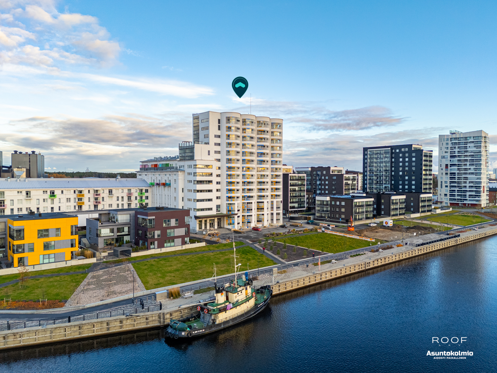 Yksi kahdesta hissistä vie sinut nopeasti perille 8 kerrokseen, jossa odottaa todella siististi asuttu, korkein huonein varustettu huoneisto. Kunnollinen, laattalattioin toteutettu eteinen toivottaa tervetulleeksi, täällä ei astuta suoraan keittiöön tai olohuoneeseen sisäänkäynnistä. Yksityiskohtia tästä asunnosta ei puutu; kaksi kylpyhuonetta, komeat betonikatot sekä todella valoisat tilat. Säilytystiloja on toteutettu runsaasti, mm. vaatehuone ja kaapistot. Tilavaan keittiöön on asennettu kaksi jääkaappipakastinta ja kodinkoneita on myös päivitetty vastikään.