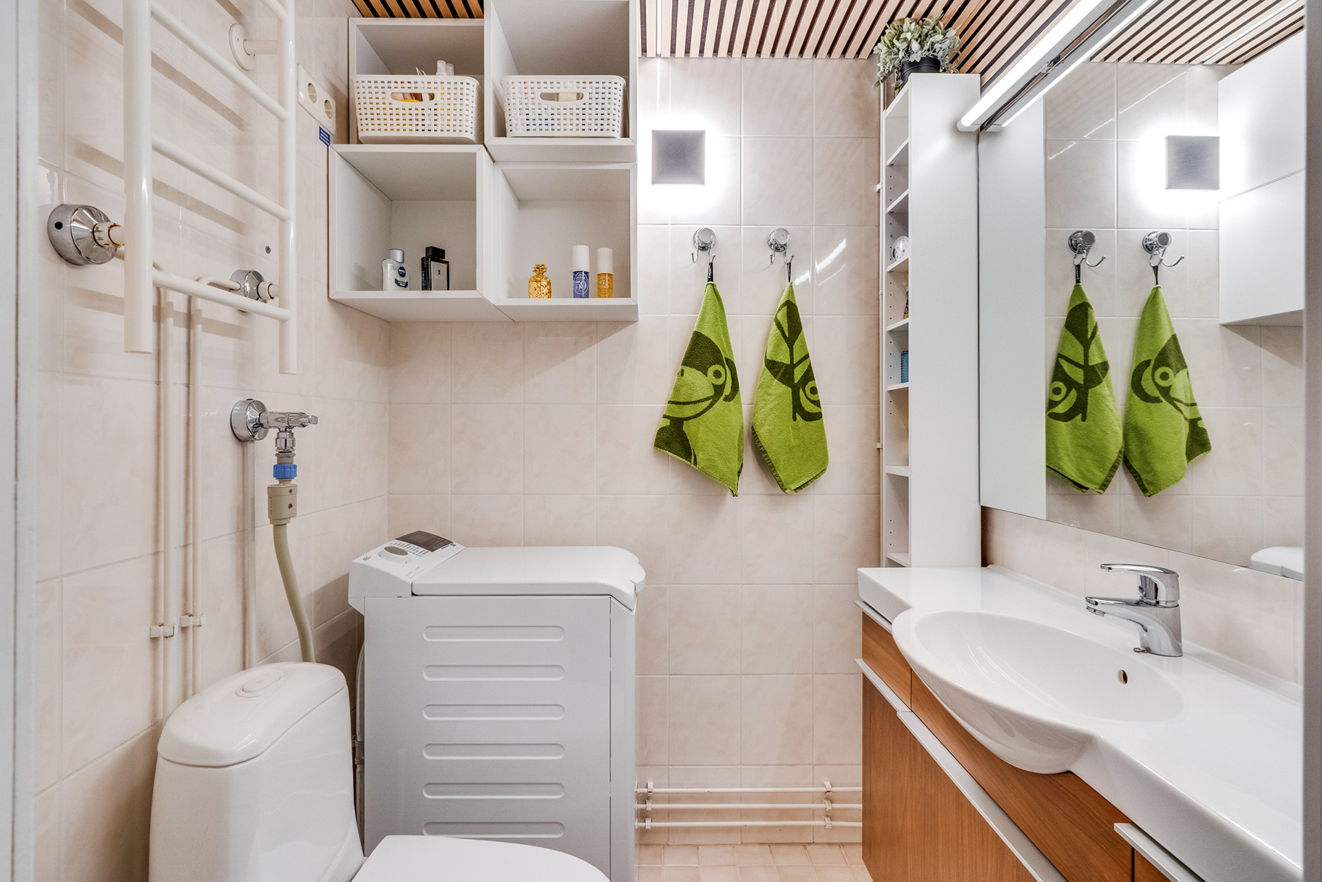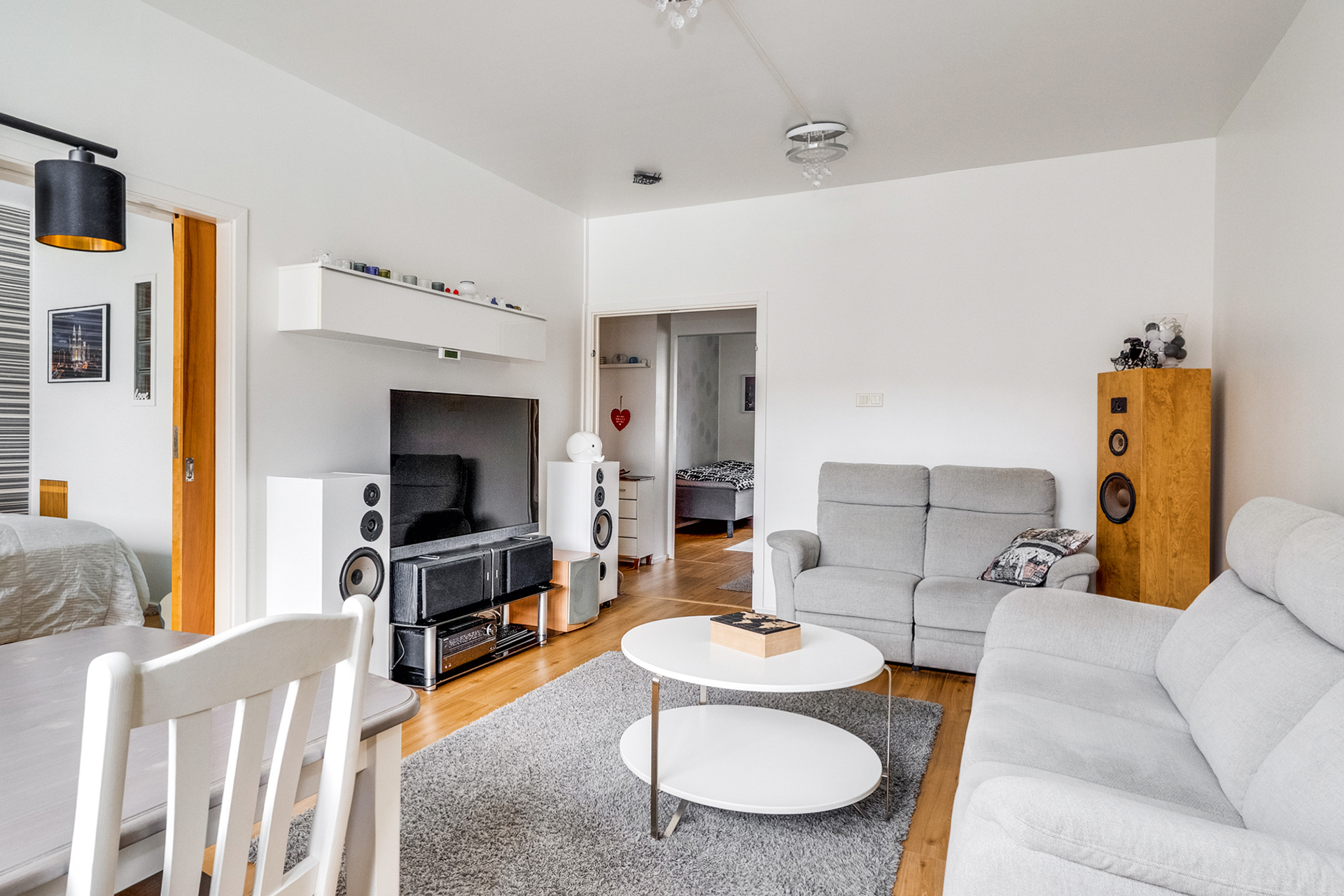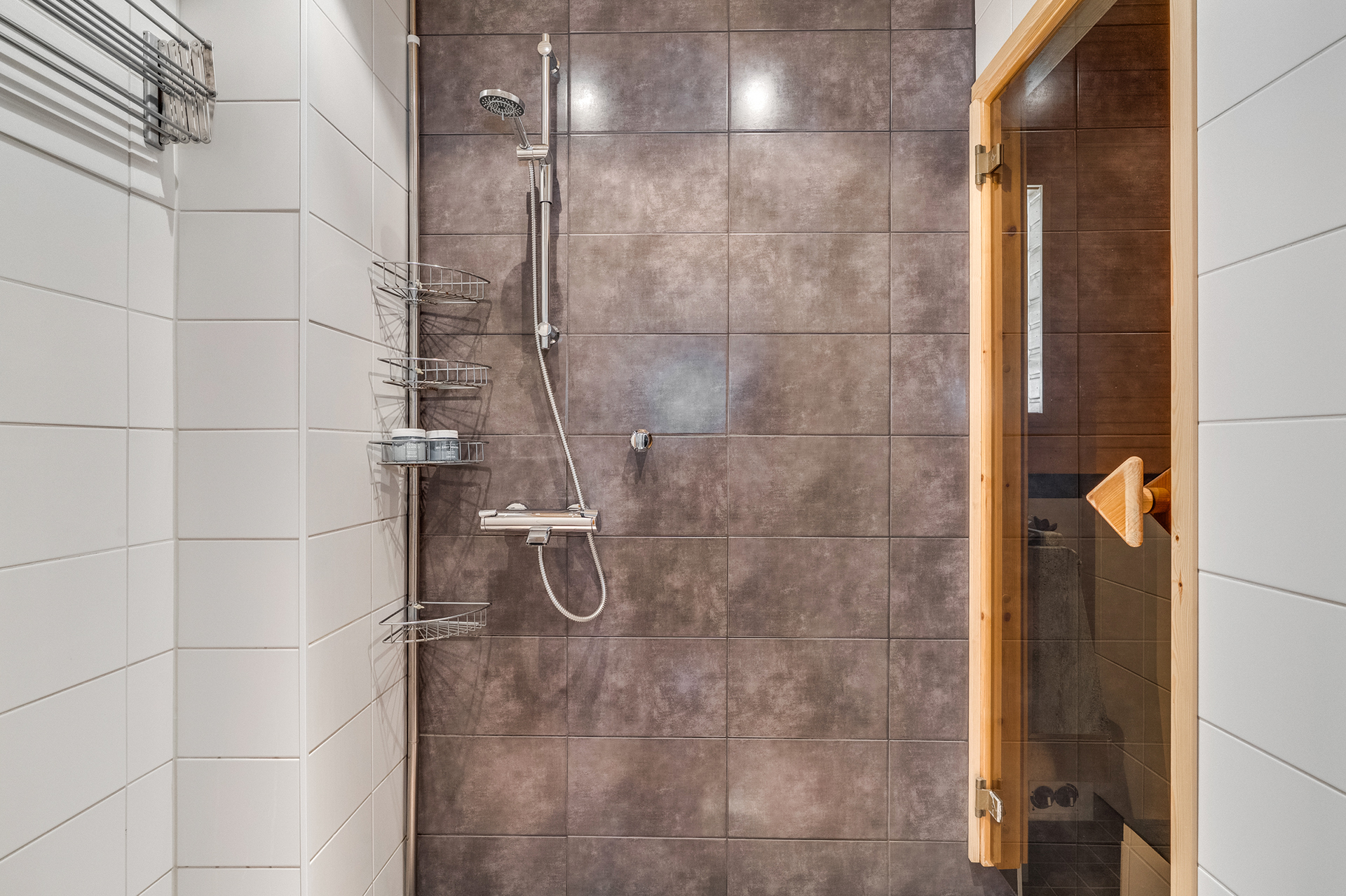 Asunnon tilat ovat hyväkuntoisia. Keittiö on varustettu nykyaikaisilla kodinkoneilla, kuten induktioliedellä ja pyrolyysiuunilla viinikaappia unohtamatta. Keittiön, olohuoneen ja makuuhuoneiden lattiat ovat vinyyliä, mikä tuo tiloihin lämpimän ja modernin ilmeen. Kylpyhuoneessa ja erillisessä WC:ssä on laattalattiat lattialämmityksellä, ja saunassa voi rentoutua sähkökiukaan lämmössä.