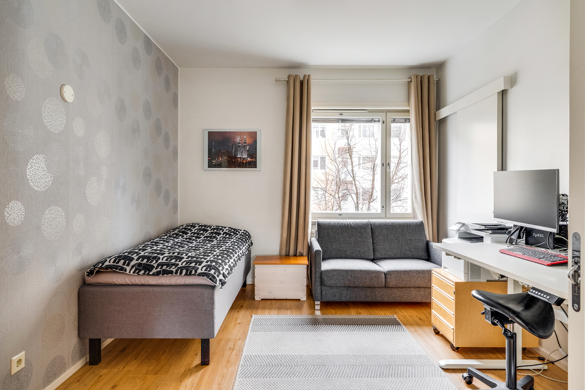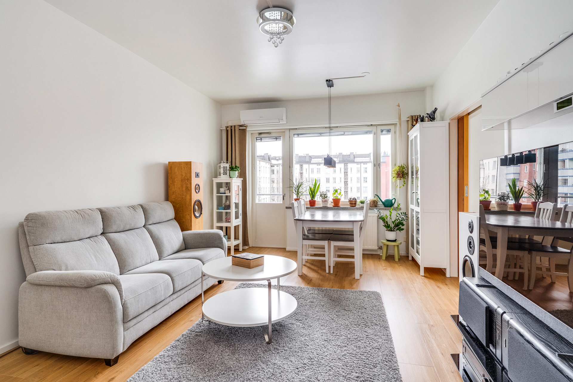 Parveke avautuu etelään, tarjoten mukavan paikan nauttia auringosta. Ilmalämpöpumppu pitää kuitenkin asunnon tarvittaessa viileänä.