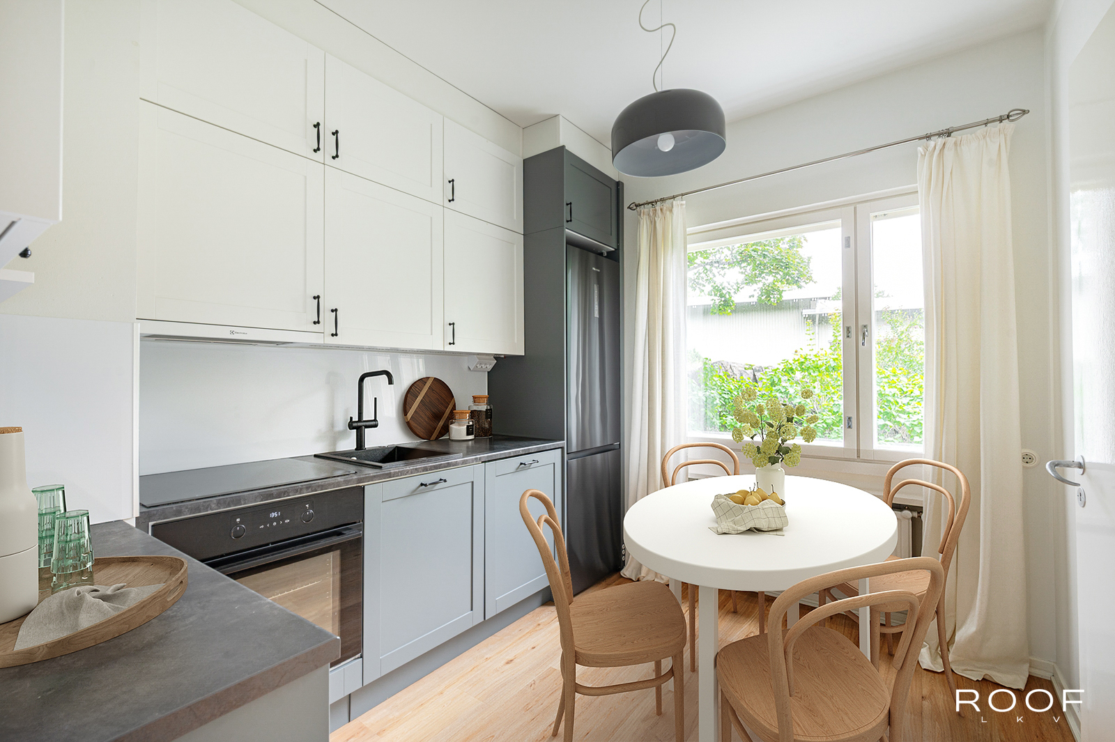 Valoisa olohuone tarjoaa hyvin tilaa sekä oleskeluun että ruokaryhmälle. Ikkunallinen keittiö saa luonnetta vanhoista kaapistoista ja kylpyhuone on uusittu perinteisen putkiremontin yhteydessä — tilaa on myös pyykinpesukoneelle. Asunnossa on kaunis lakattu puulattia, pois lukien kylpyhuone, mikä luo asuntoon lämpimän ja yhtenäisen ilmeen.