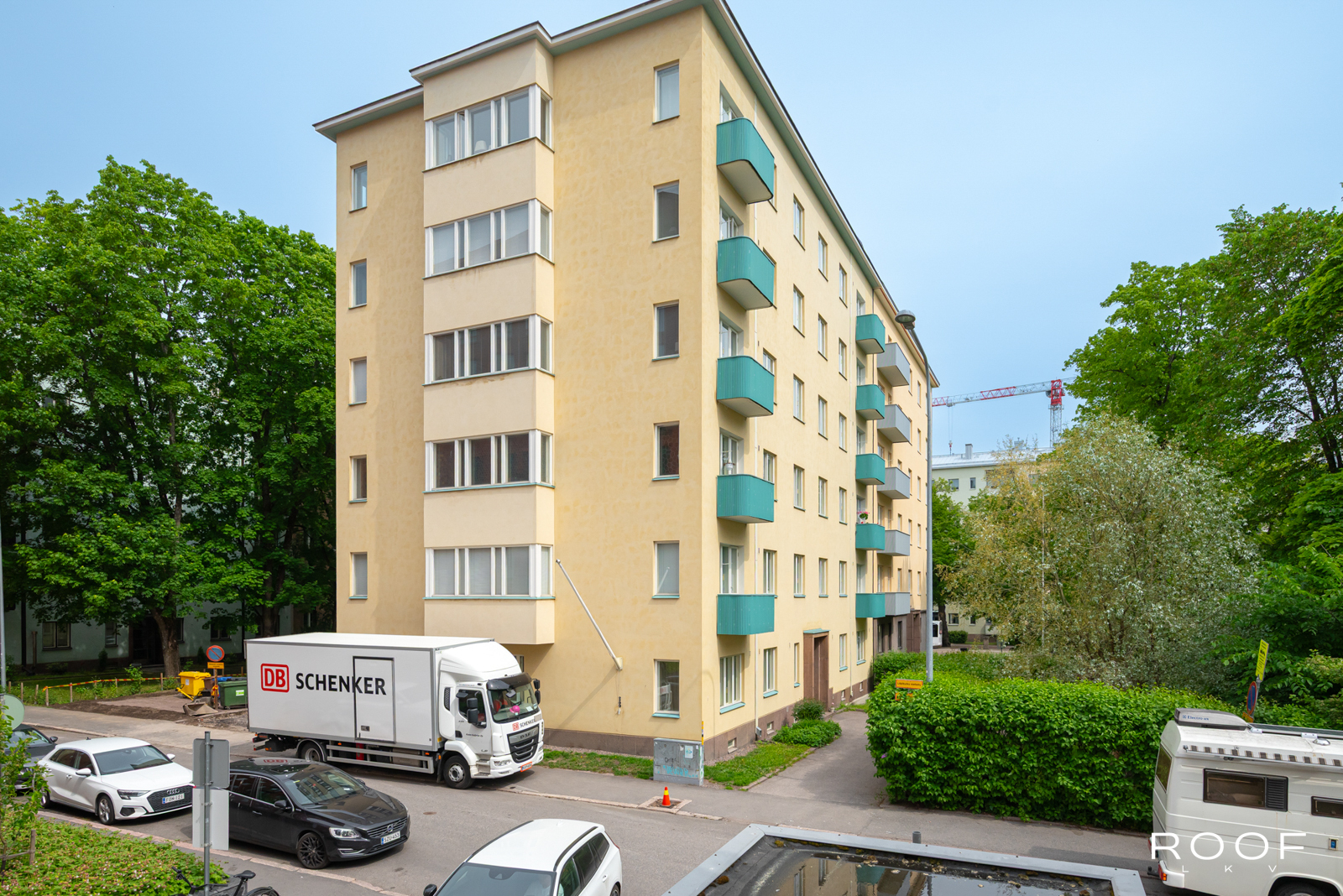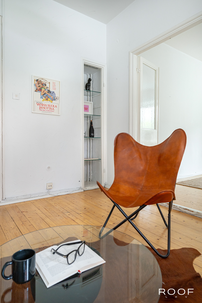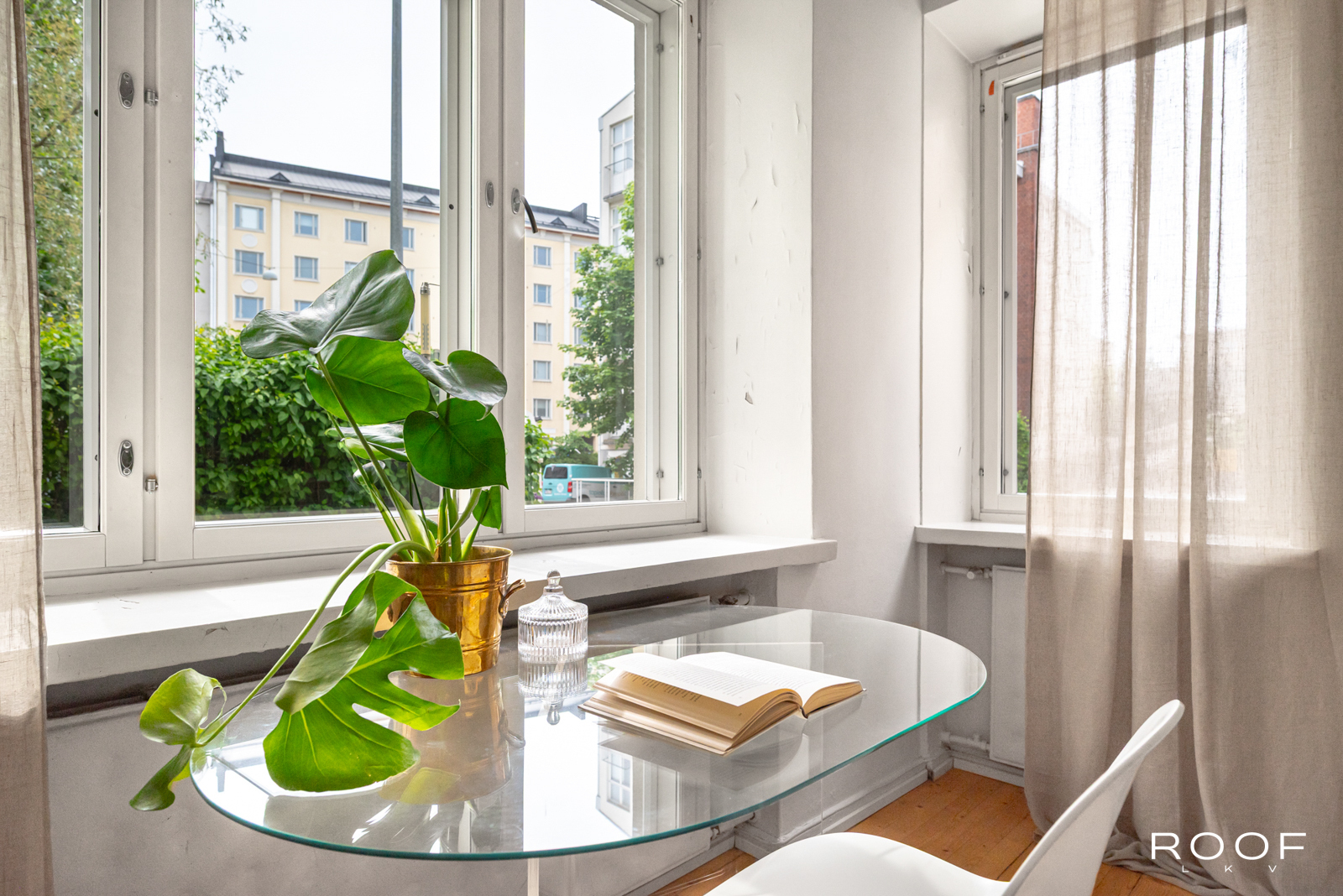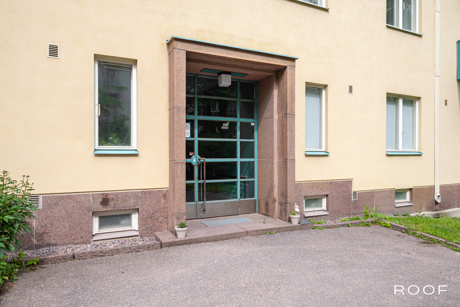 Tämä persoonallinen läpitalon kolmio sijaitsee 1930-luvun kivitalossa. Asunto pitää sisällään toimivan pohjaratkaisun ja pohjaratkaisu soveltuu hyvin esimerkiksi kimppakämppäläisille, perheelle tai pariskunnalle. Asunnossa on erillinen keittiö, jossa on runsaasti kaappi- ja laskutilaa sekä astianpesukone valmiiksi asukkaan käyttöön. Keittiössä on tilaa myös ruokailuryhmälle. Asunnon olohuone sijoittuu makuuhuoneiden väliin tarjoten huoneisiin omaa rauhaa. Kaksi makuuhuonetta ovat kumpikin hyvänkokoisia ja niissä on kaapistot säilytystilaa varten. Kylpyhuone on laatoitettu ja siellä oleva pyykinpesukone voi jäädä asukkaan käyttöön. Neutraali värimaailma antaa oivan pohjan sisustukselle ja muun muassa kaunis lautalattia ja ovet tuovat tilaan vanhan kivitalon tunnelmaa.