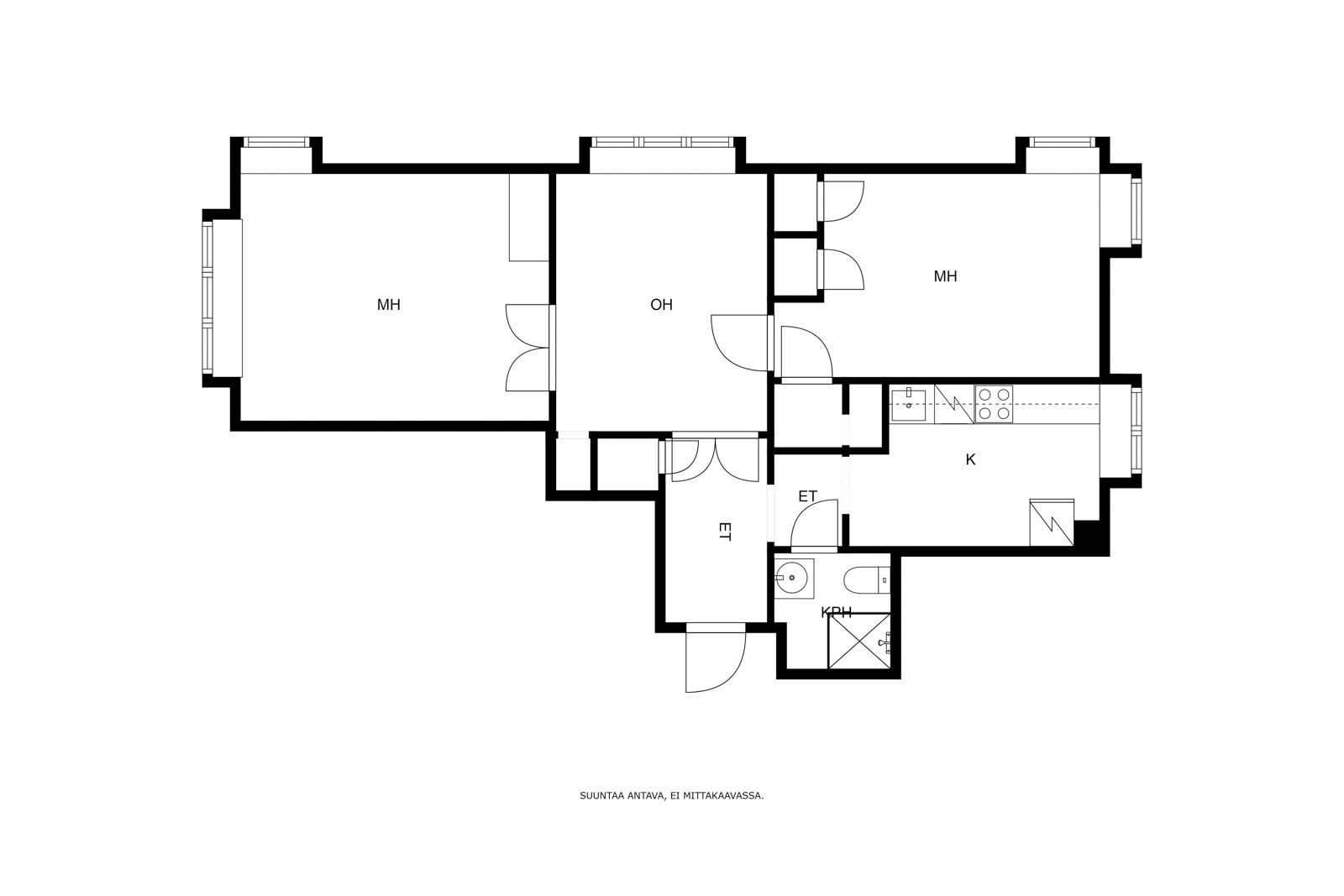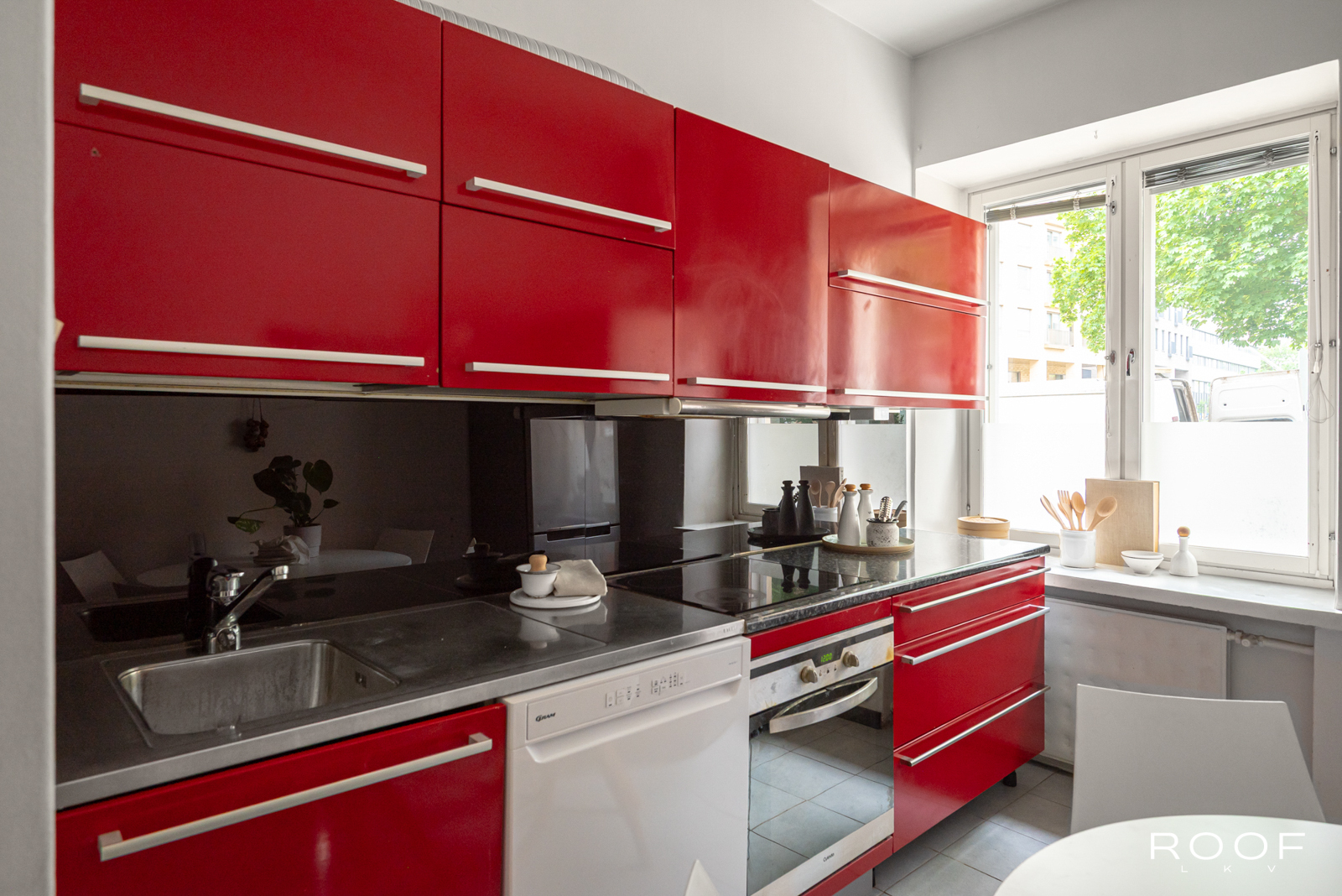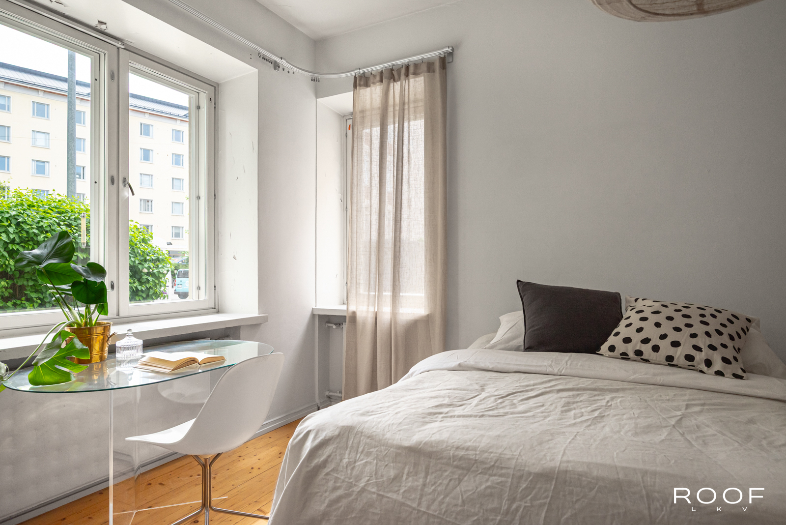 Tämä persoonallinen läpitalon kolmio sijaitsee 1930-luvun kivitalossa. Asunto pitää sisällään toimivan pohjaratkaisun ja pohjaratkaisu soveltuu hyvin esimerkiksi kimppakämppäläisille, perheelle tai pariskunnalle. Asunnossa on erillinen keittiö, jossa on runsaasti kaappi- ja laskutilaa sekä astianpesukone valmiiksi asukkaan käyttöön. Keittiössä on tilaa myös ruokailuryhmälle. Asunnon olohuone sijoittuu makuuhuoneiden väliin tarjoten huoneisiin omaa rauhaa. Kaksi makuuhuonetta ovat kumpikin hyvänkokoisia ja niissä on kaapistot säilytystilaa varten. Kylpyhuone on laatoitettu ja siellä oleva pyykinpesukone voi jäädä asukkaan käyttöön. Neutraali värimaailma antaa oivan pohjan sisustukselle ja muun muassa kaunis lautalattia ja ovet tuovat tilaan vanhan kivitalon tunnelmaa.