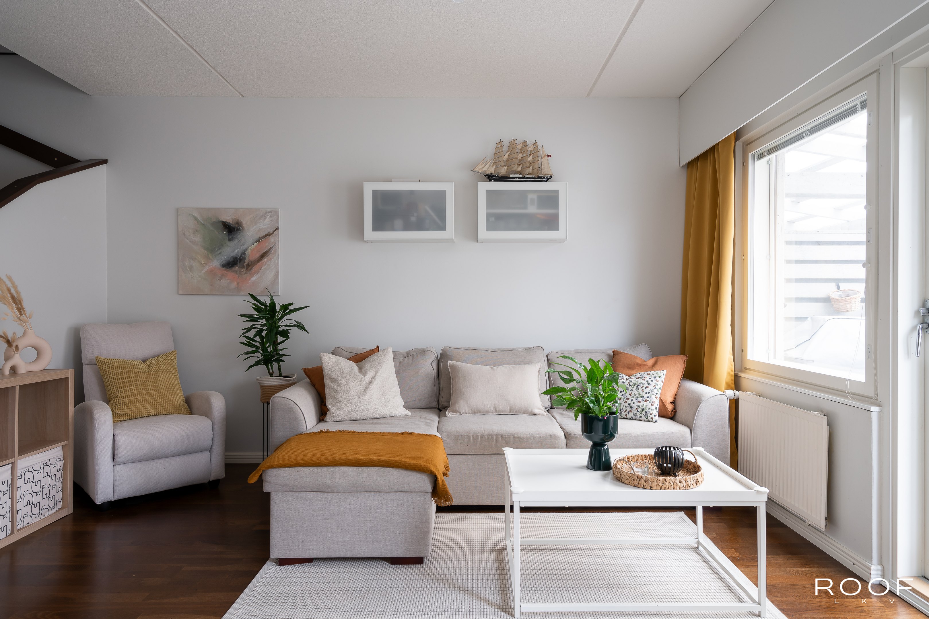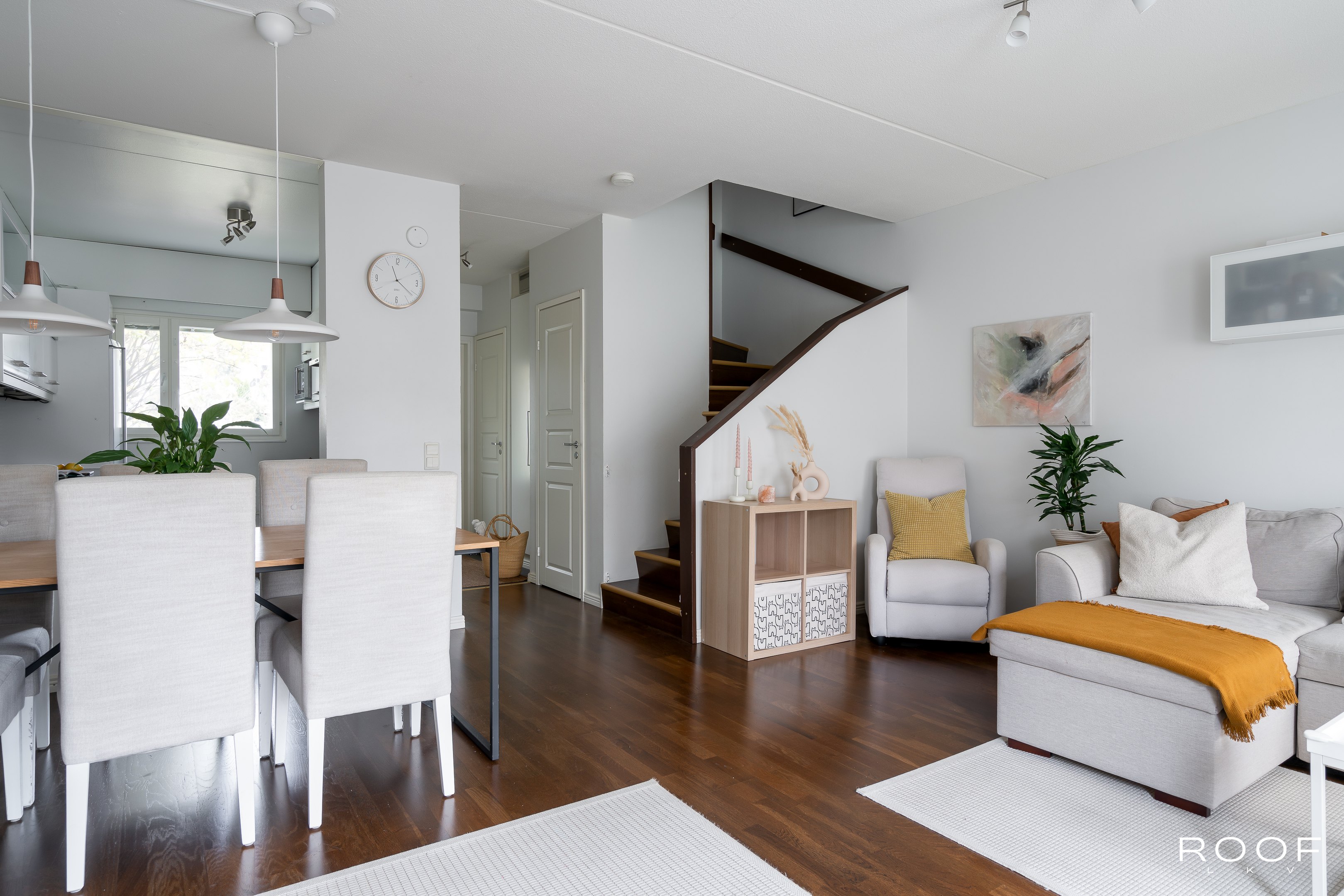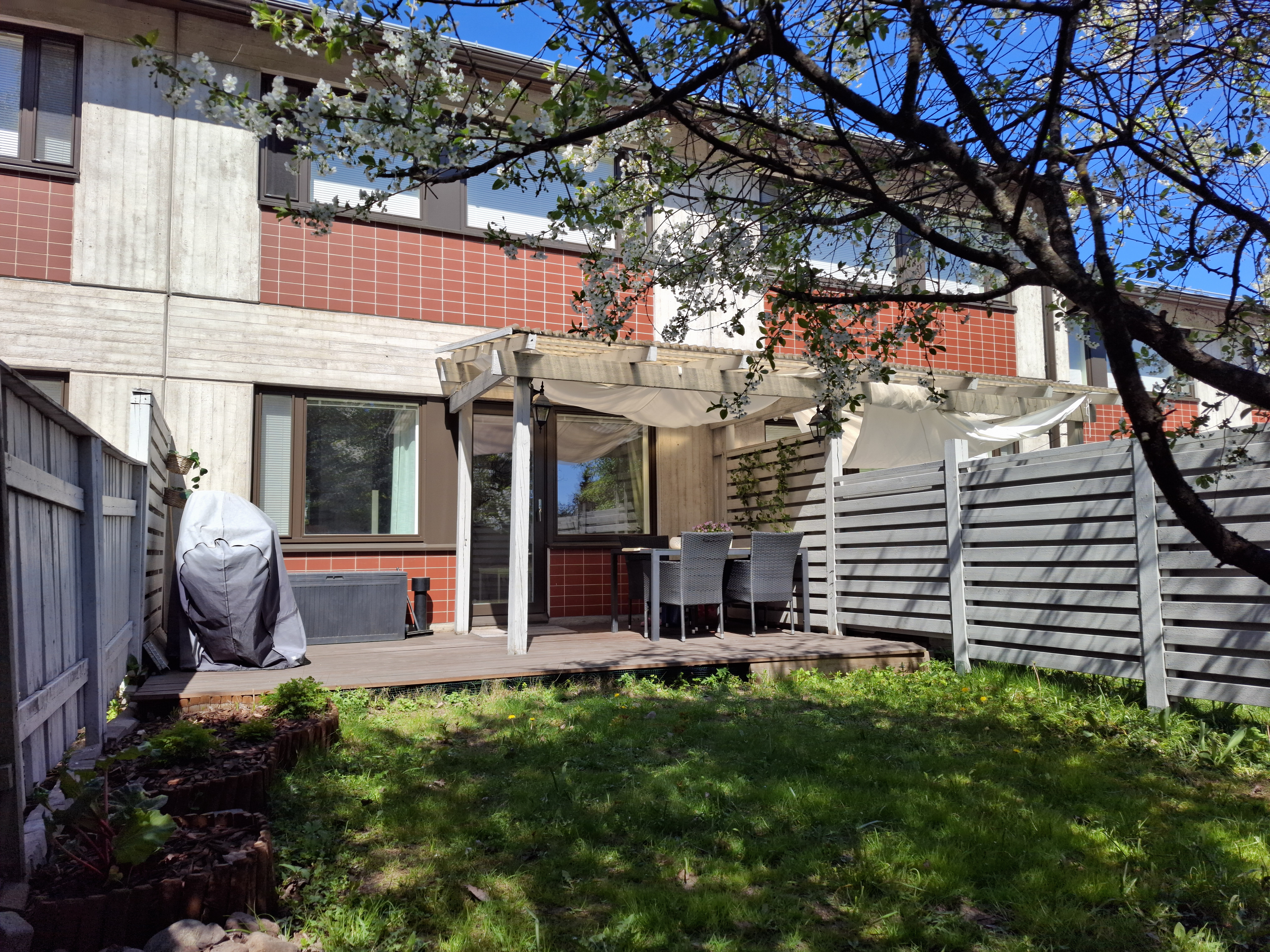 Valoisa ja tilava kaksitasoinen asunto jakautuu alakerran olohuone, ruokailutila, keittiö, erillinen wc sekä yläkerran makuuhuoneet, aula, kylpyhuone/sauna ja parveke kokonaisuuksiksi. Asunnon lattiat ovat parkettia, keittiö remontoitu v. 2009 ja wc sekä kylpyhuone v. 2011. Yläkerrassa huonekorkeus tuo avaruutta talon harjakaton ansiosta. Säilytystilaa on mukavasti alakerran portaidenalusvaraston, eteisen ja makuuhuoneiden kaapistojen sekä ulkovaraston ansiosta. Asuntoon kuuluu oma piha, jossa on osittain katettu terassi. Myös pääsisäänkäynti taloyhtiön sisäpihan puolelta asuntoon on katettu.