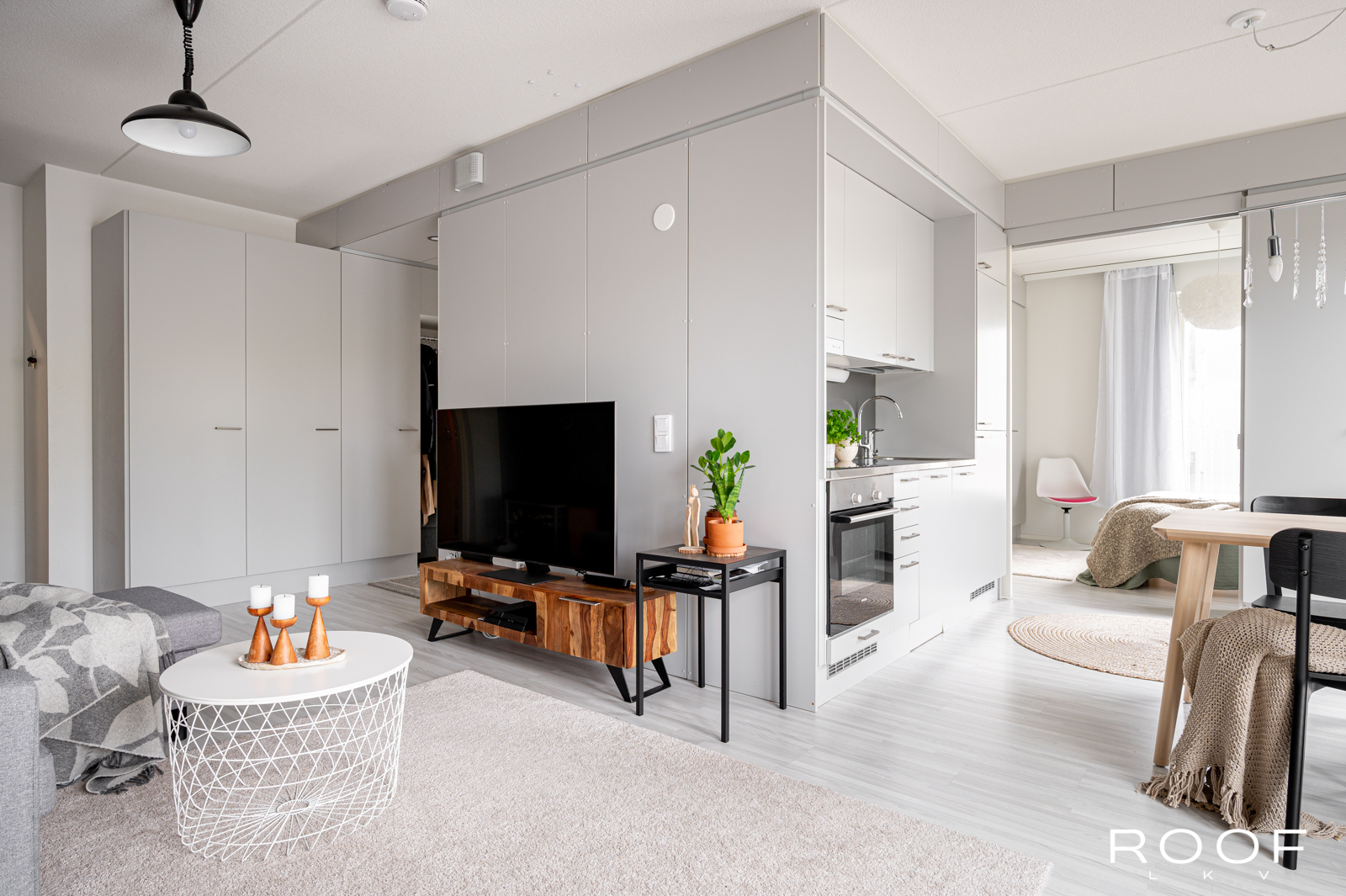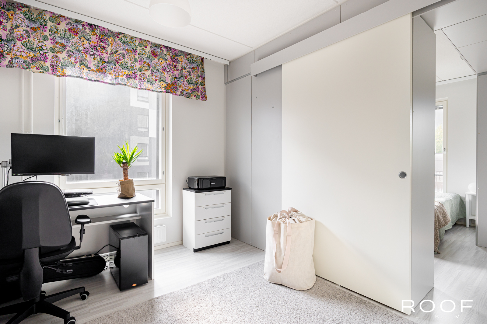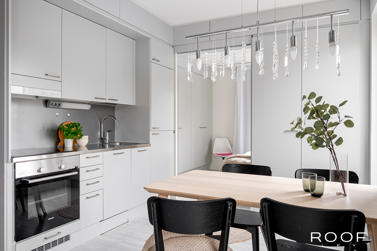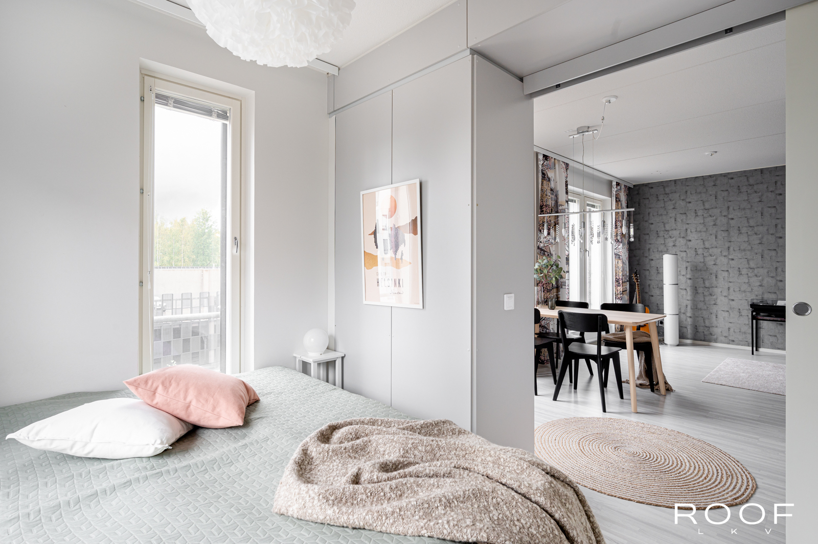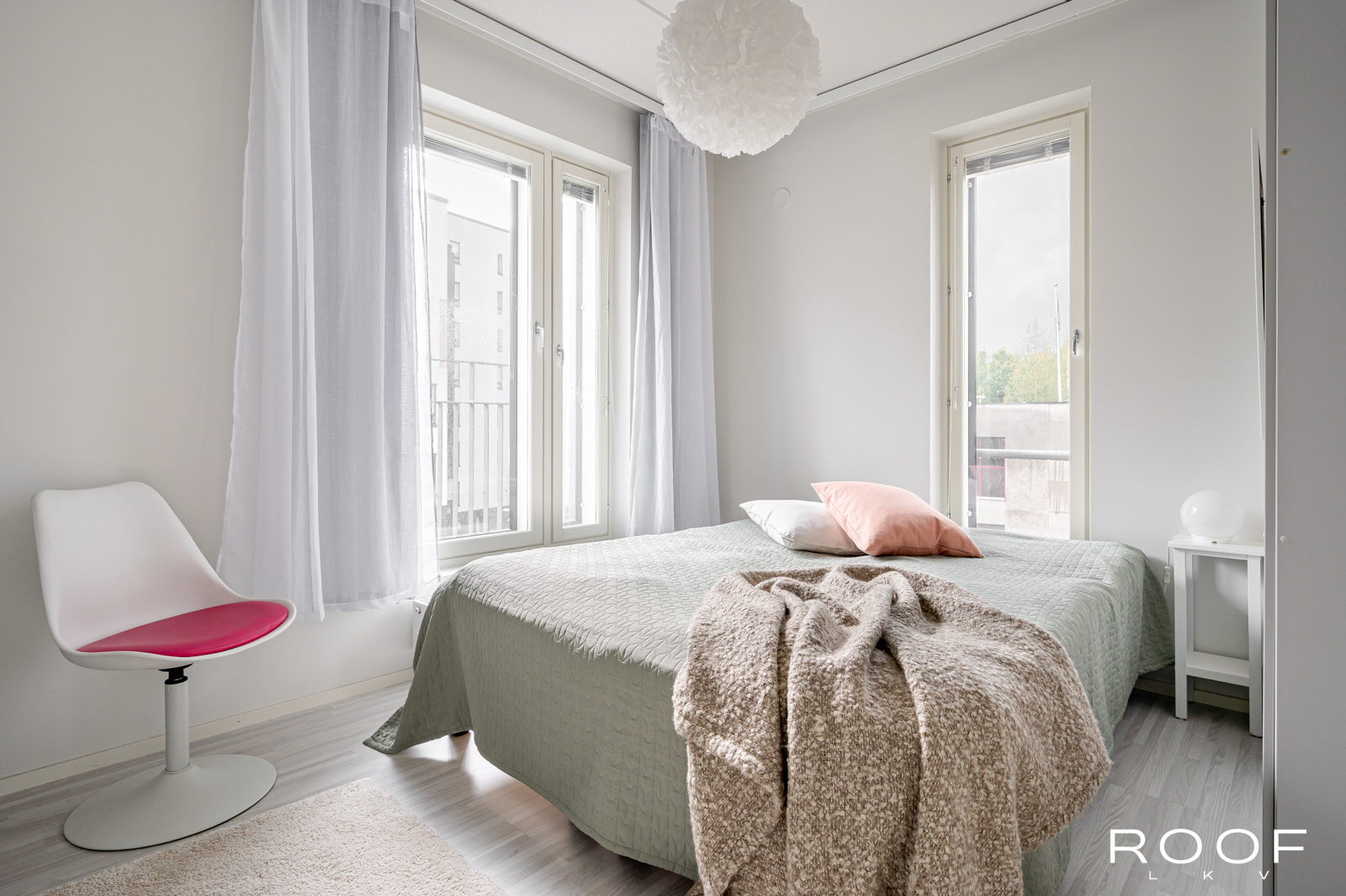 Vaaleat ja ajattomat pintamateriaalit sekä lattiasta kattoon ulottuvat ikkunat tuovat asuntoon runsaasti tilantuntua ja valoisuutta. Huoneiston neliöt on fiksusti käytetty ja huoneiden väliset liukuovet on moderni ja tilaa luova ratkaisu. Keittiön ruokailutila avautuu olohuoneeseen, mikä tuo juuri sopivaasti avoimuutta oleskelutilaan.