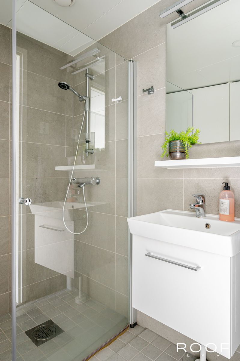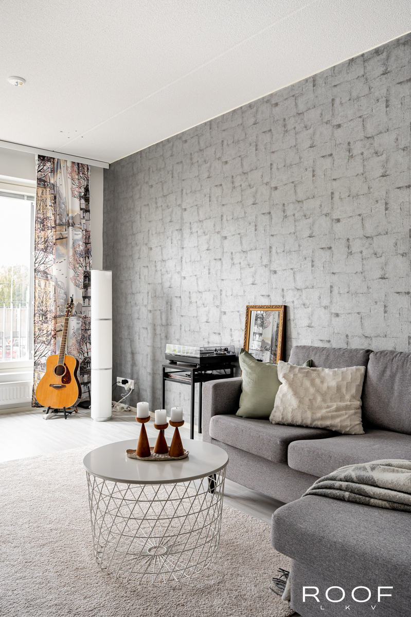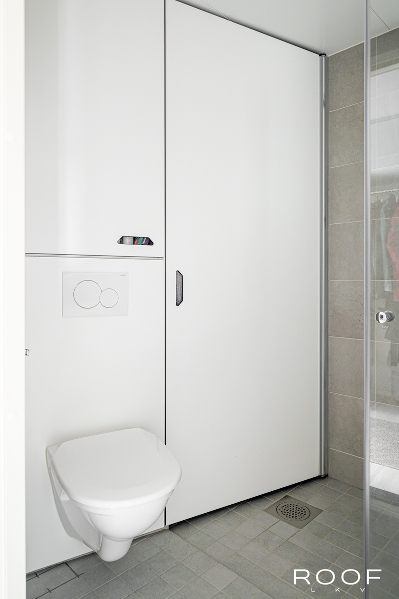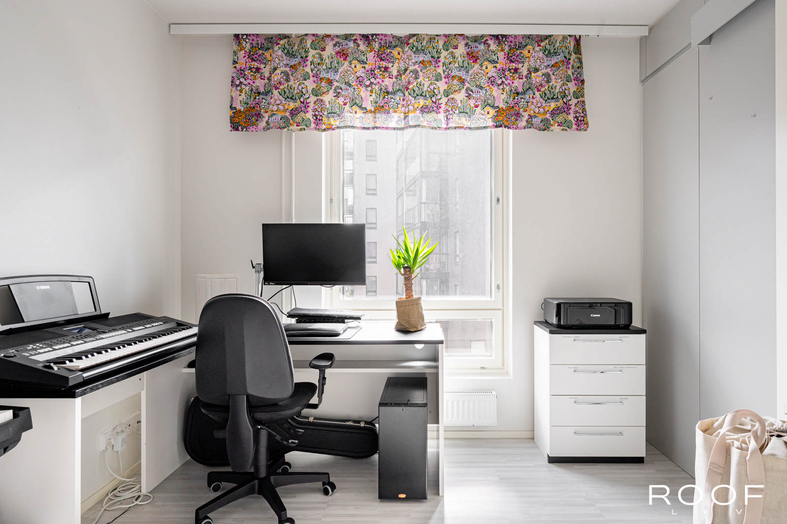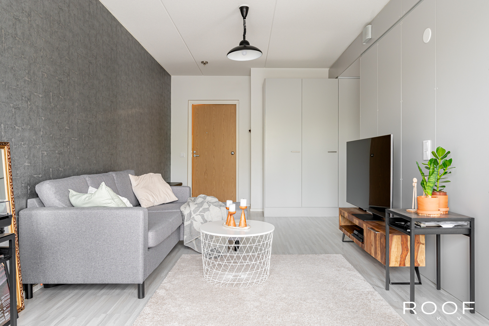 Vaaleat ja ajattomat pintamateriaalit sekä lattiasta kattoon ulottuvat ikkunat tuovat asuntoon runsaasti tilantuntua ja valoisuutta. Huoneiston neliöt on fiksusti käytetty ja huoneiden väliset liukuovet on moderni ja tilaa luova ratkaisu. Keittiön ruokailutila avautuu olohuoneeseen, mikä tuo juuri sopivaasti avoimuutta oleskelutilaan.