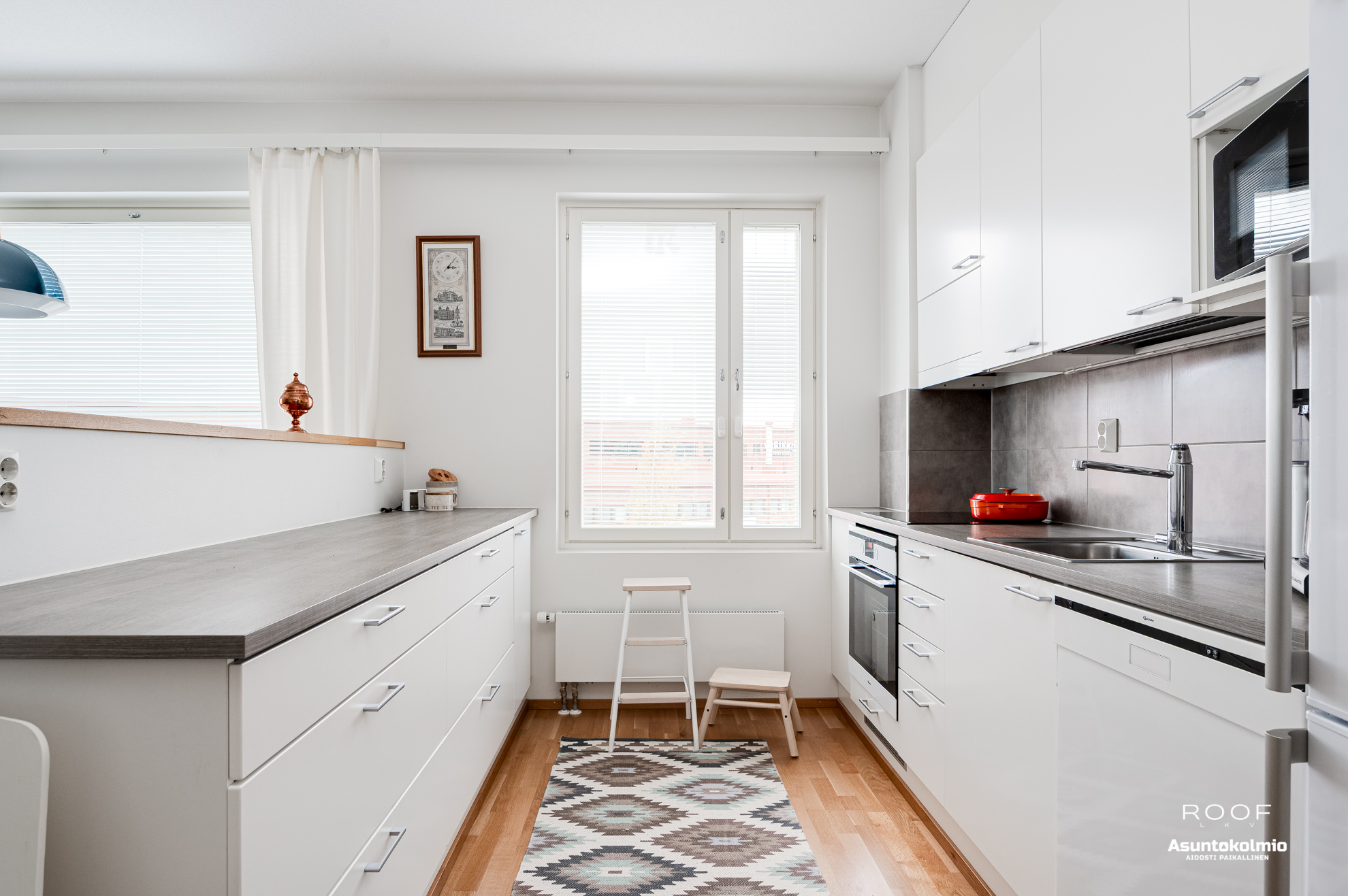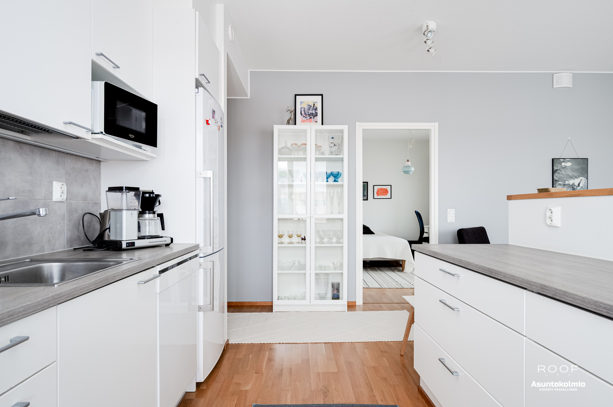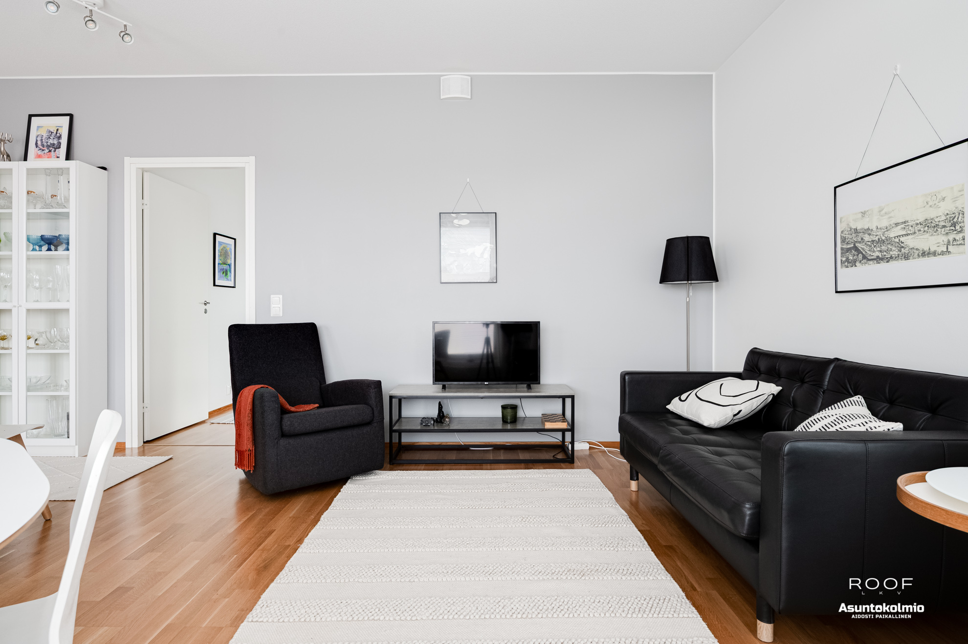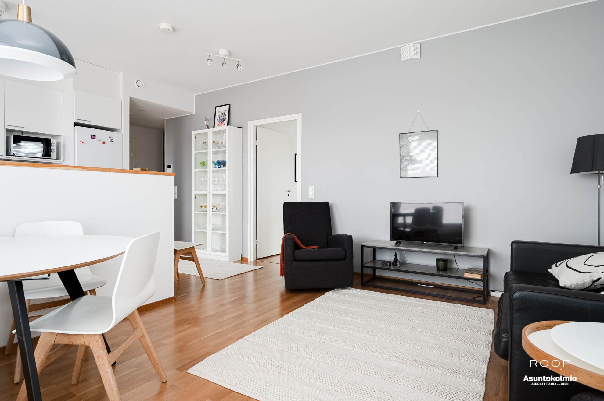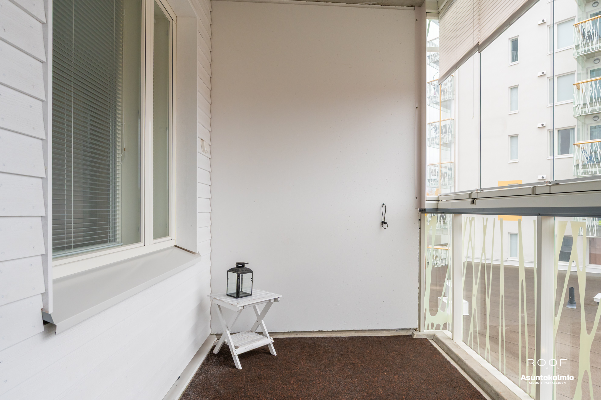 Pohjaratkaisultaan asunto on erittäin fiksu. Keittiö ja olohuone on yhtä avointa, valoisaa tilaa, missä on helppo seurustella ja mikä on kätevä sisustaa. Keittiössä on laadukkaat kodinkoneet ja mukavasti laskutilaa. Päämakuuhuoneesta on käynti ihastuttavalle, lasitetulle parvekkeelle. Erillinen wc ja hyvät säilytystilat helpottavat arjen sujuvuutta. Taloyhtiöllä OMA TONTTI, ja lämmitys kaukolämmöllä sisältyy edulliseen hoitovastikkeeseen (3.7 €/m²)!