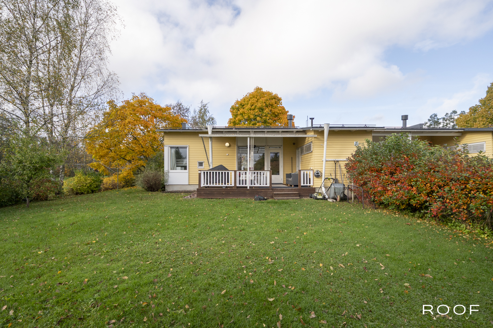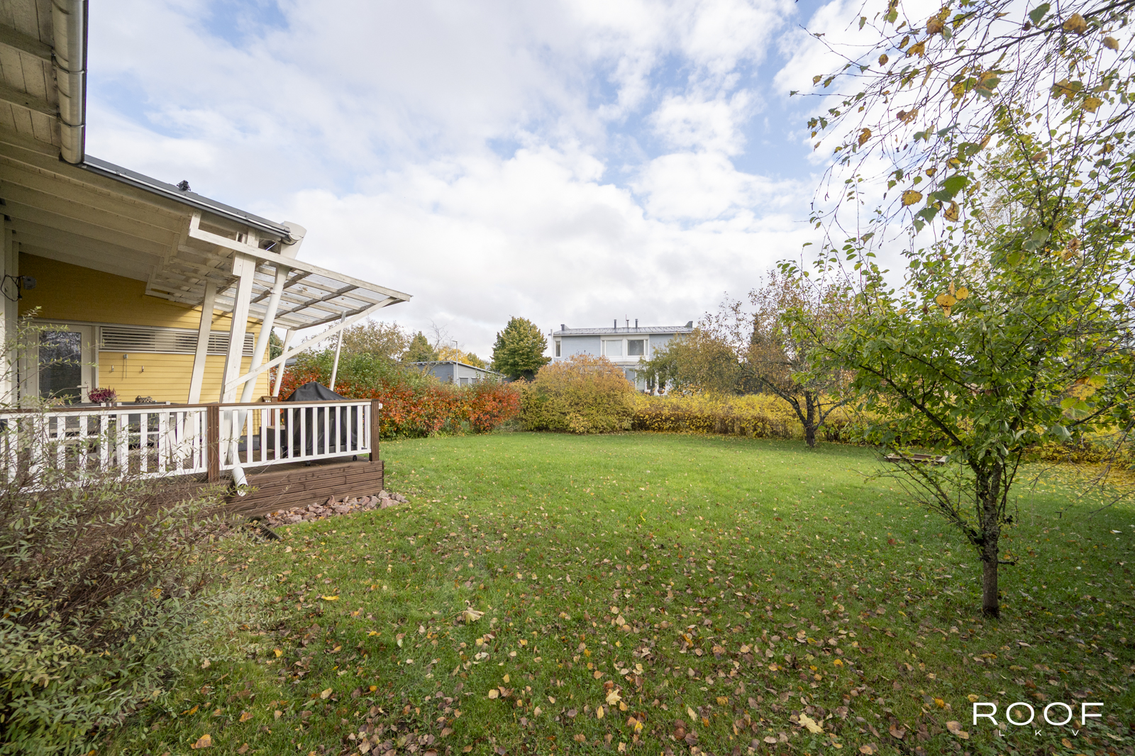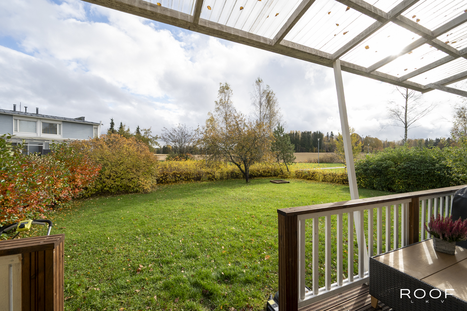 Takapihan rauhallinen oleskelualue kutsuu viettämään aikaa ulkona, tilaa löytyy niin lasten leikeille, puutarhanhoidolle kuin kesäisille illanistujaisille.