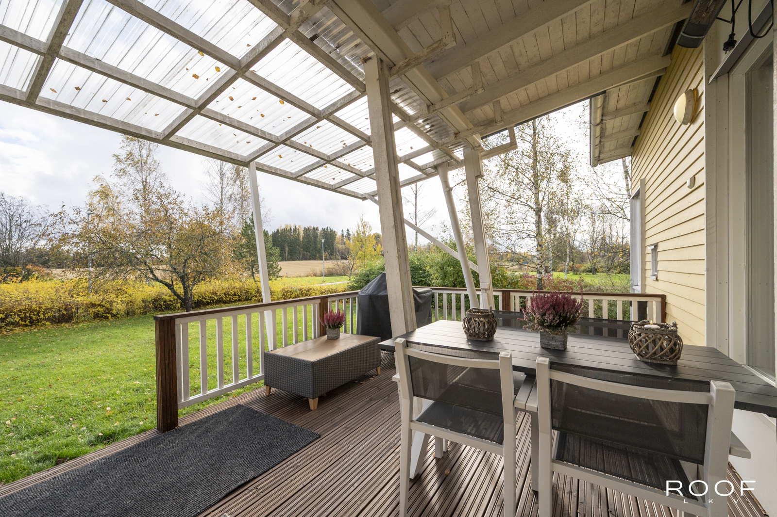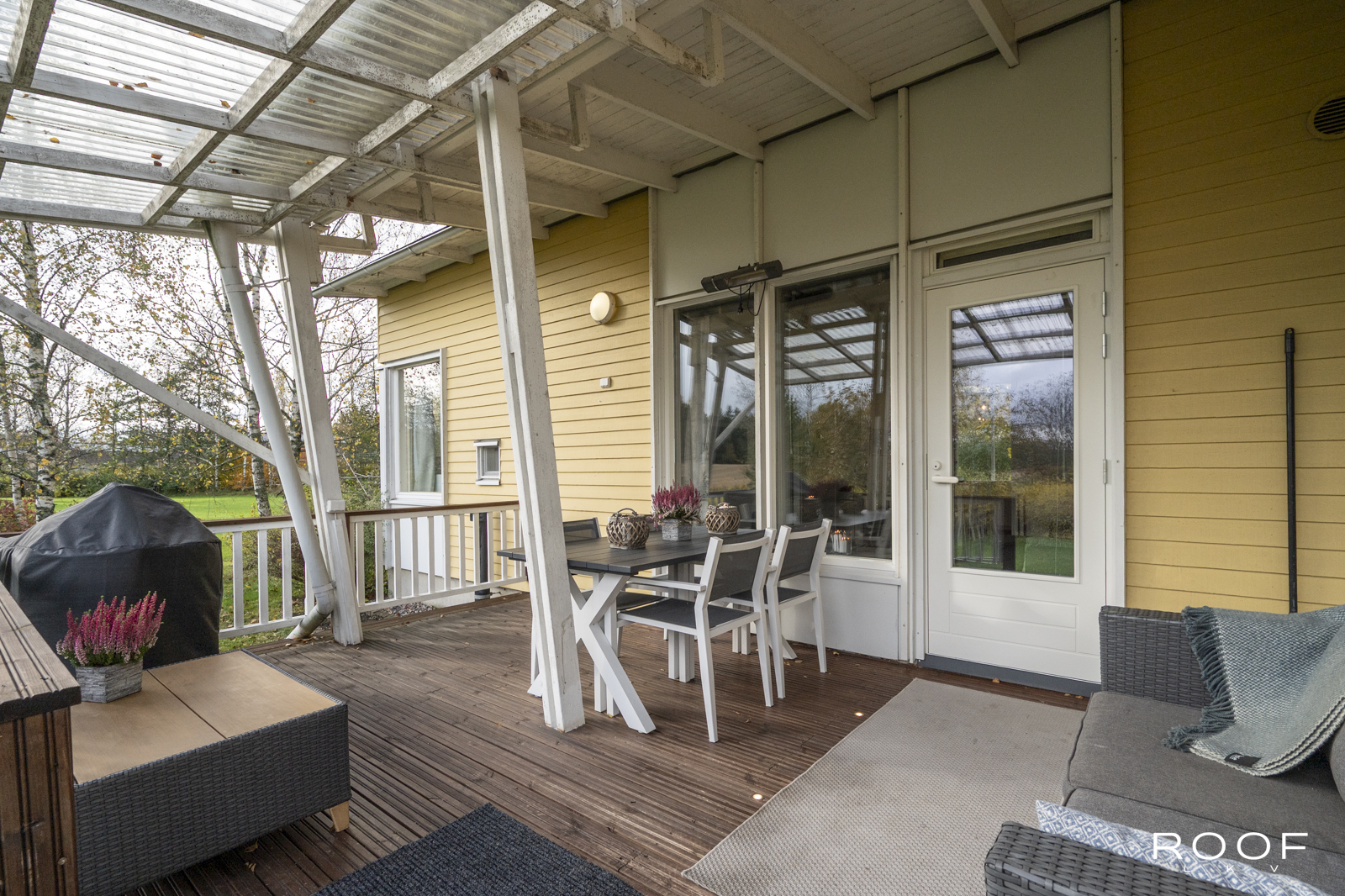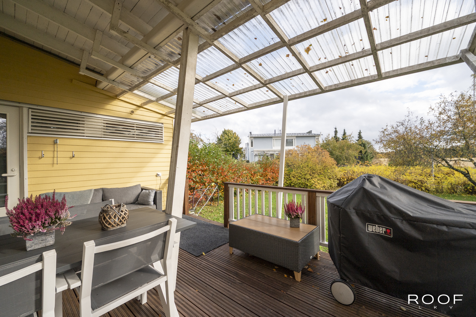 Takapihan rauhallinen oleskelualue kutsuu viettämään aikaa ulkona, tilaa löytyy niin lasten leikeille, puutarhanhoidolle kuin kesäisille illanistujaisille.