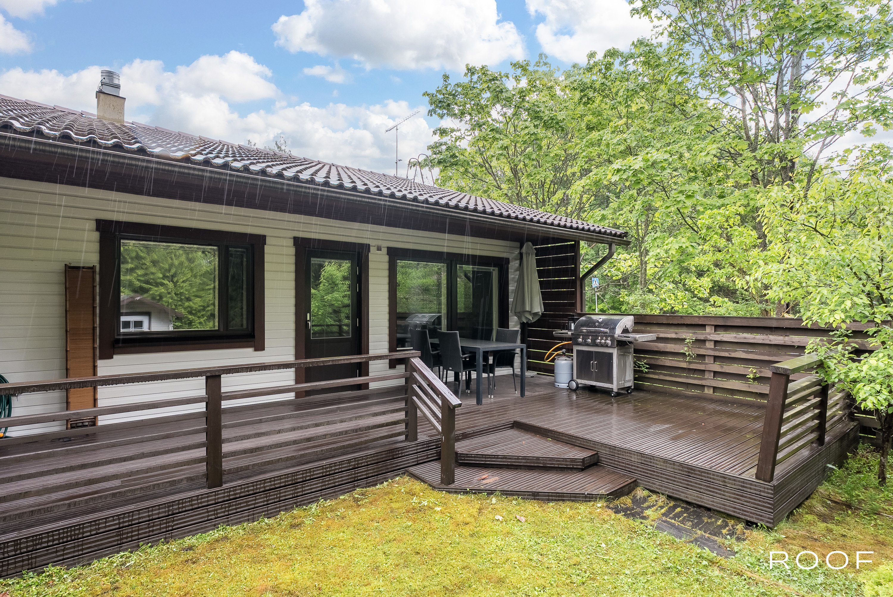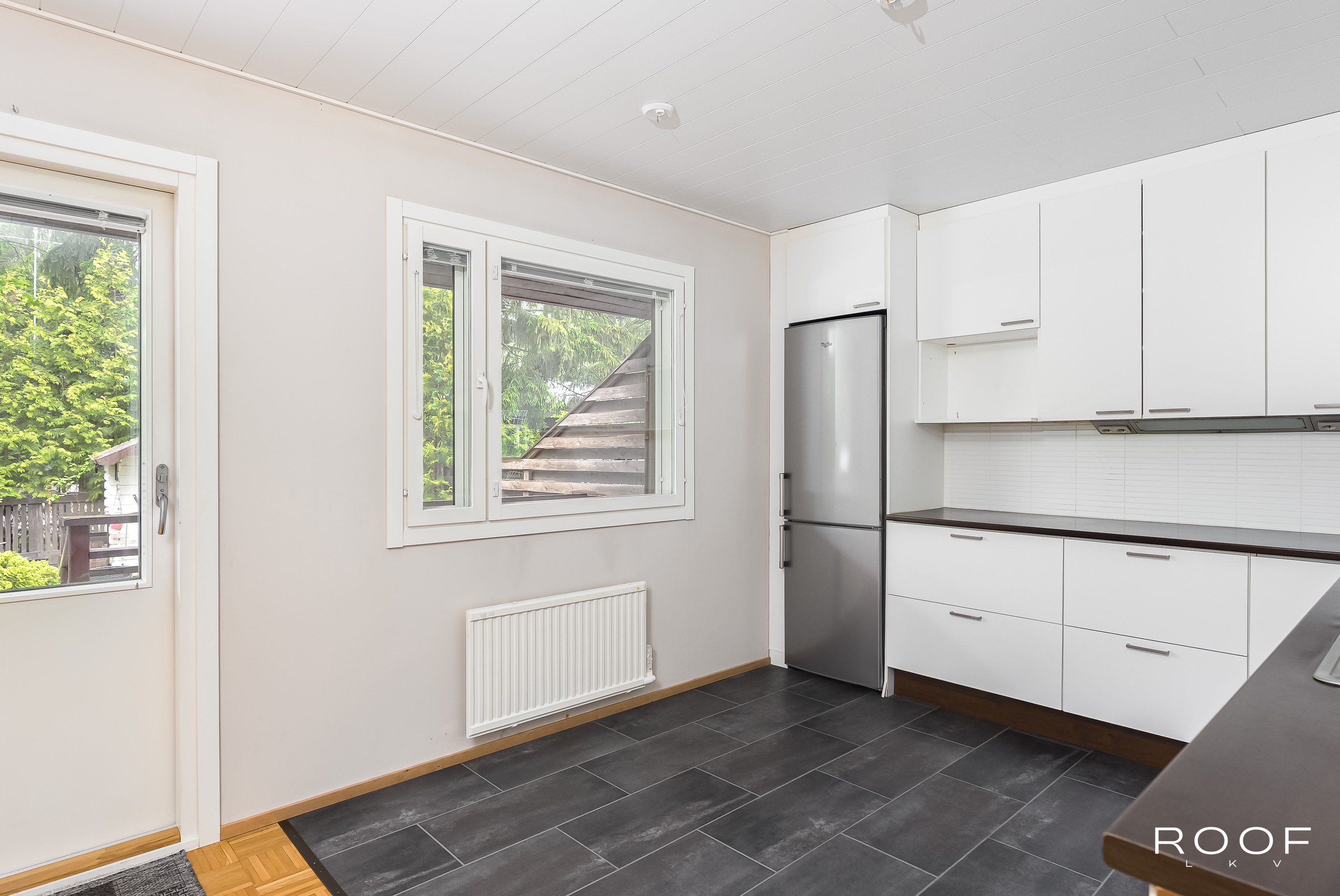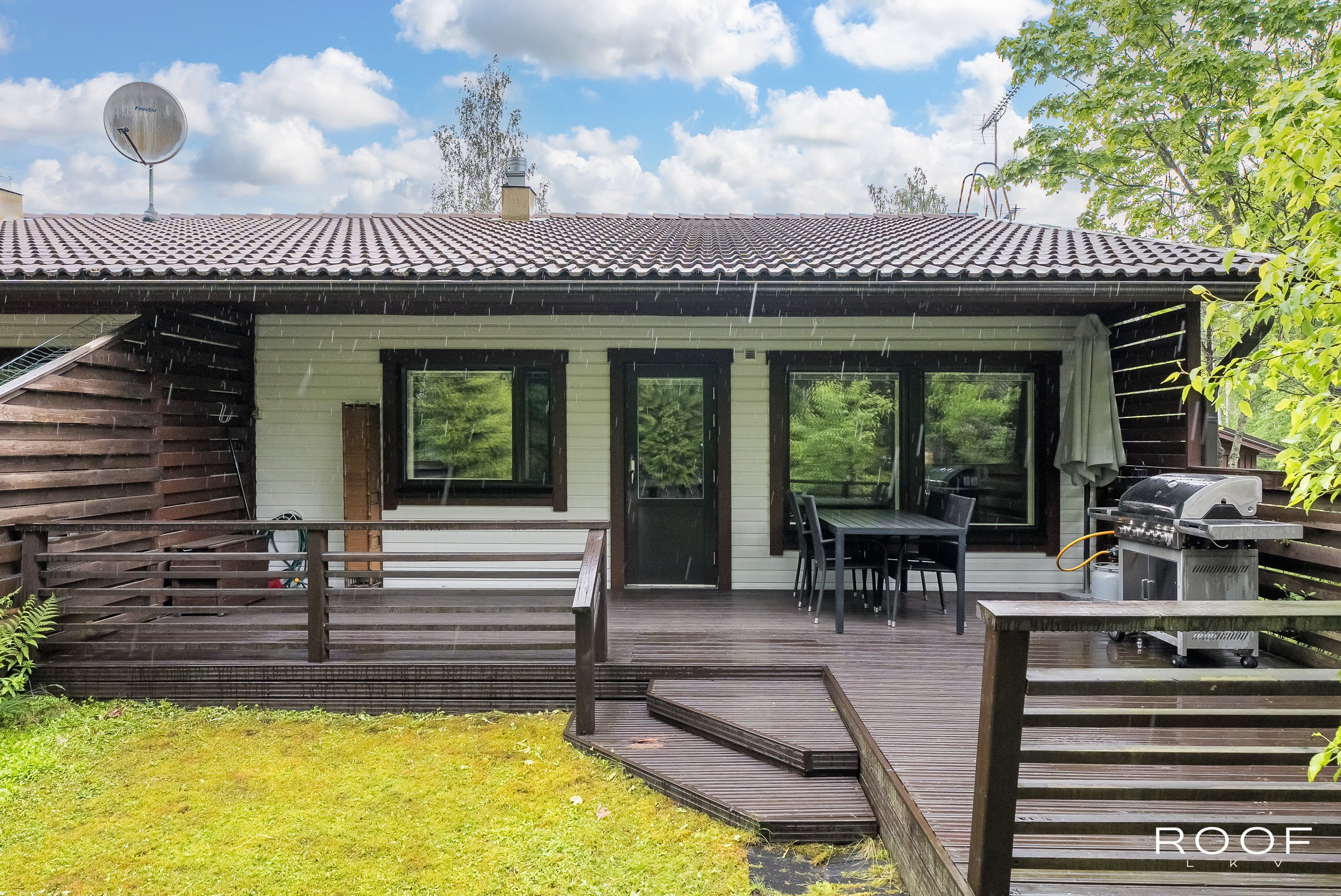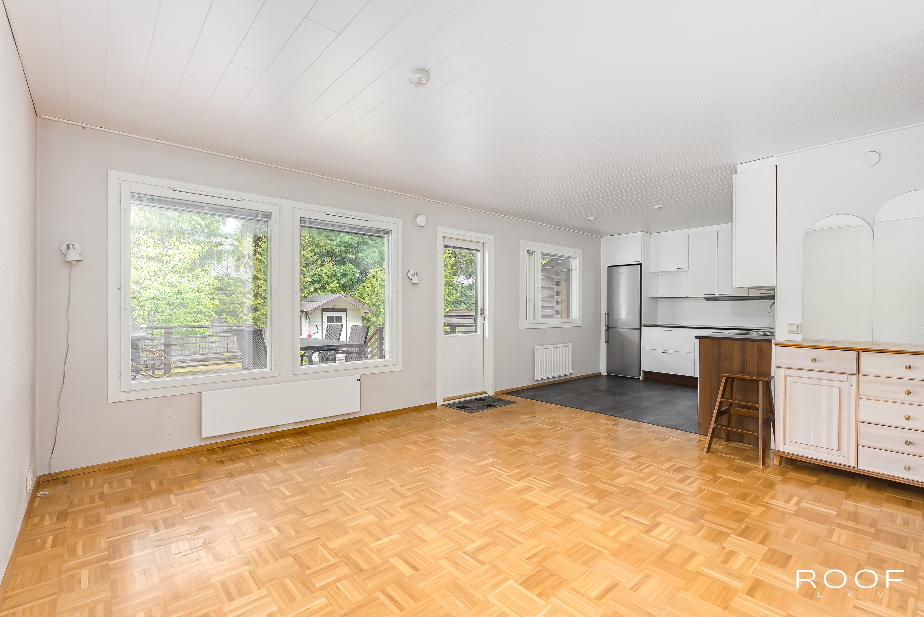 Tämän kodin pohjaratkaisu on toimiva ja tilaratkaisut sopivat hyvin pienelle perheelle tai pariskunnalle. Keittiöstä löytyy mukavasti kaappi- ja työtilaa. Olohuoneesta on kulku osittain katetulle lounaaseen avautuvalle terassille ja suojaisalle piha-alueelle, josta löytyy myös leikkimökki.