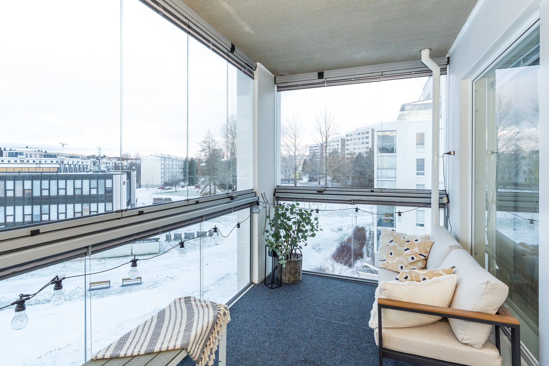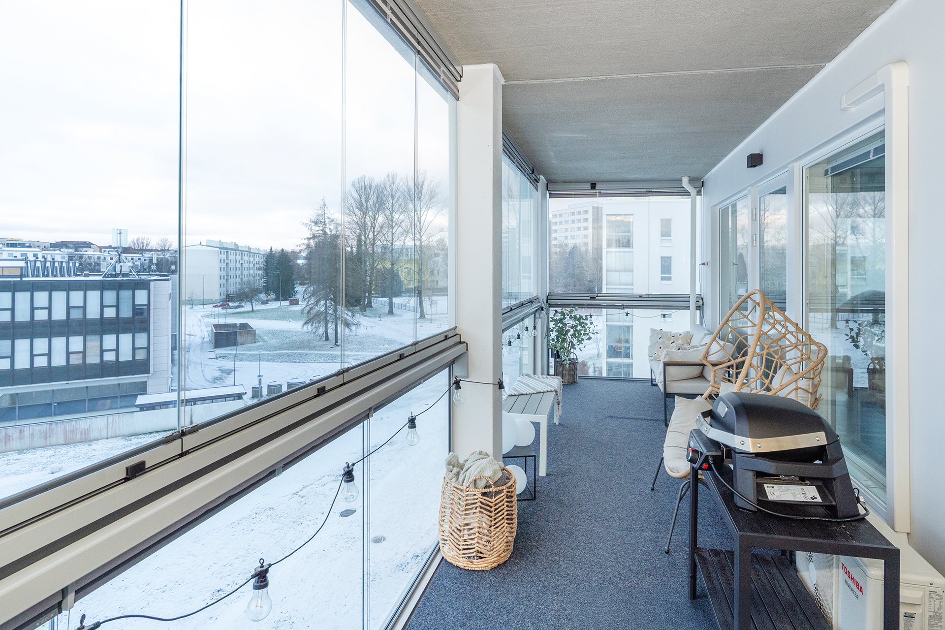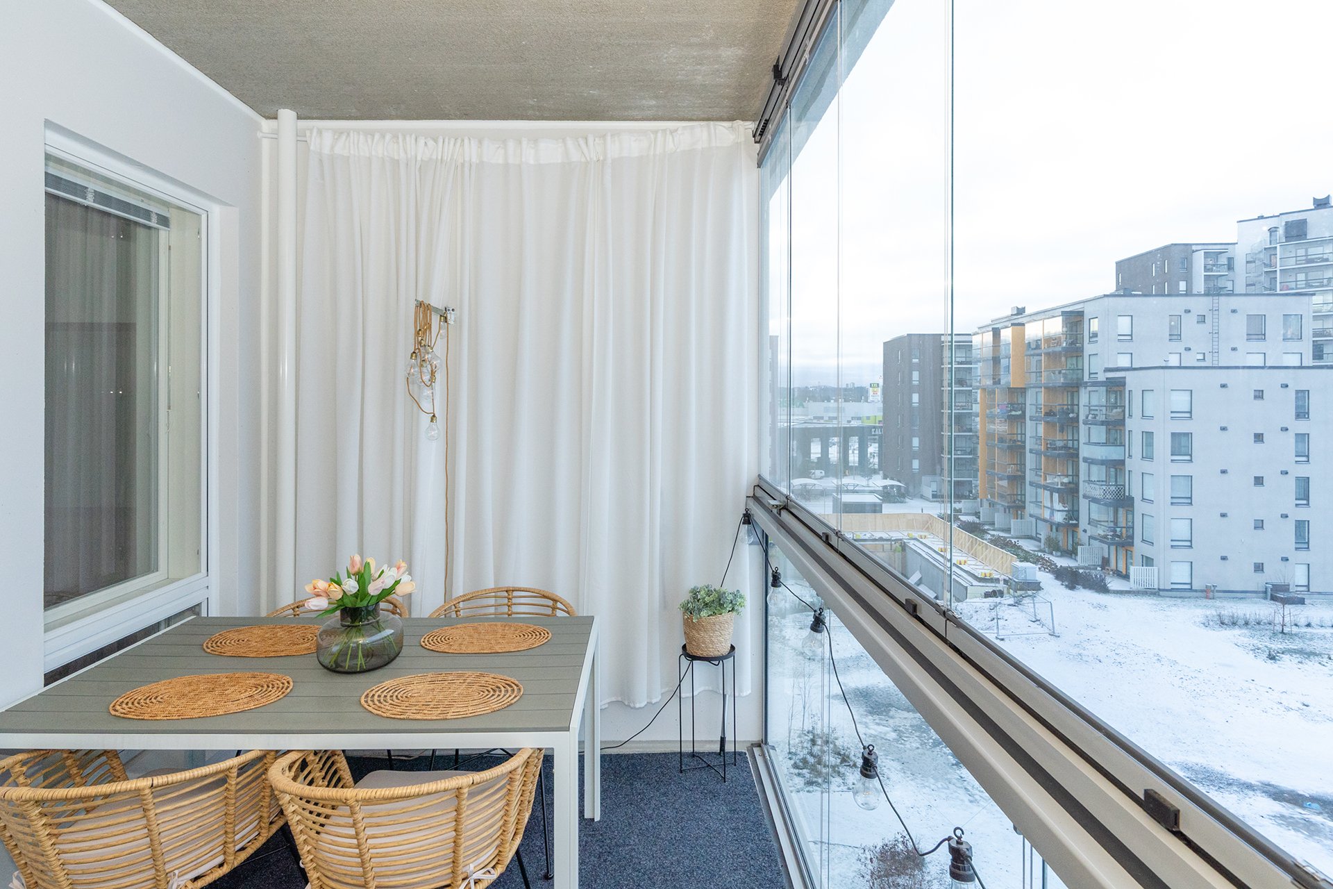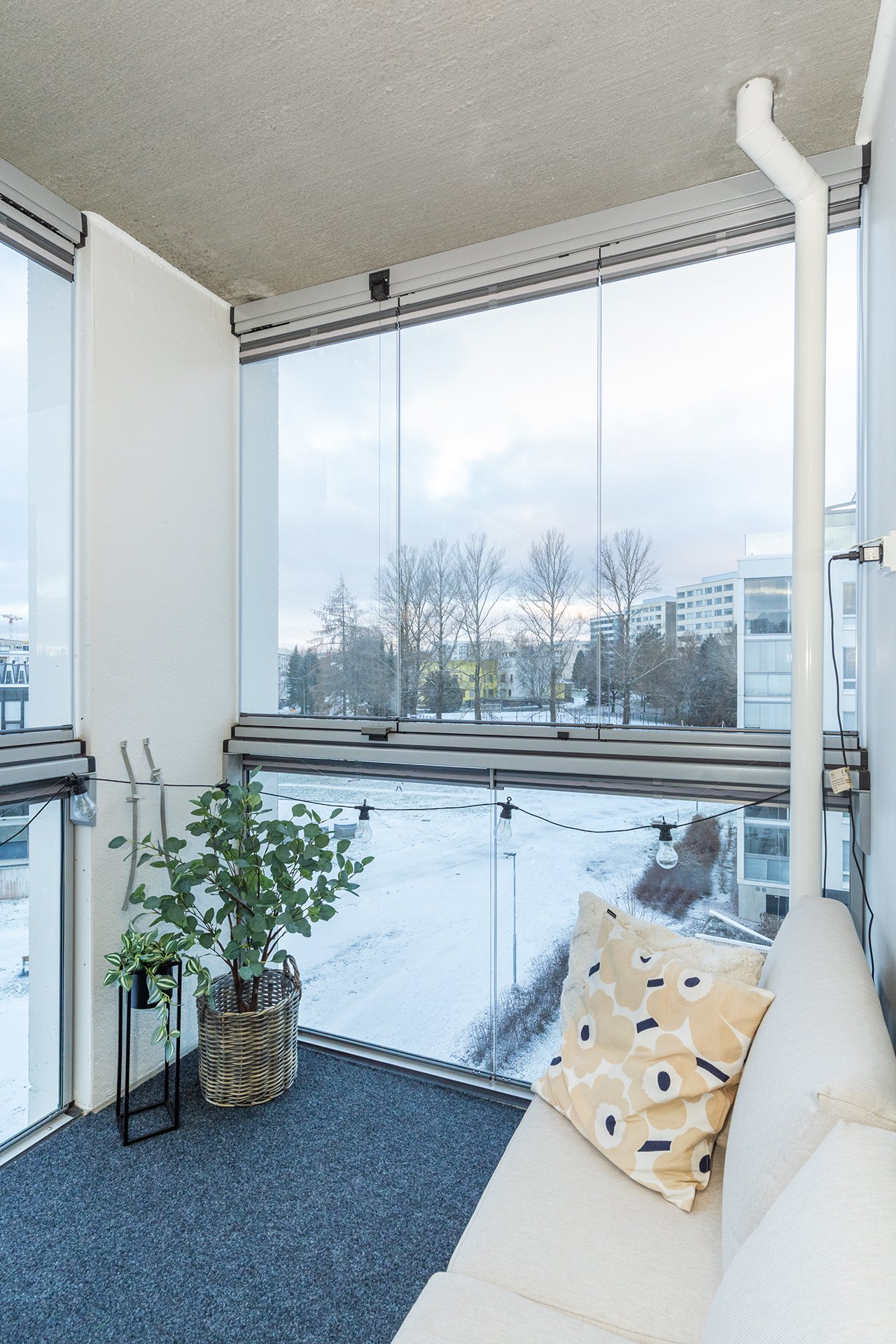 Nyt vapautumassa todella valoisa viidennen kerroksen huoneisto. Asunnossa on normaalia korkeampi huonekorkeus, joka lisää tilantuntua entisestään. Lisäksi asunnossa on paljon ikkunapinta-alaa joka täytyy kokea paikan päällä. Keittiöön on lisätty rakennusvaihdeessa kaappi- sekä laskutilaa ja ruokailutilaan mahtuu suurempikin ruokailuryhmä. Olohuoneesta on käynti isolle lasitetulle parvekkeelle, joka antaa mahdollisuuden moneen käyttötarkoitukseen. Kaksi makuuhuonetta sijoittuu eri puolille huoneistoa tuoden lisää yksity...