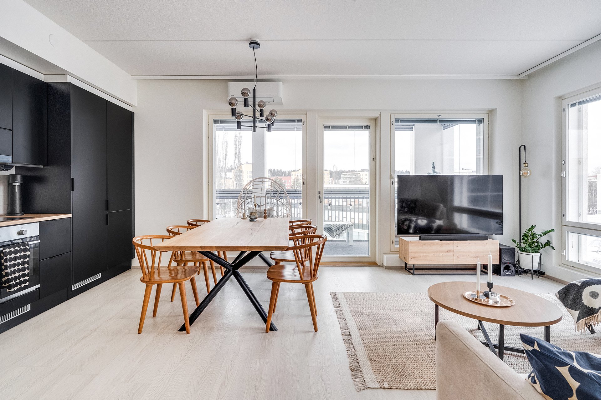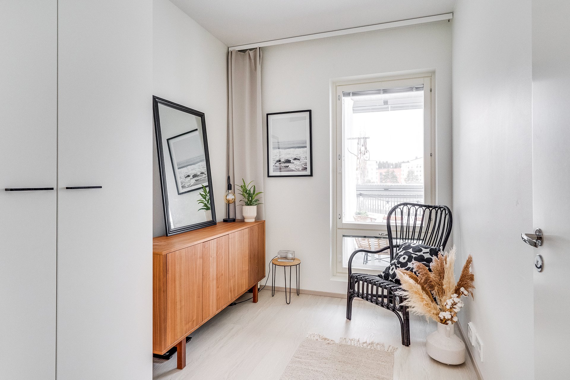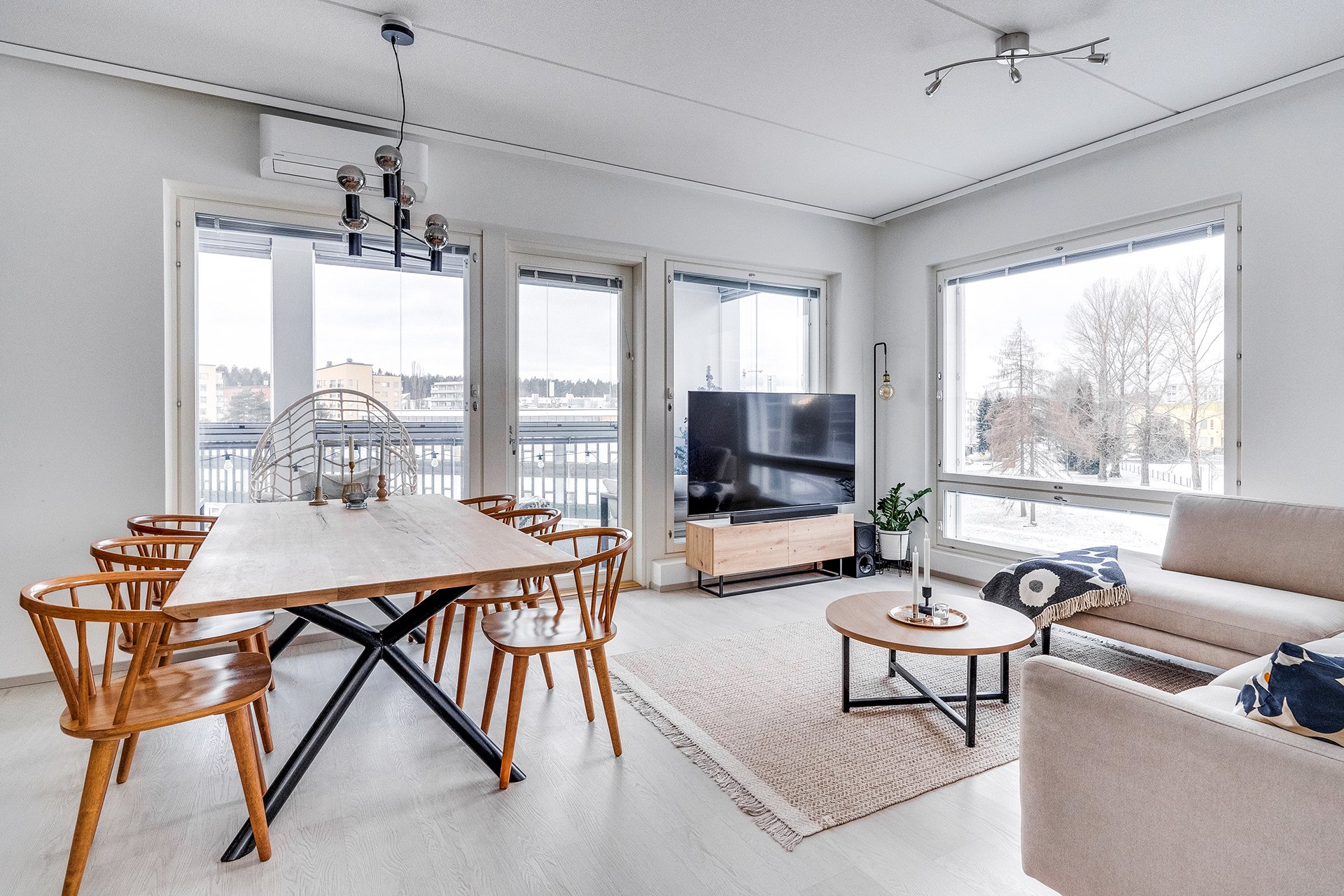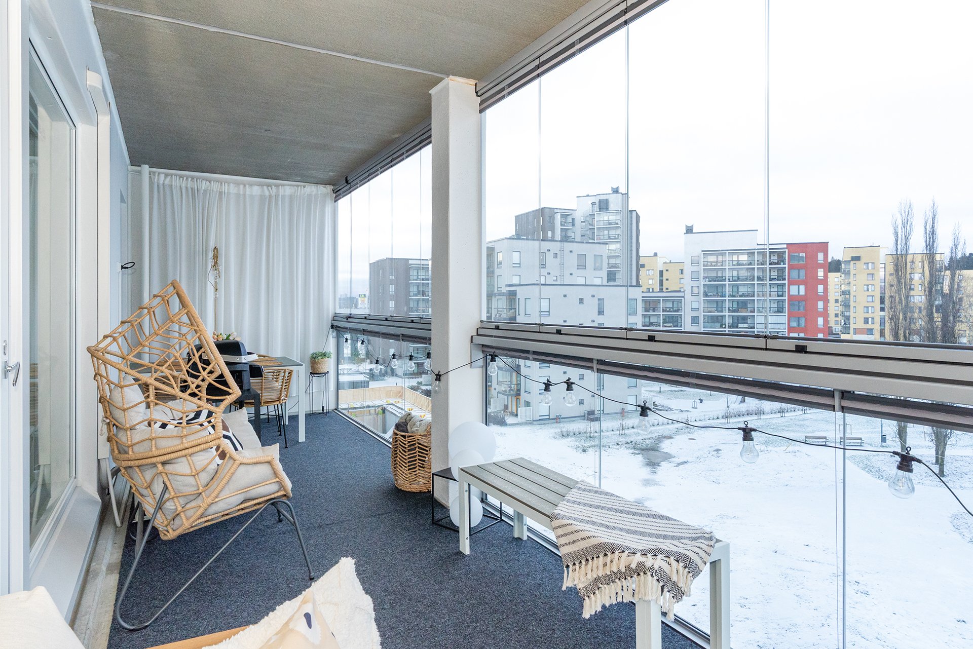 Nyt vapautumassa todella valoisa viidennen kerroksen huoneisto. Asunnossa on normaalia korkeampi huonekorkeus, joka lisää tilantuntua entisestään. Lisäksi asunnossa on paljon ikkunapinta-alaa joka täytyy kokea paikan päällä. Keittiöön on lisätty rakennusvaihdeessa kaappi- sekä laskutilaa ja ruokailutilaan mahtuu suurempikin ruokailuryhmä. Olohuoneesta on käynti isolle lasitetulle parvekkeelle, joka antaa mahdollisuuden moneen käyttötarkoitukseen. Kaksi makuuhuonetta sijoittuu eri puolille huoneistoa tuoden lisää yksity...