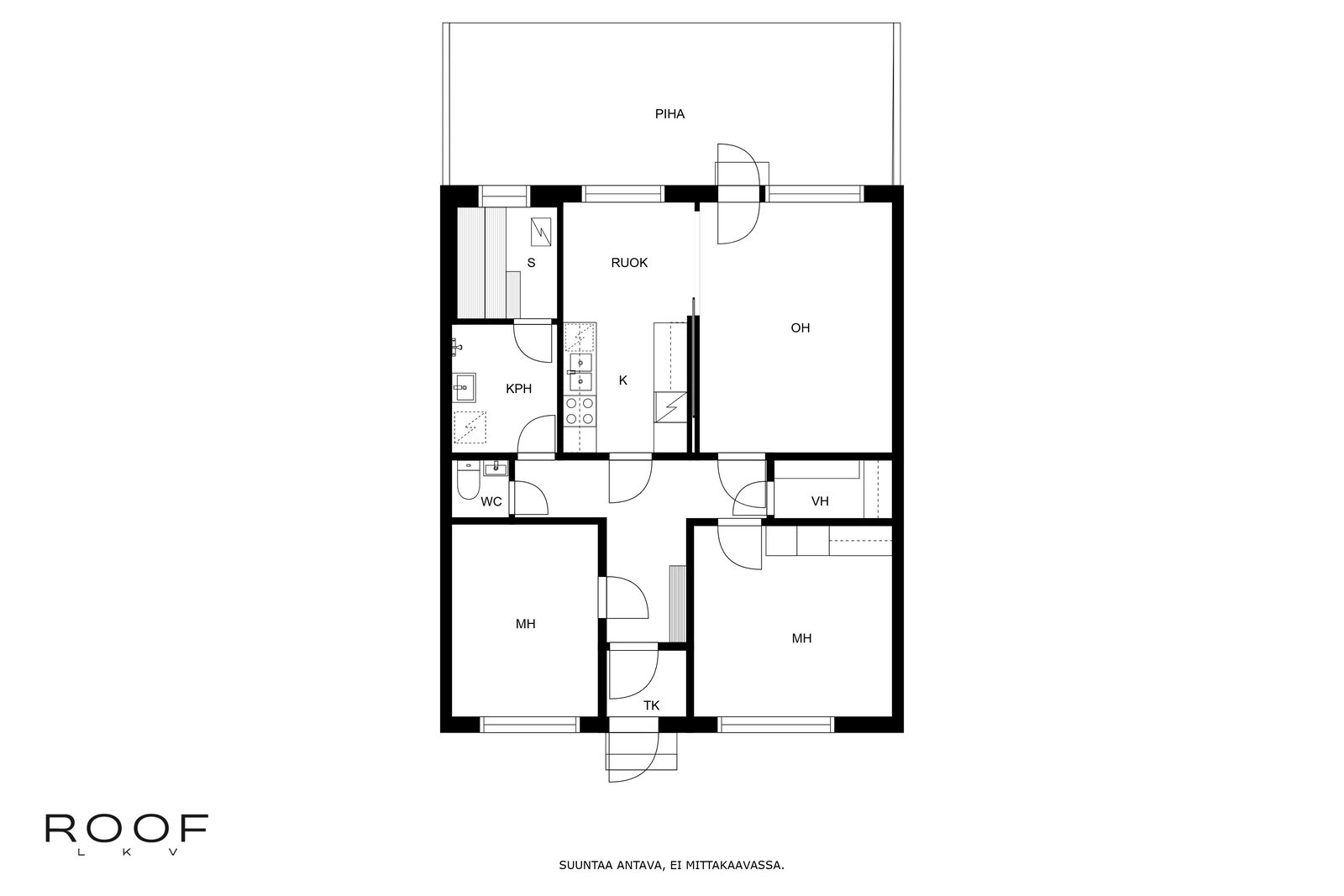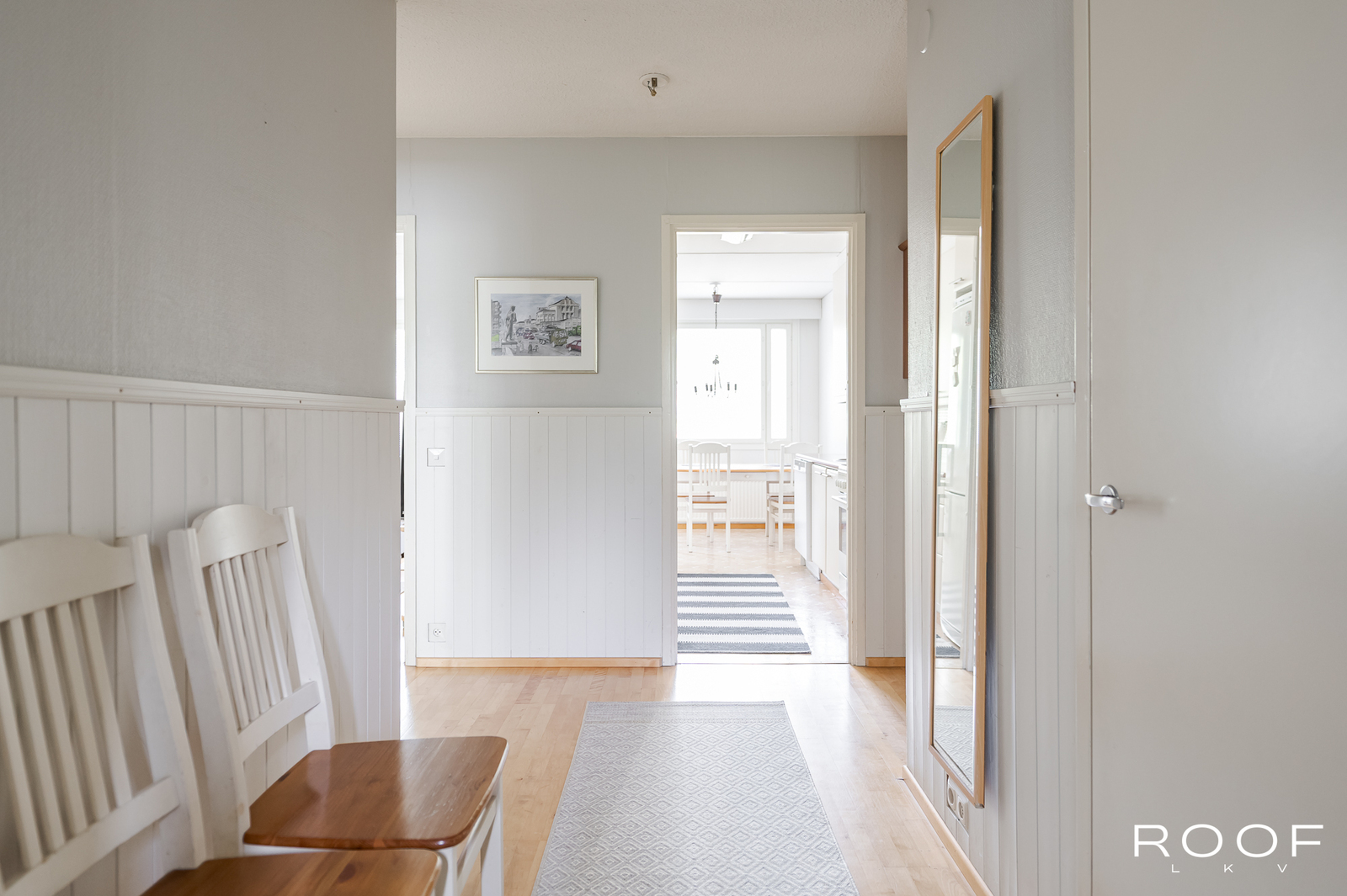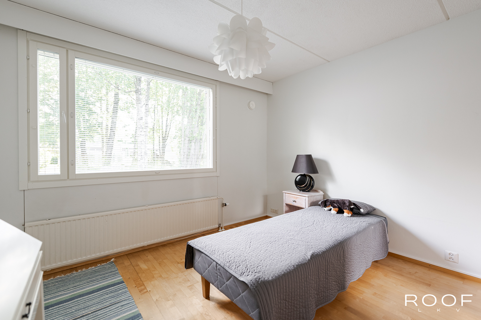 Yksitasoinen kahden makuuhuoneen koti. Tämä asunto pitää sisällään runsaiden asuinneliöiden lisäksi tilaa ja avaruutta. Pohjaratkaisu on käytännöllinen. Valoisa ja avara olohuone, johon mahtuu isompikin sohvaryhmä. Olohuoneesta käynti takapihalle. Ruokailutilaan mahtuu lapsiperheelle sopiva ruokailuryhmä. Keittöstä löytyy hyvin kaappi- sekä laskutilaa. Makuuhuoneet ovat tilavia ja asunnosta löytyy myös vaatehuone. Erillinen wc helpottaa lapsiperheen arkea ja sauna lisää ripauksen luksusta arkeen.