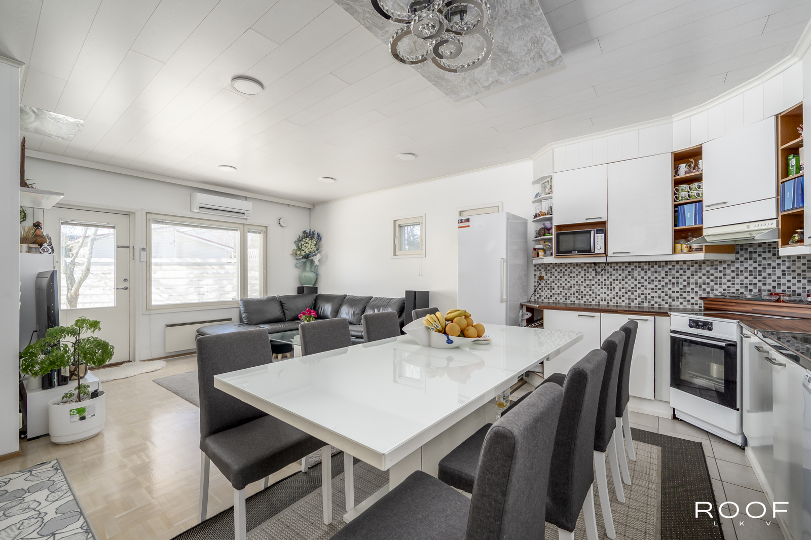 Vuonna 2014 valmistunut kolmio tarjoaa toimivan ja hyvän kokonaisuuden. Kodissa on selkeä pohjaratkaisu, modernit pinnat sekä arkeen lisää tilaa ja viihtyvyyttä tuo omalla terassilla varustettu takapiha.