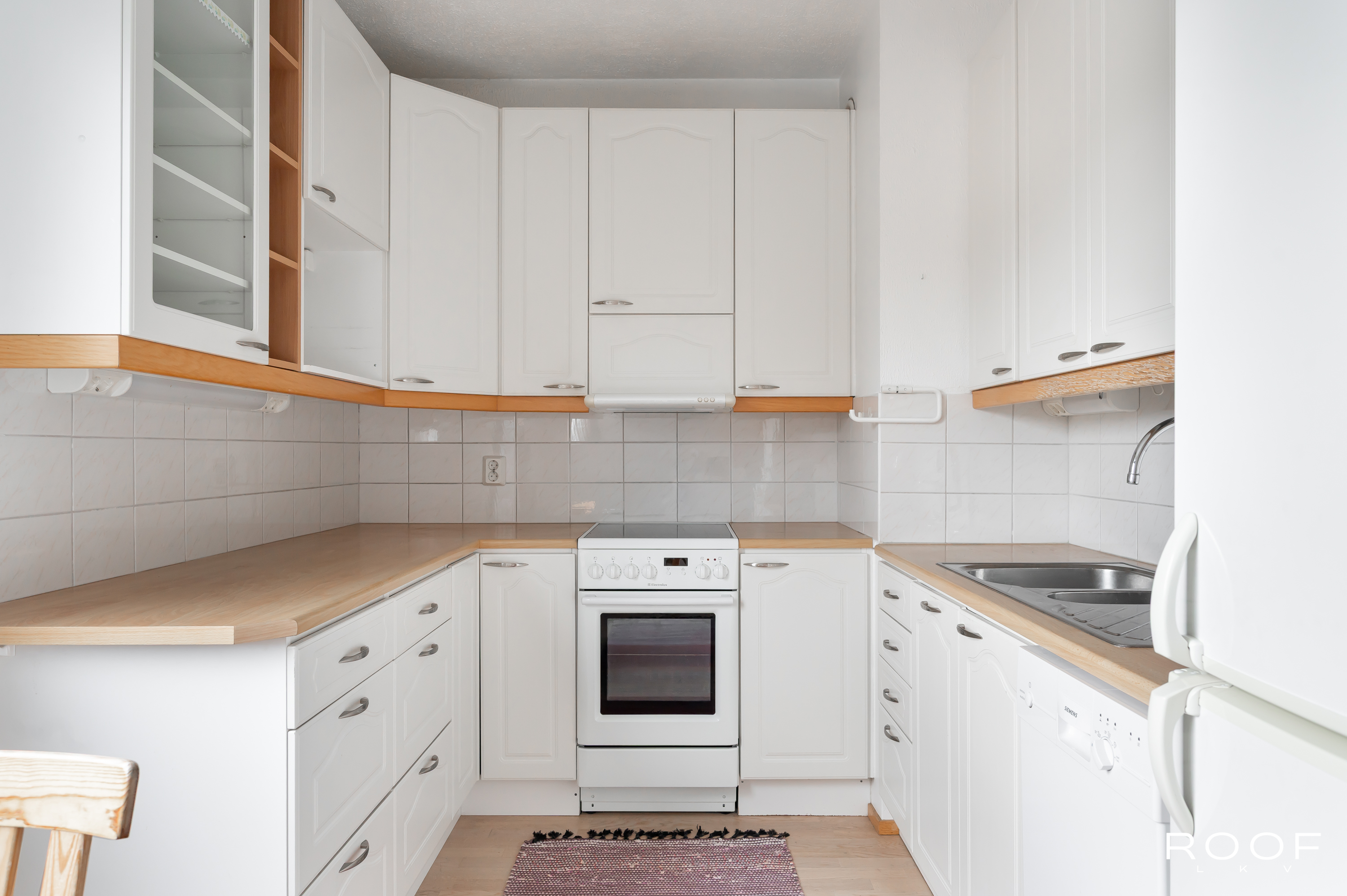 Asunnon pohjaratkaisu on toimiva ja tilava, ja se tarjoaa erinomaiset puitteet perhe-elämälle. Keittiö on hyvin varusteltu ja laskutilaa löytyy paljon. Kylpyhuone on tilava, jonne myös mahtuu pesukone. Makuuhuoneita asunnosta löytyy kaksi, joista toisessa on liukuovikaapisto. Lisäksi vaatehuone tuo runsaasti säilytystilaa.