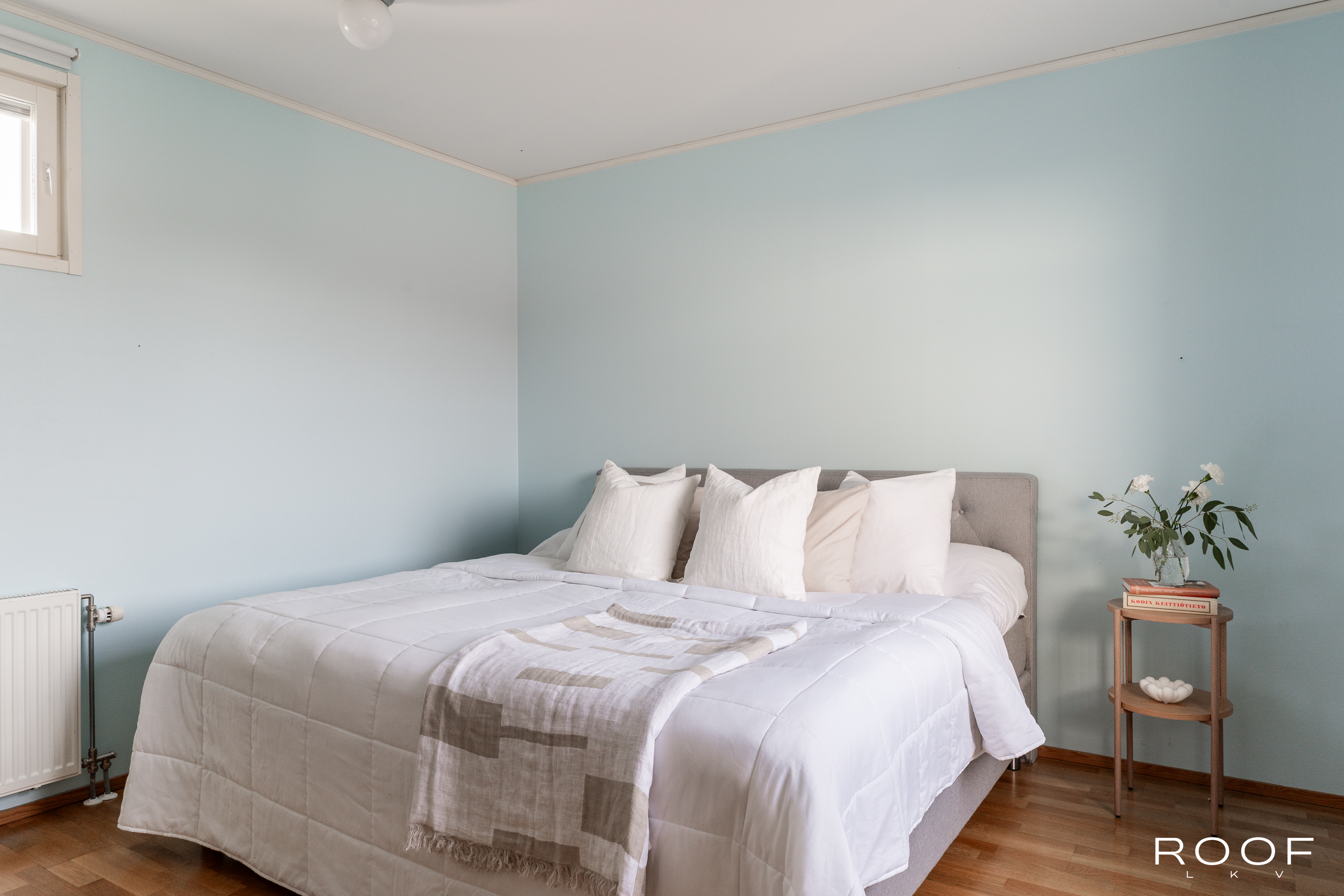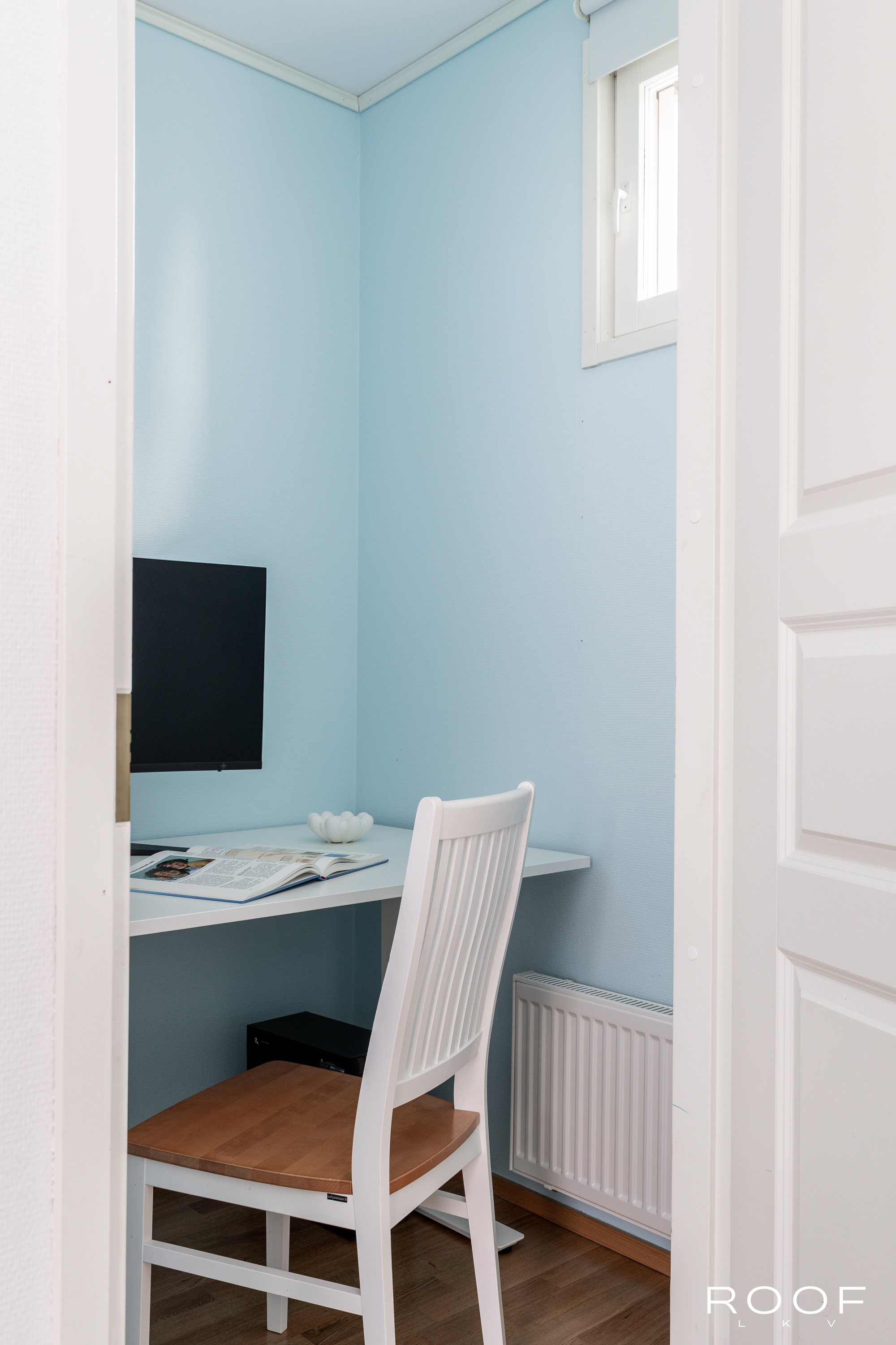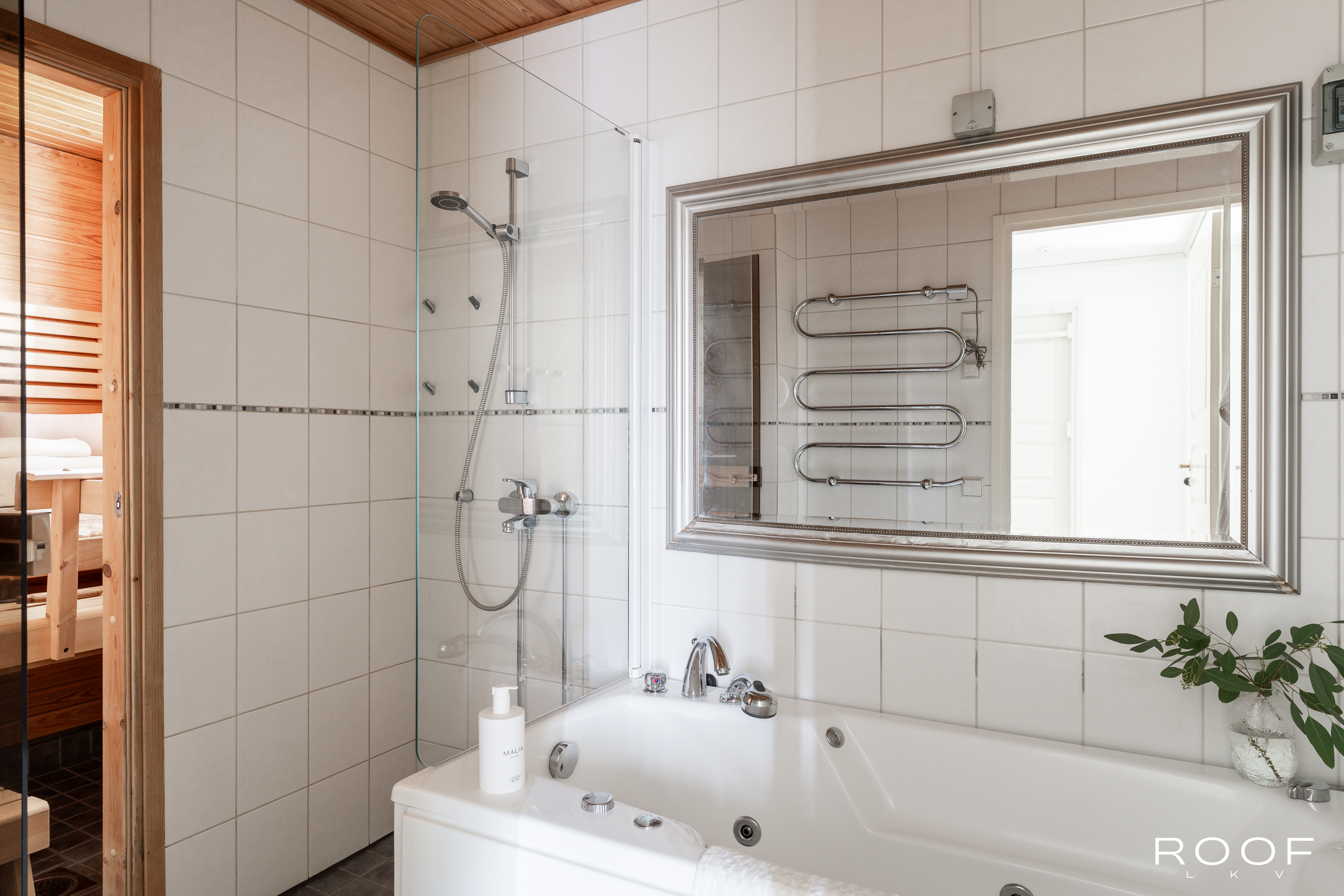 Sisääntulokerroksessa yhdistyvät valoisa olohuone, ruokailutila ja keittiö, joiden rinnalla toimivat tilava eteinen sekä erillinen kodinhoitotila- ja wc. Yläkerrasta löytyy kaksi isoa makuuhuonetta, joista päämakuuhuoneen yhteydessä oma vaatehuone/työhuone. Kylpyhuoneen amme, suihku ja ikkunallinen sauna viimeistelevät kodikkaan tunnelman.