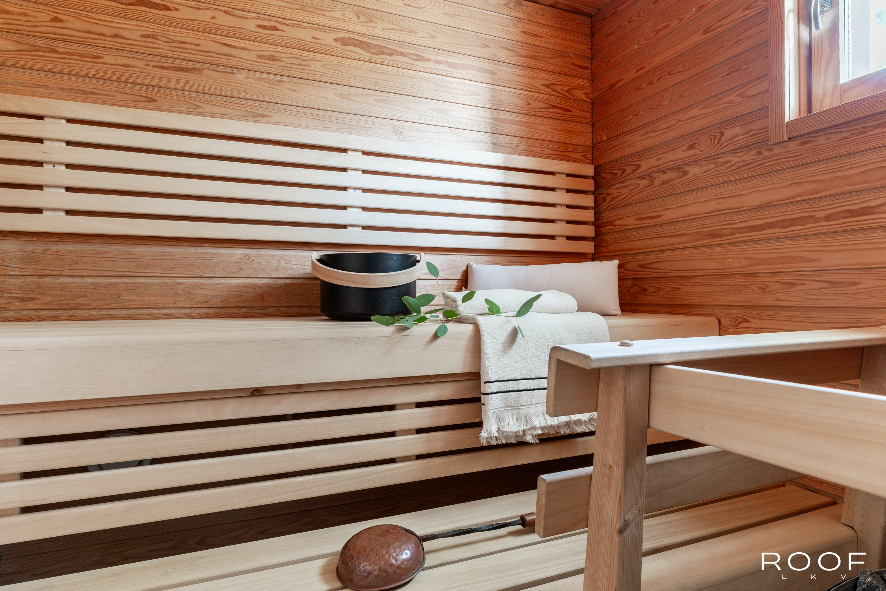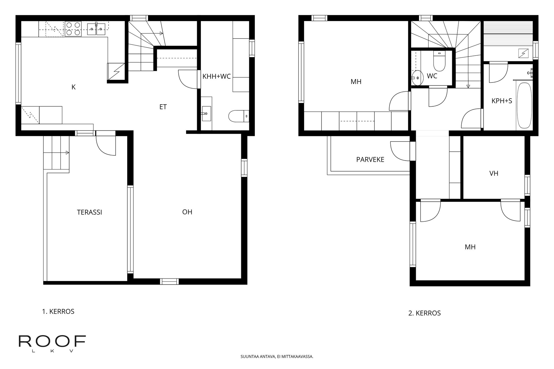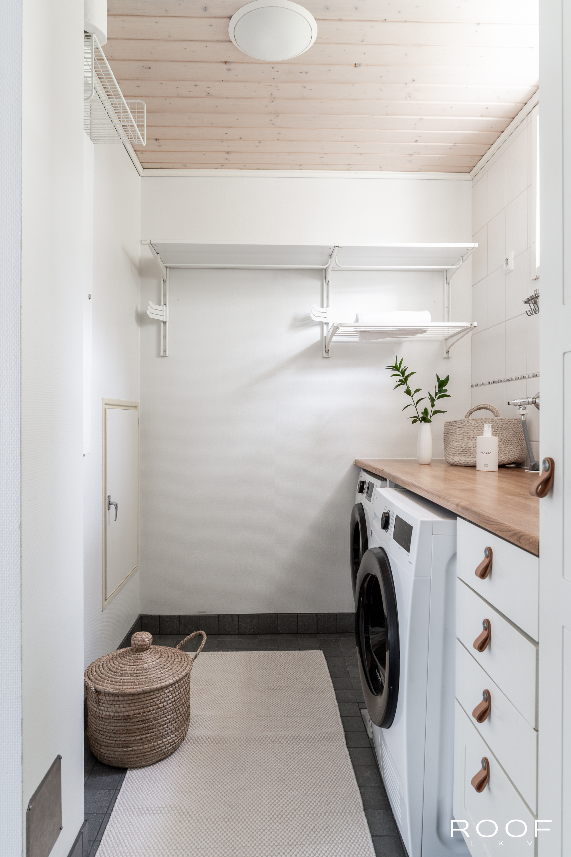 Sisääntulokerroksessa yhdistyvät valoisa olohuone, ruokailutila ja keittiö, joiden rinnalla toimivat tilava eteinen sekä erillinen kodinhoitotila- ja wc. Yläkerrasta löytyy kaksi isoa makuuhuonetta, joista päämakuuhuoneen yhteydessä oma vaatehuone/työhuone. Kylpyhuoneen amme, suihku ja ikkunallinen sauna viimeistelevät kodikkaan tunnelman.
