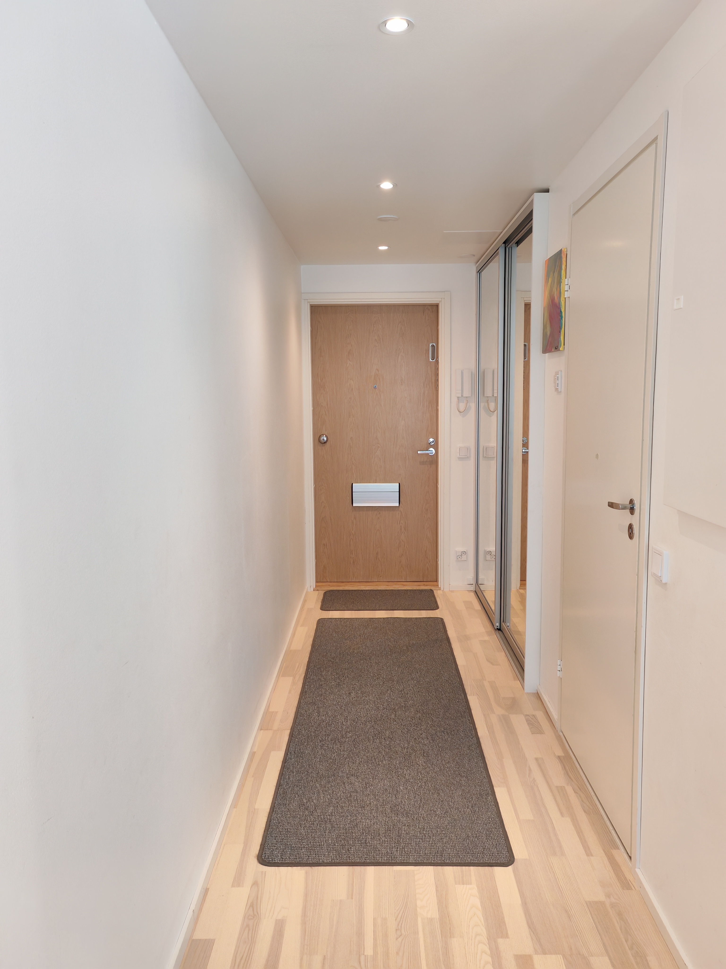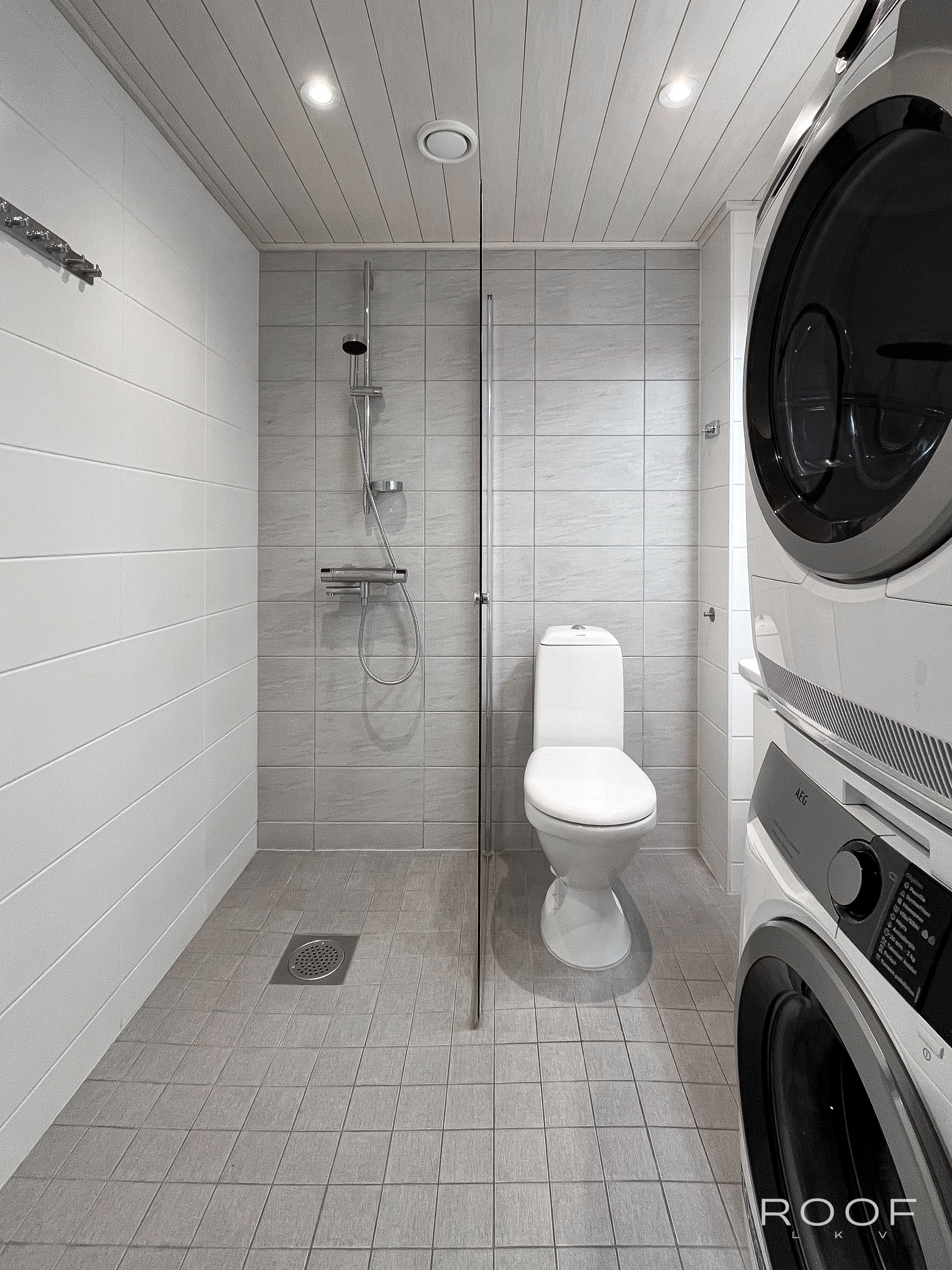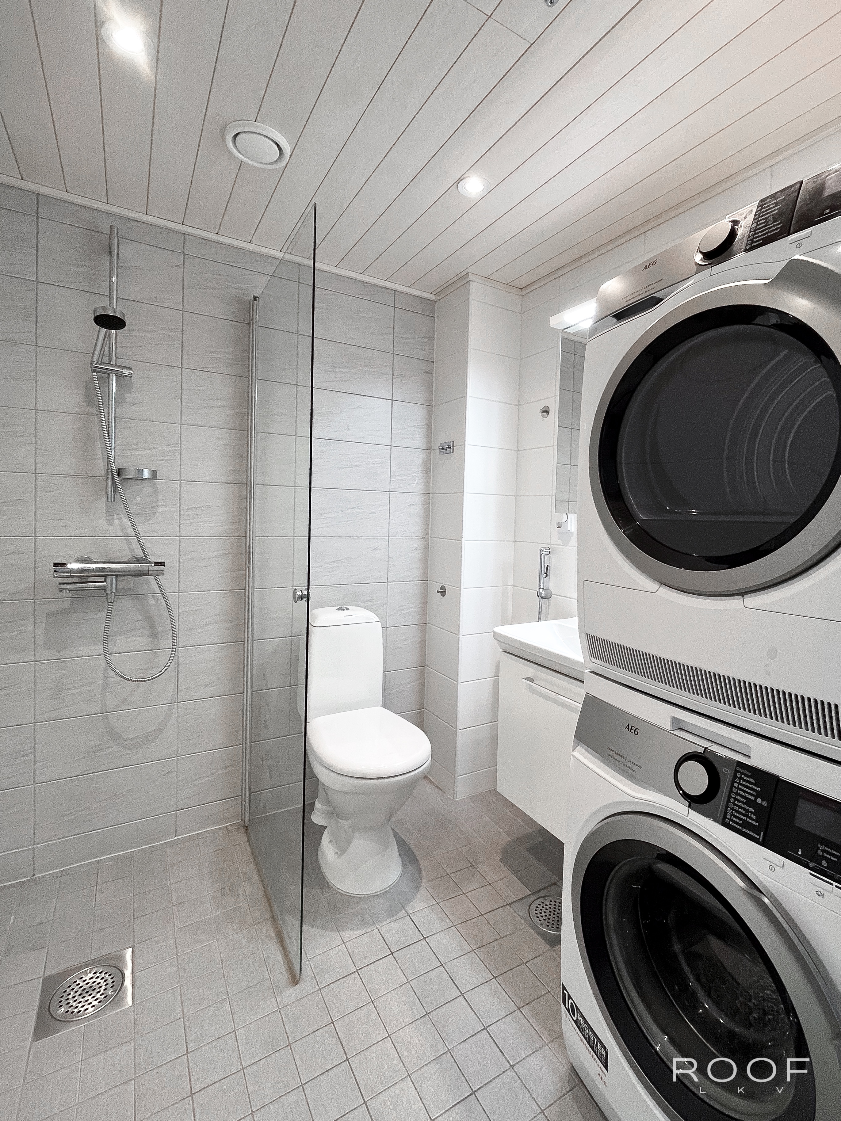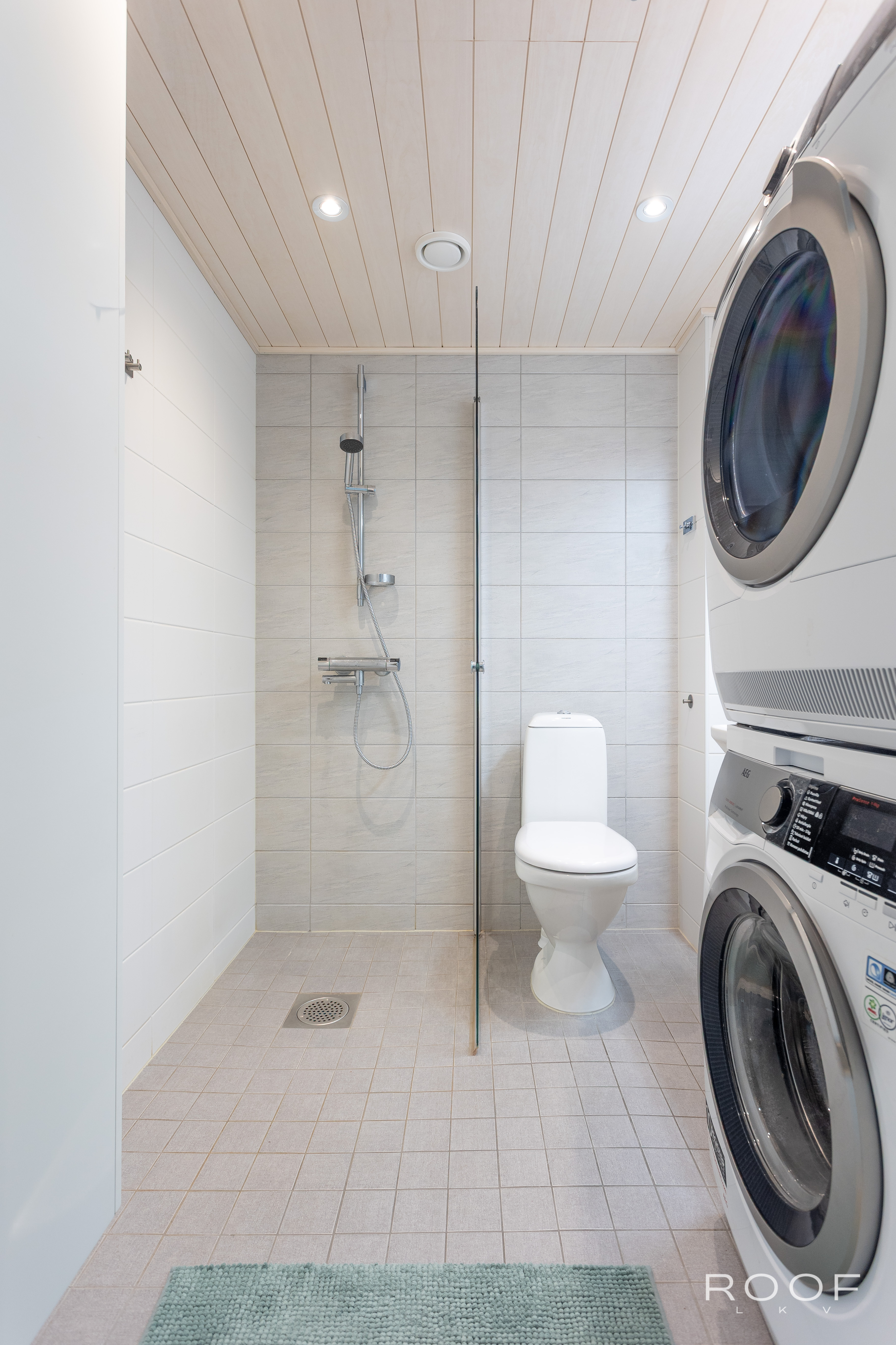 Molemmissa makuuhuoneissa on omat säilytyskaapistot, ja lisää tilaa löytyy eteisestä. Tilavaan kylpyhuoneeseen mahtuvat hyvin sekä pesukone että kuivausrumpu.