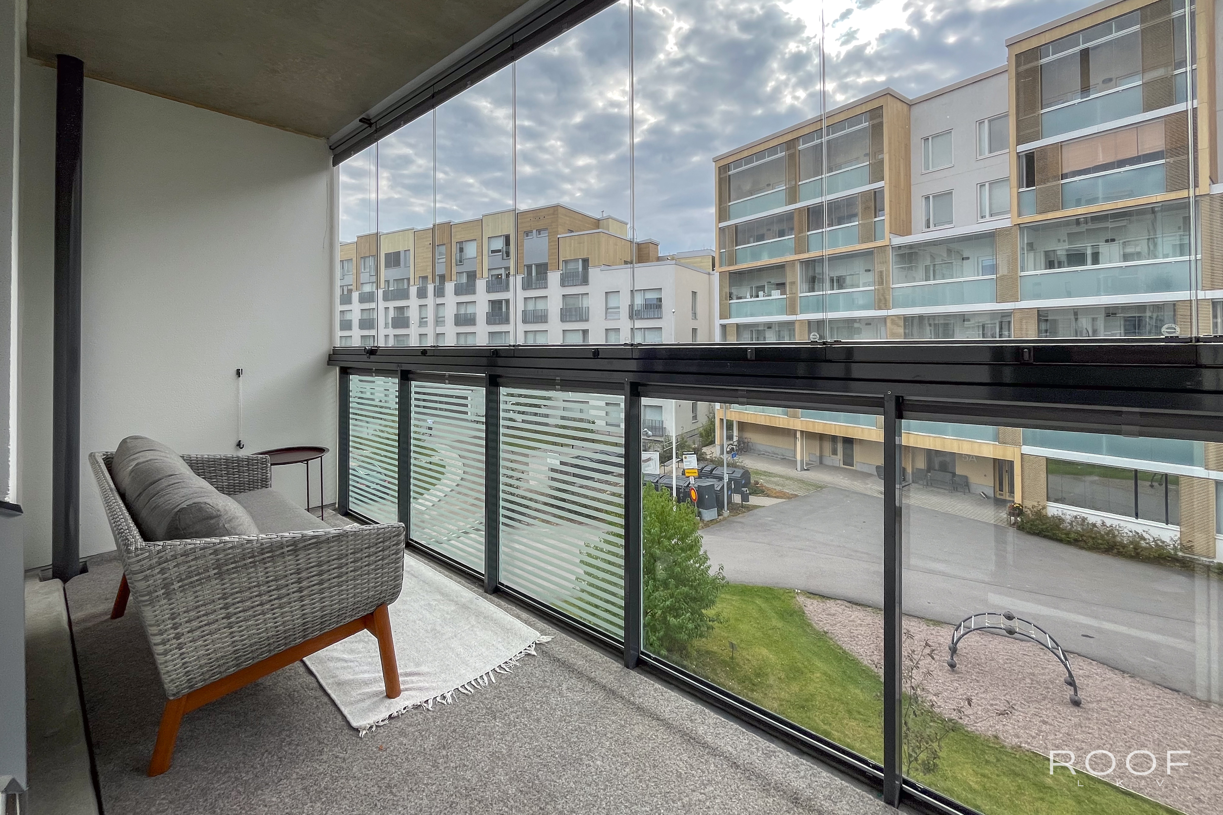 Olohuoneesta avautuu koko huoneiston levyinen parveke, jonka toinen puoli on lasitettu. Lisäksi kauppahintaan kuuluu lasitetulle puolelle mittatilaustyönä teetätetyt Visor-kaihtimet (visor.fi). Täydellinen paikka, joka tuo myös runsaasti käytännöllistä lisätilaa ja yksityisyyttä asuntoon.