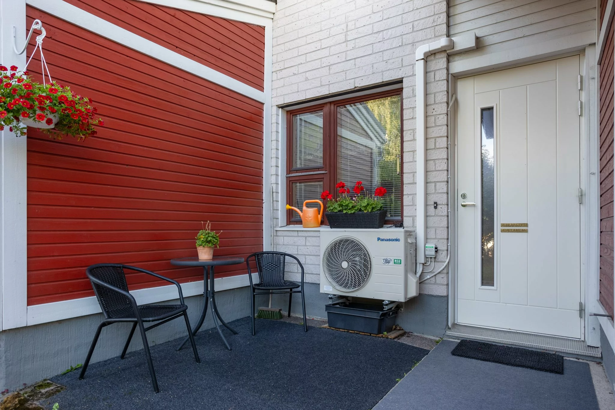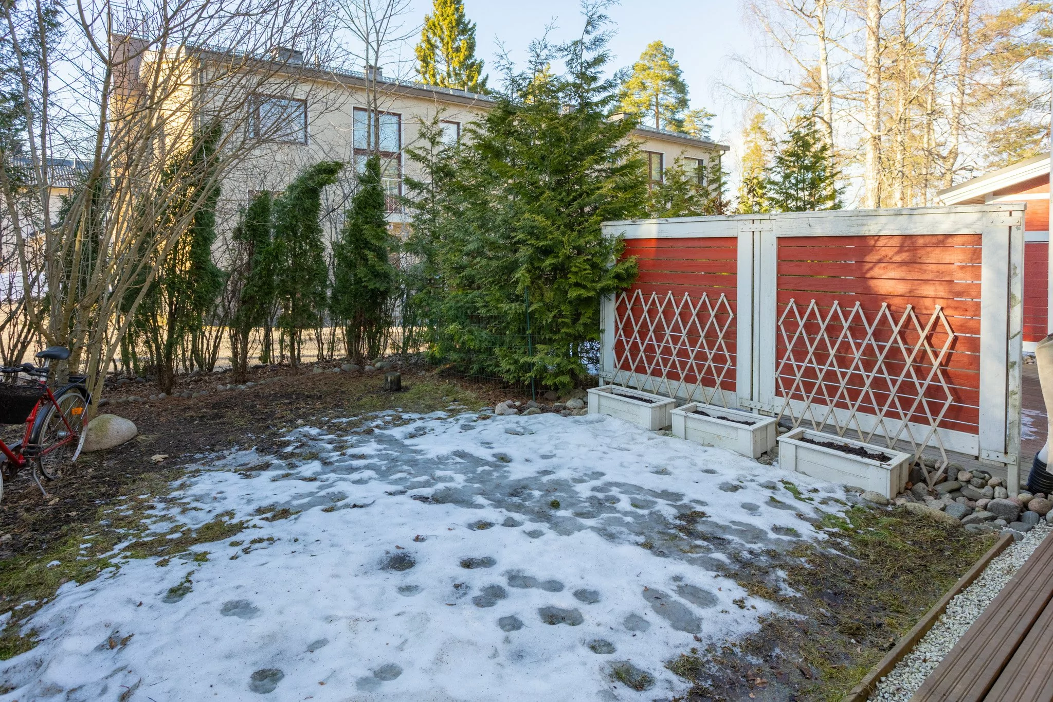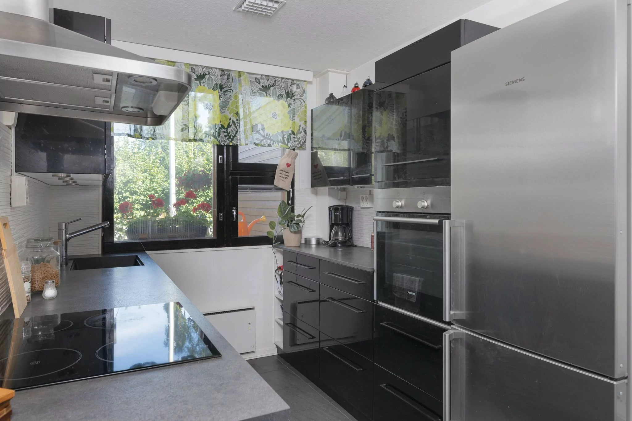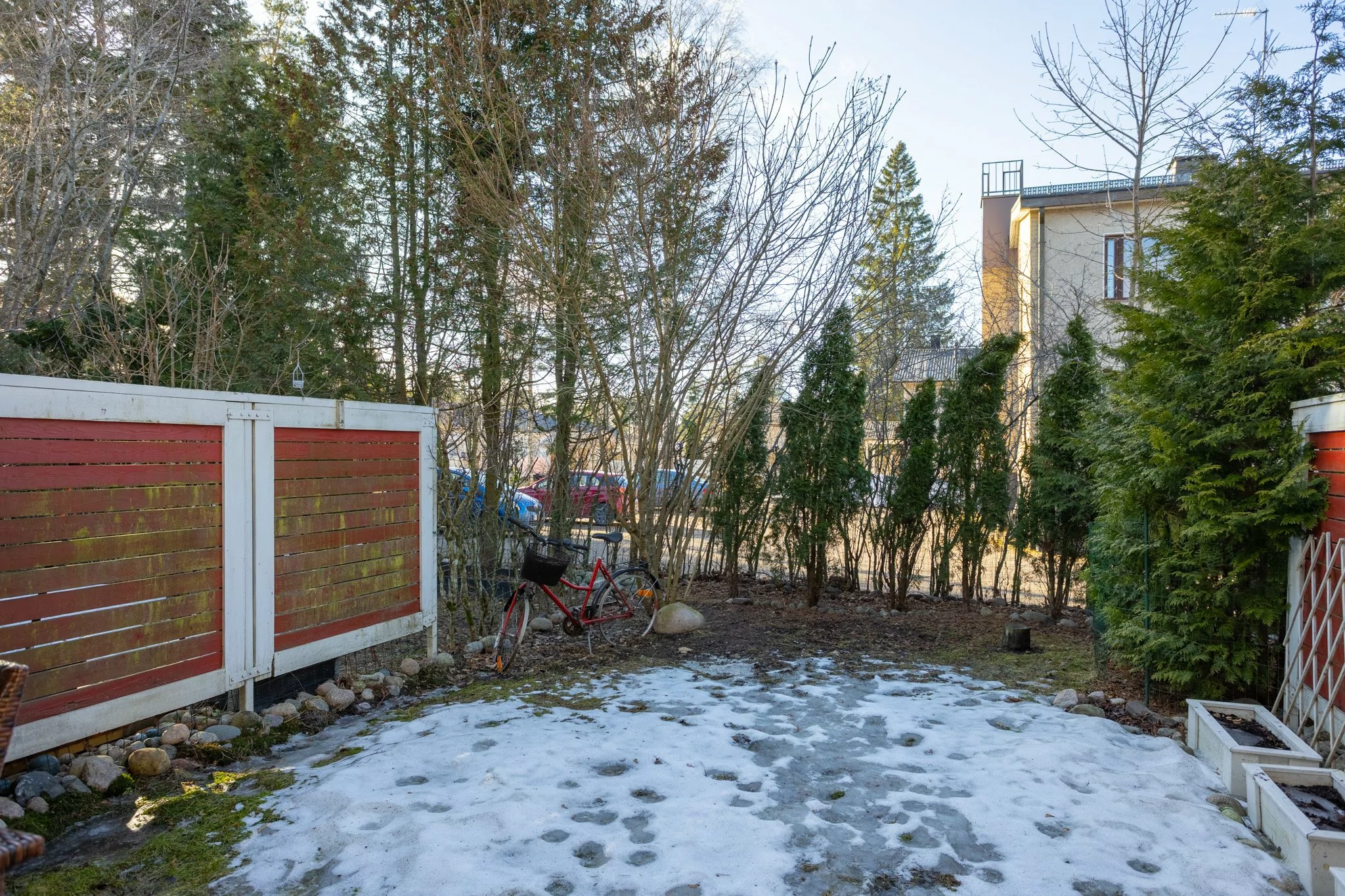 Alakerrassa on erillinen keittiö, jonka kaapistot ja kodinkoneet on uusittu vuonna 2006. Valoisa olohuone avautuu terassille ja omalle pihalle. Lisäksi alakerrassa on erillinen WC ja tuulikaappi. Sisäänkäynnin yhteydessä on varasto. Vuonna 2024 alakertaan on tehty pintaremontti: väliseinä on purettu, lattia vaihdettu, seinät ja katto maalattu, portaat hiottu ja maalattu sekä ikkunakarmit maalattu.