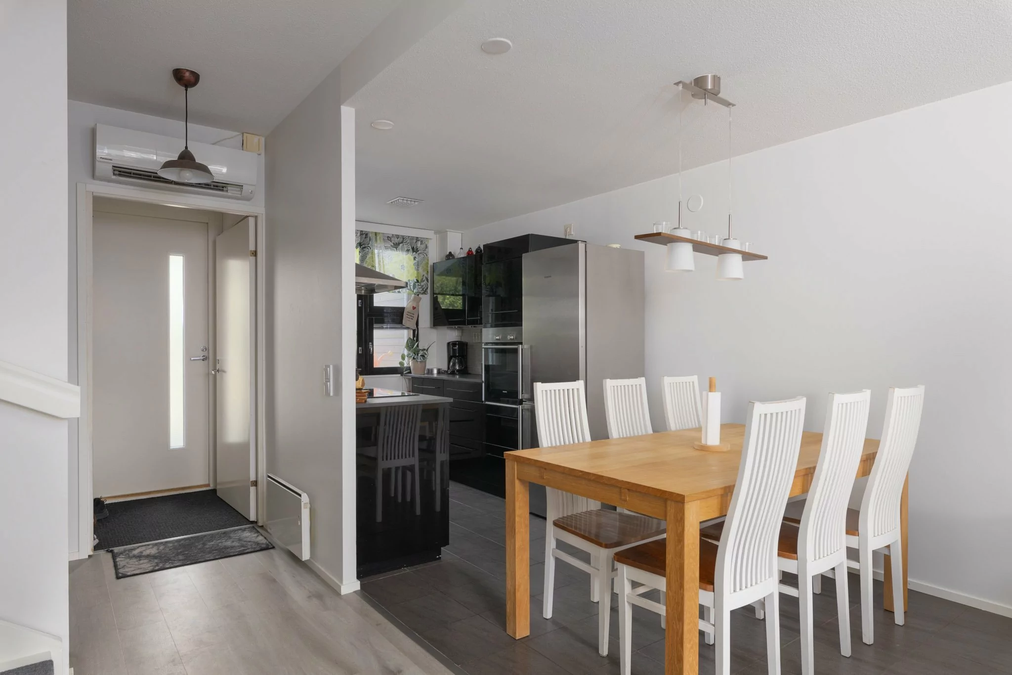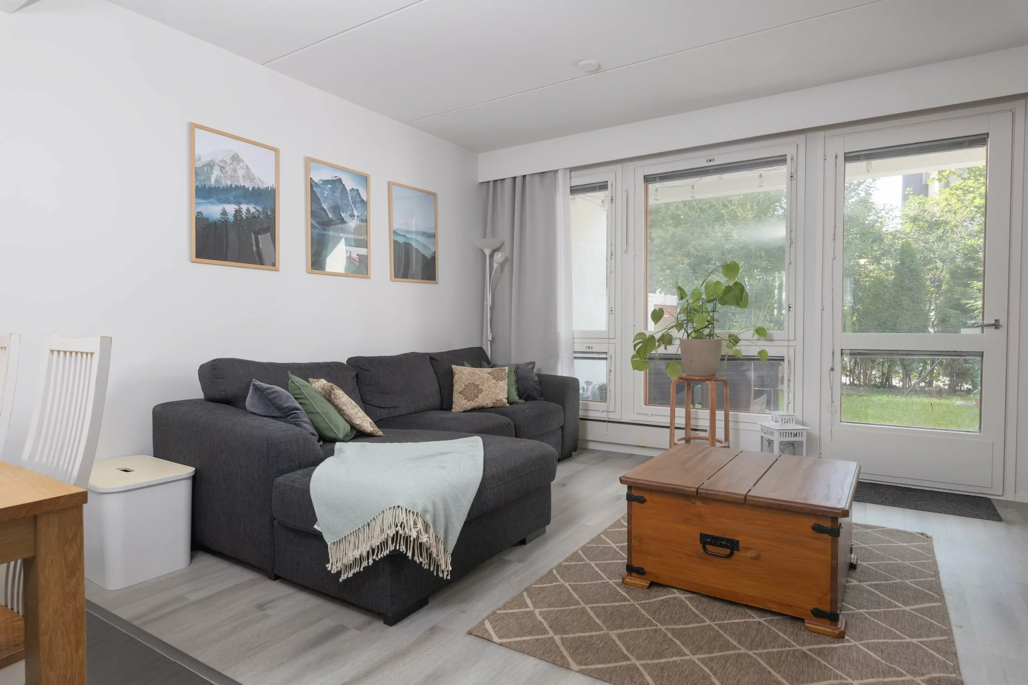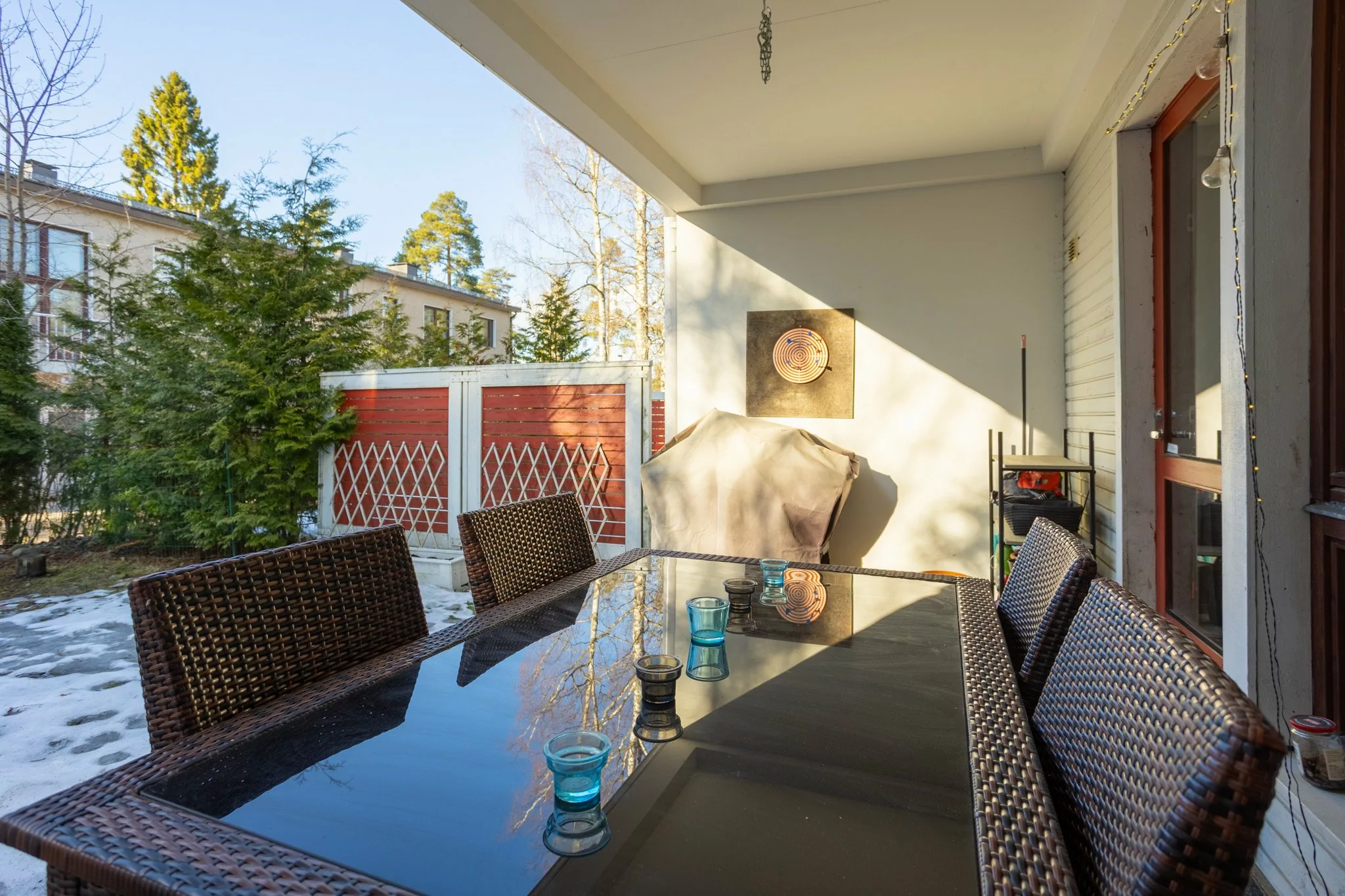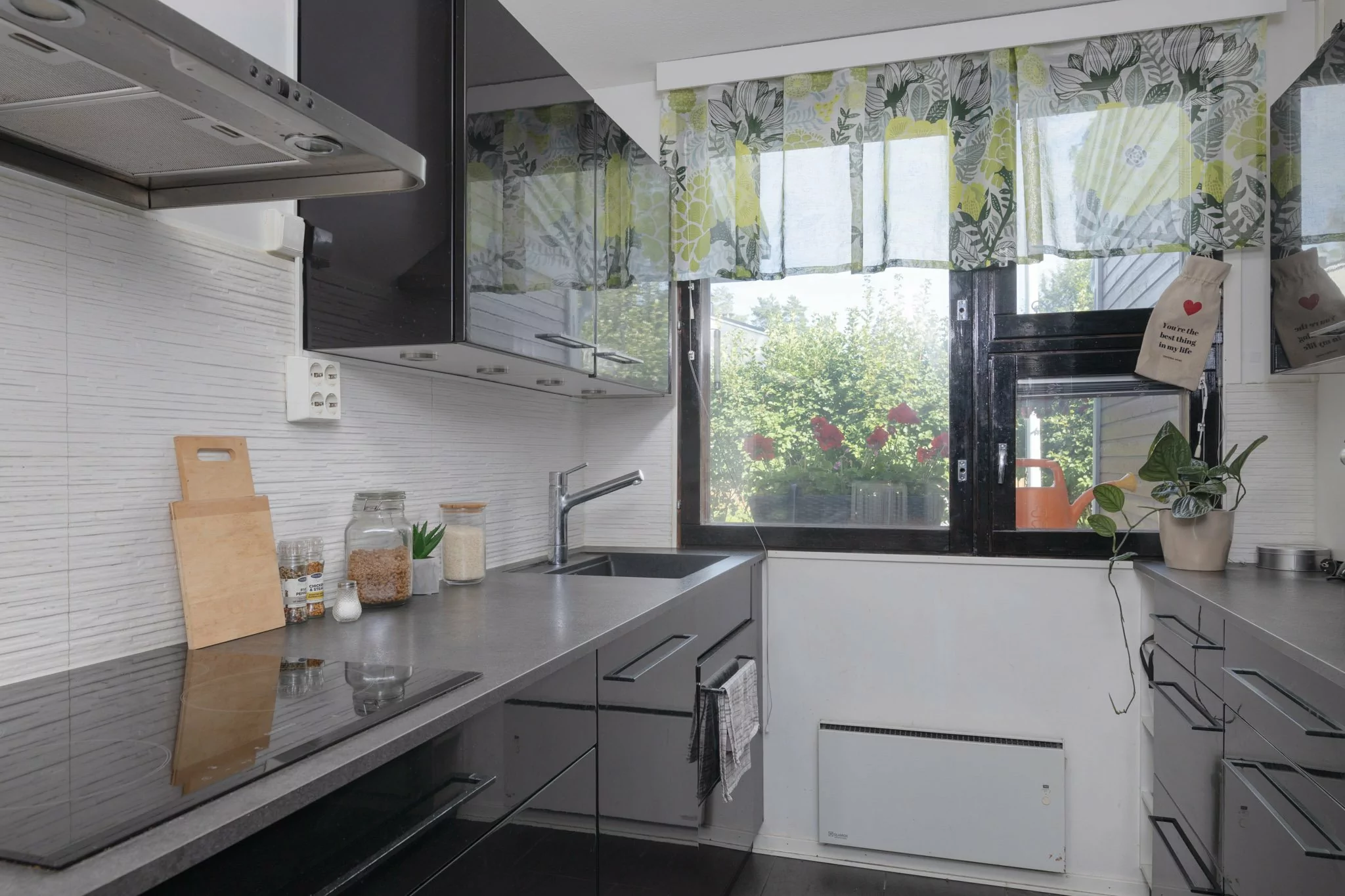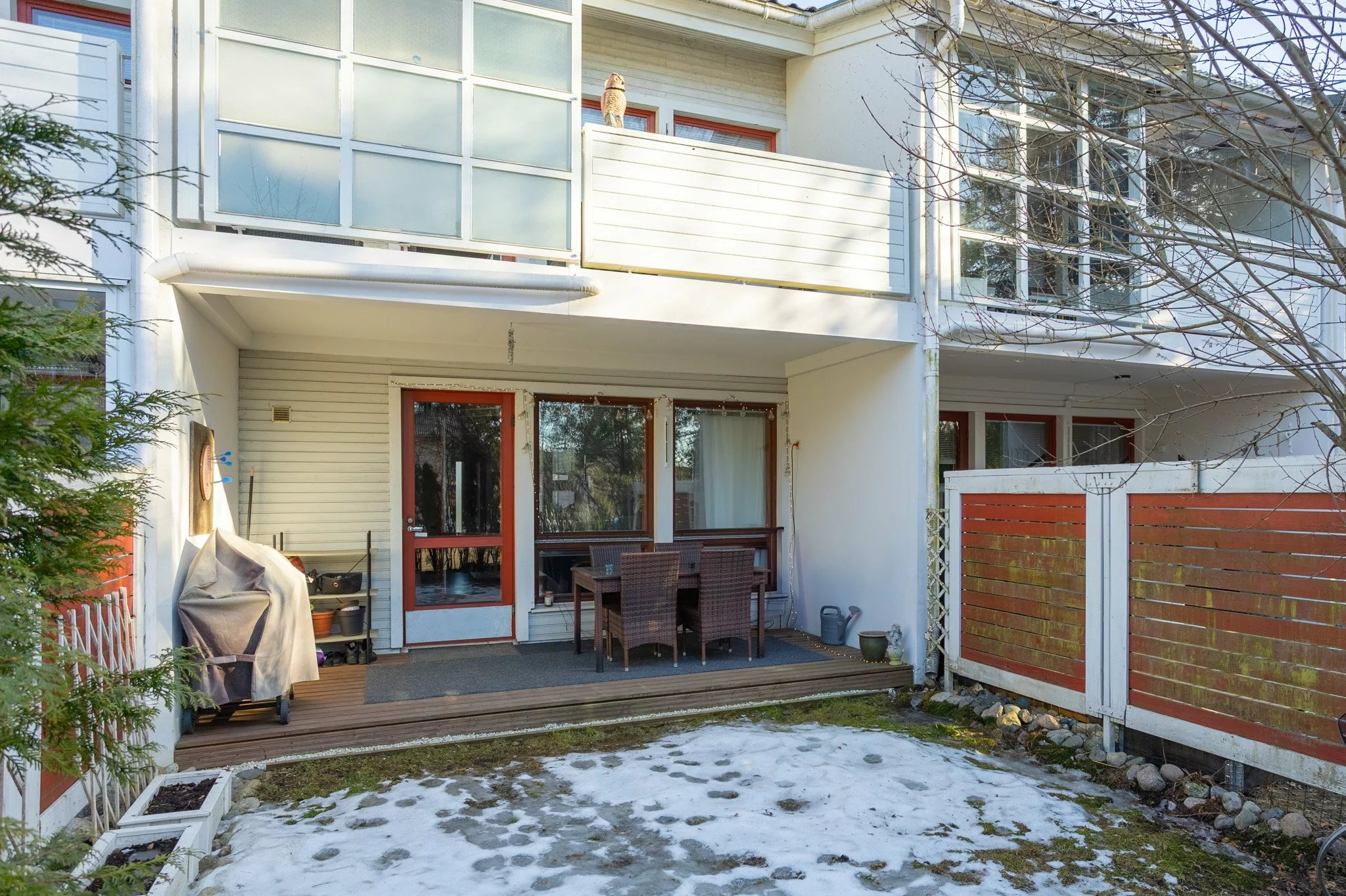Alakerrassa on erillinen keittiö, jonka kaapistot ja kodinkoneet on uusittu vuonna 2006. Valoisa olohuone avautuu terassille ja omalle pihalle. Lisäksi alakerrassa on erillinen WC ja tuulikaappi. Sisäänkäynnin yhteydessä on varasto. Vuonna 2024 alakertaan on tehty pintaremontti: väliseinä on purettu, lattia vaihdettu, seinät ja katto maalattu, portaat hiottu ja maalattu sekä ikkunakarmit maalattu.