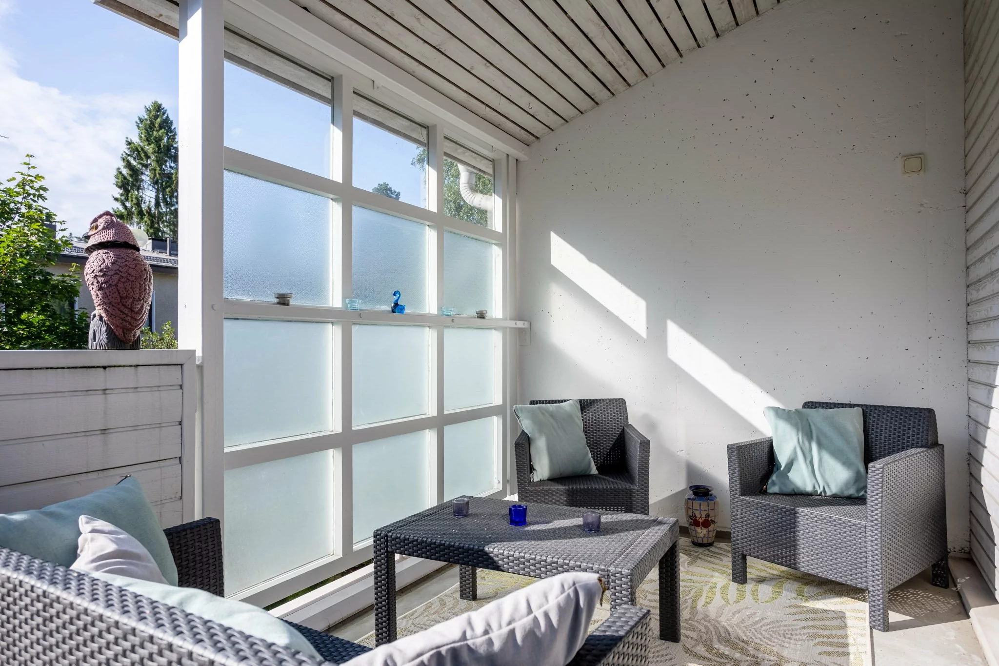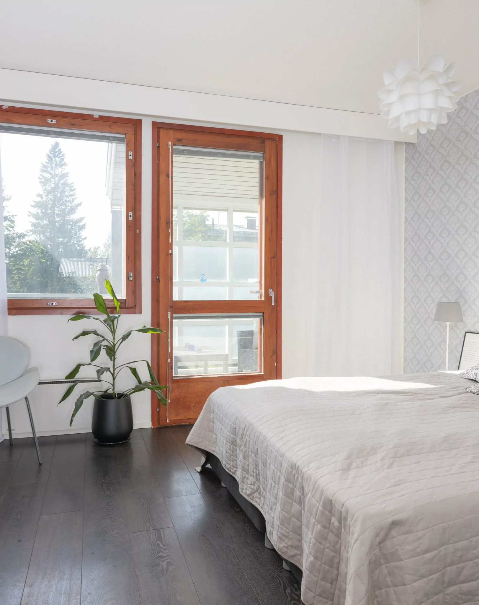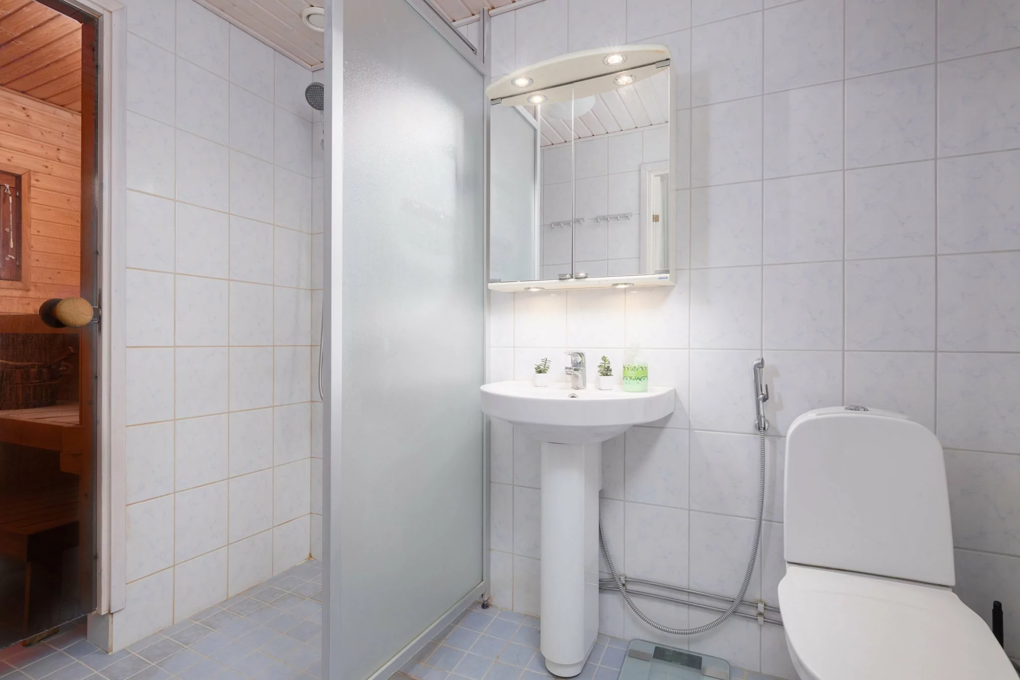 Yläkerrassa on kaksi makuuhuonetta, joista toisen yhteydessä on parveke. Tilava kylpyhuone ja sauna on uusittu vuonna 2003, ja käytännöllisyyttä lisää erillinen vaatehuone.