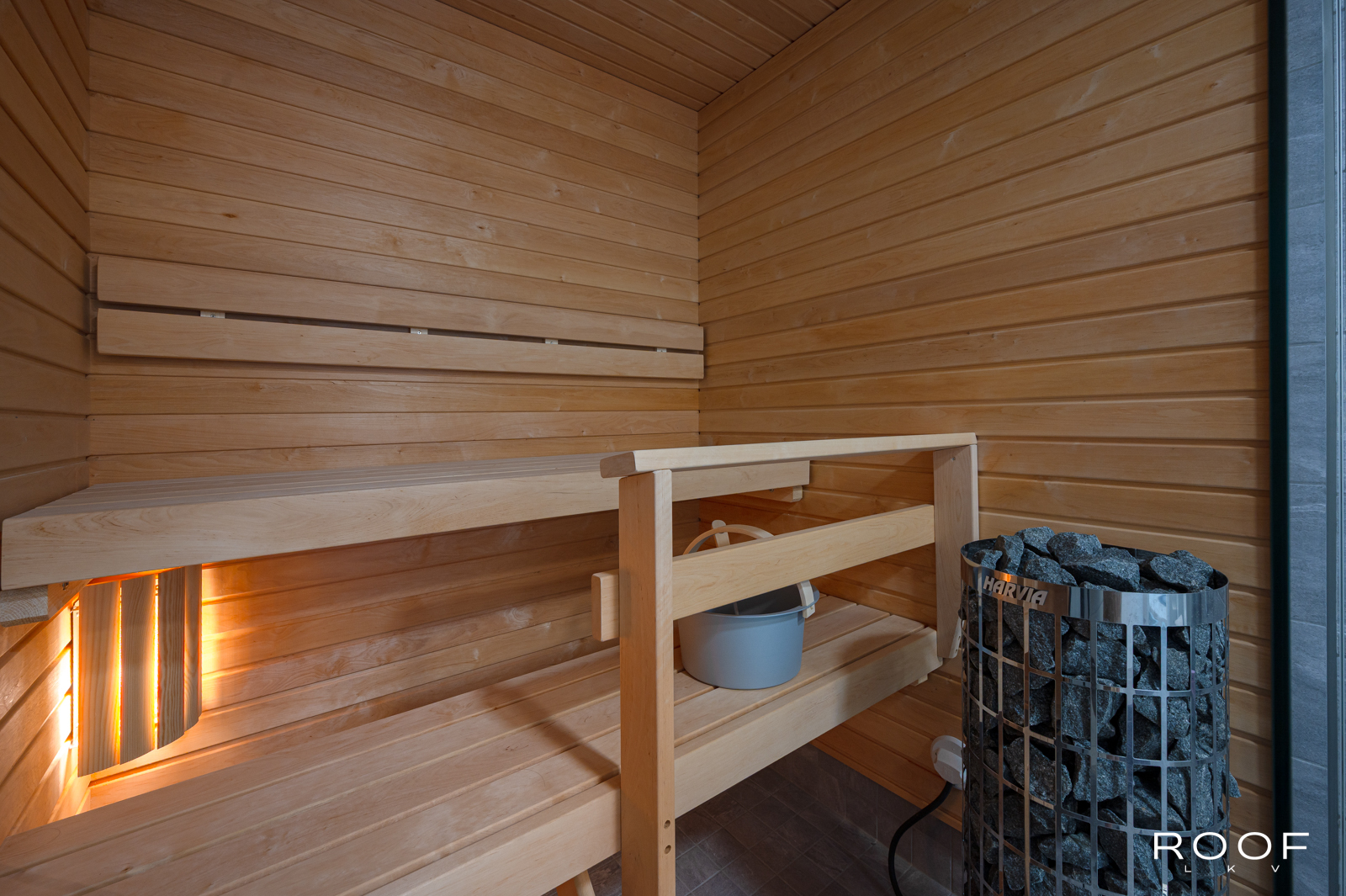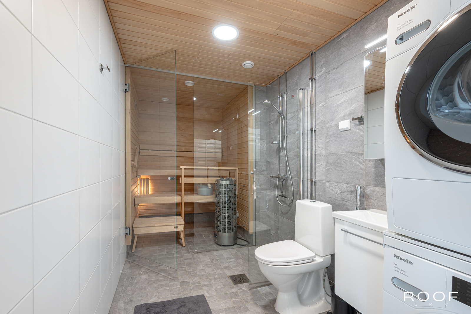 Tilava kylpyhuone sekä oma sauna viimeistelevät tämän toimivan kokonaisuuden arjen luksusta omassa kodissa.