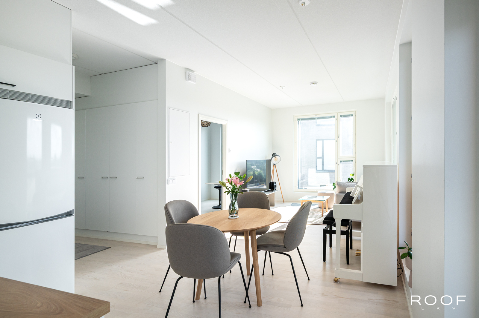 Moderni avokeittiö ilahduttaa vaaleilla sävyillään ja tarjoaa erinomaiset työ- ja säilytystilat kotikokkaajalle. Keittiö avautuu luontevasti valoisaan olohuoneeseen, josta on kulku länteen avautuvalle, suurelle lasitetulle parvekkeelle täydellinen paikka rentoutumiseen ilta-auringossa.