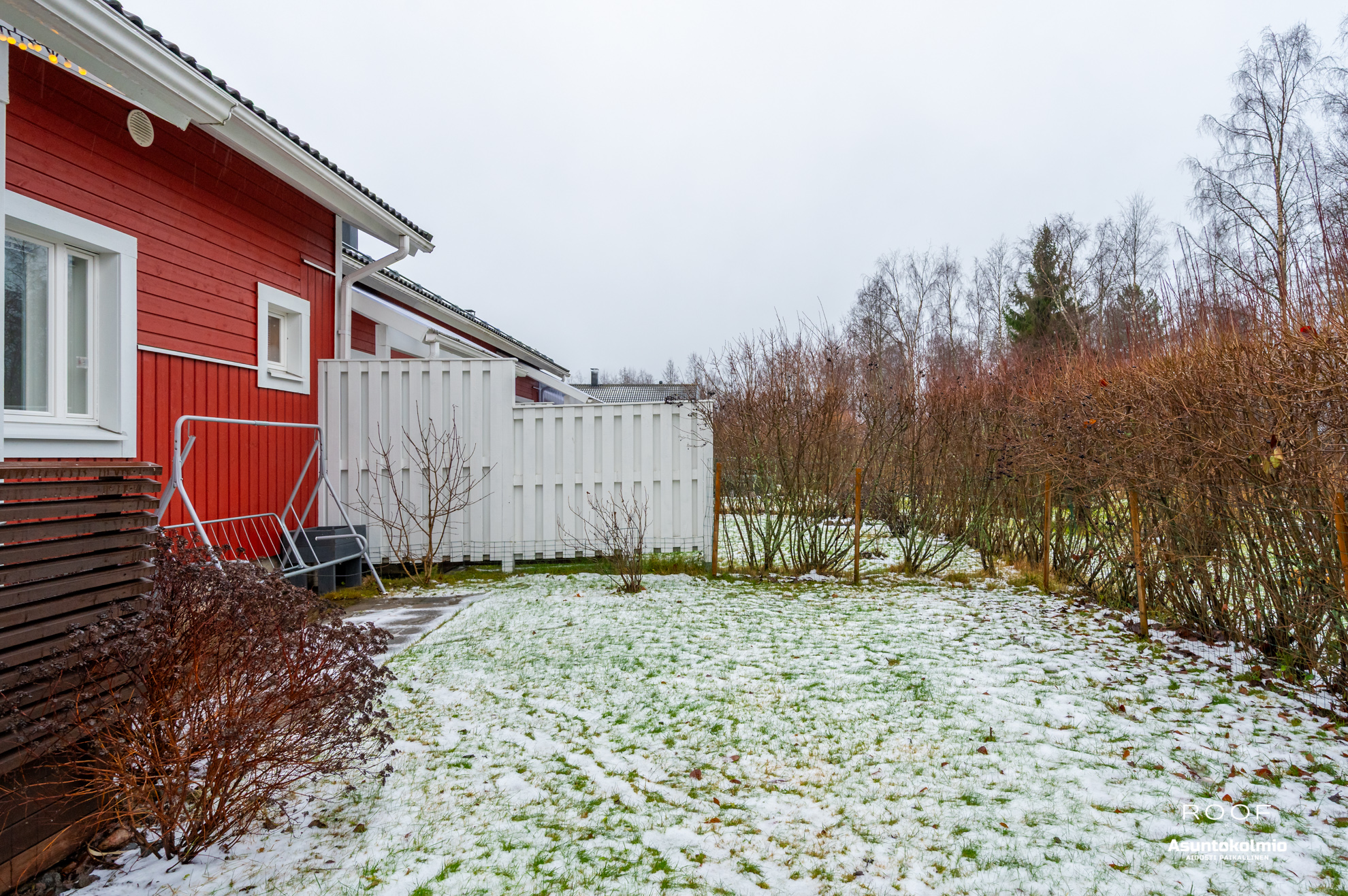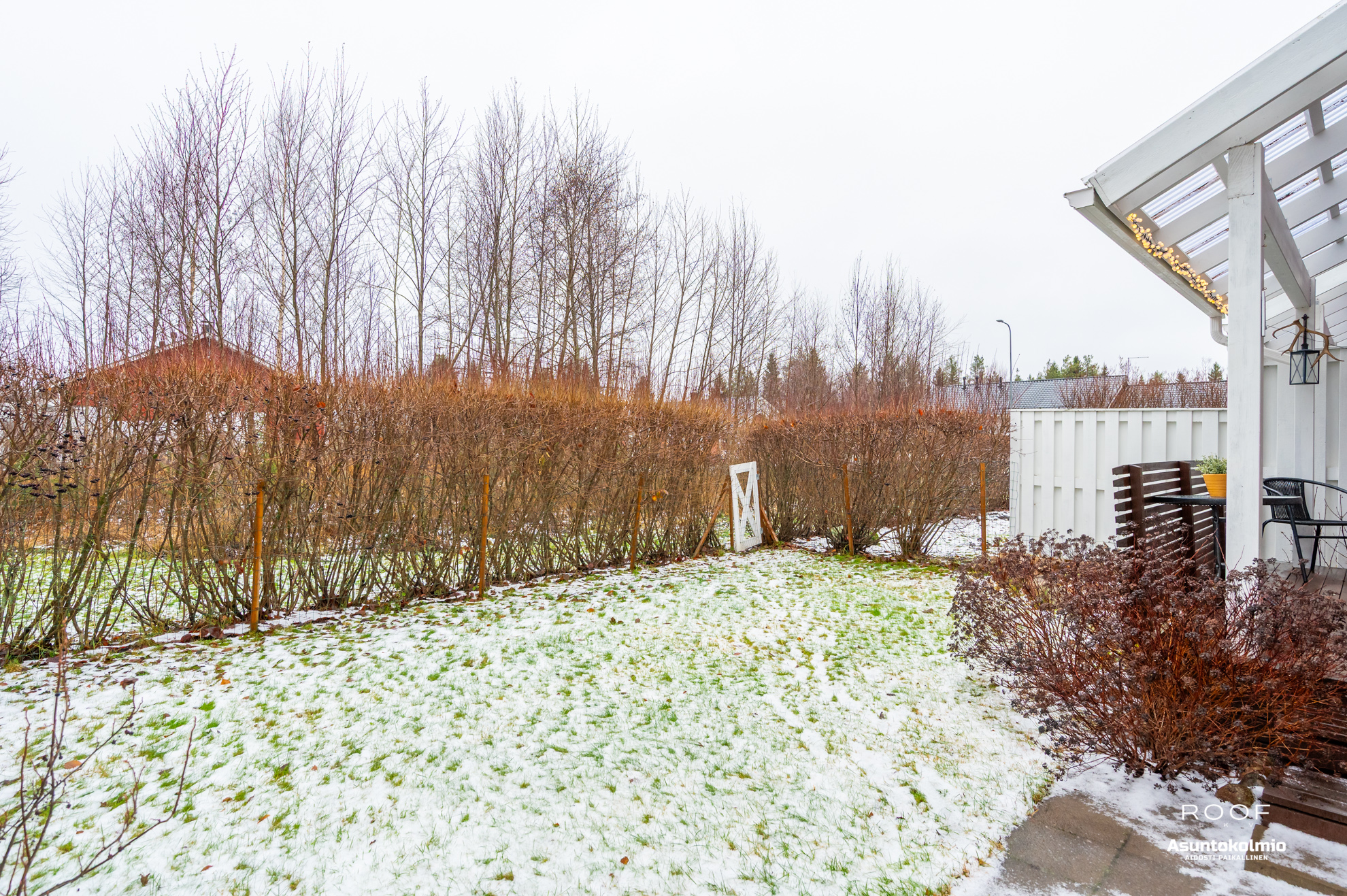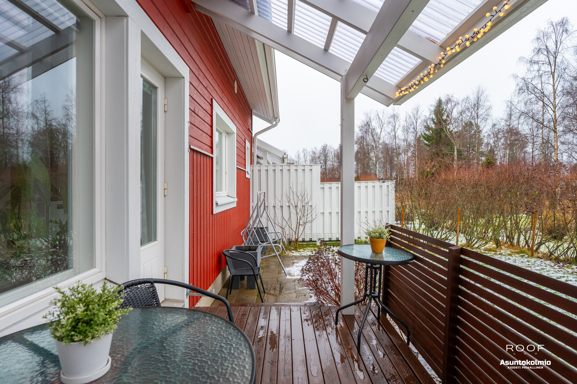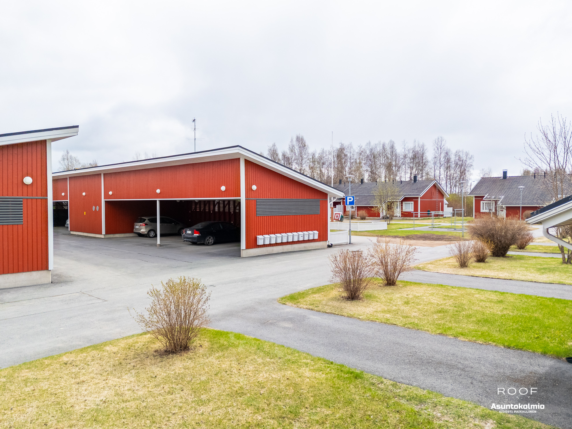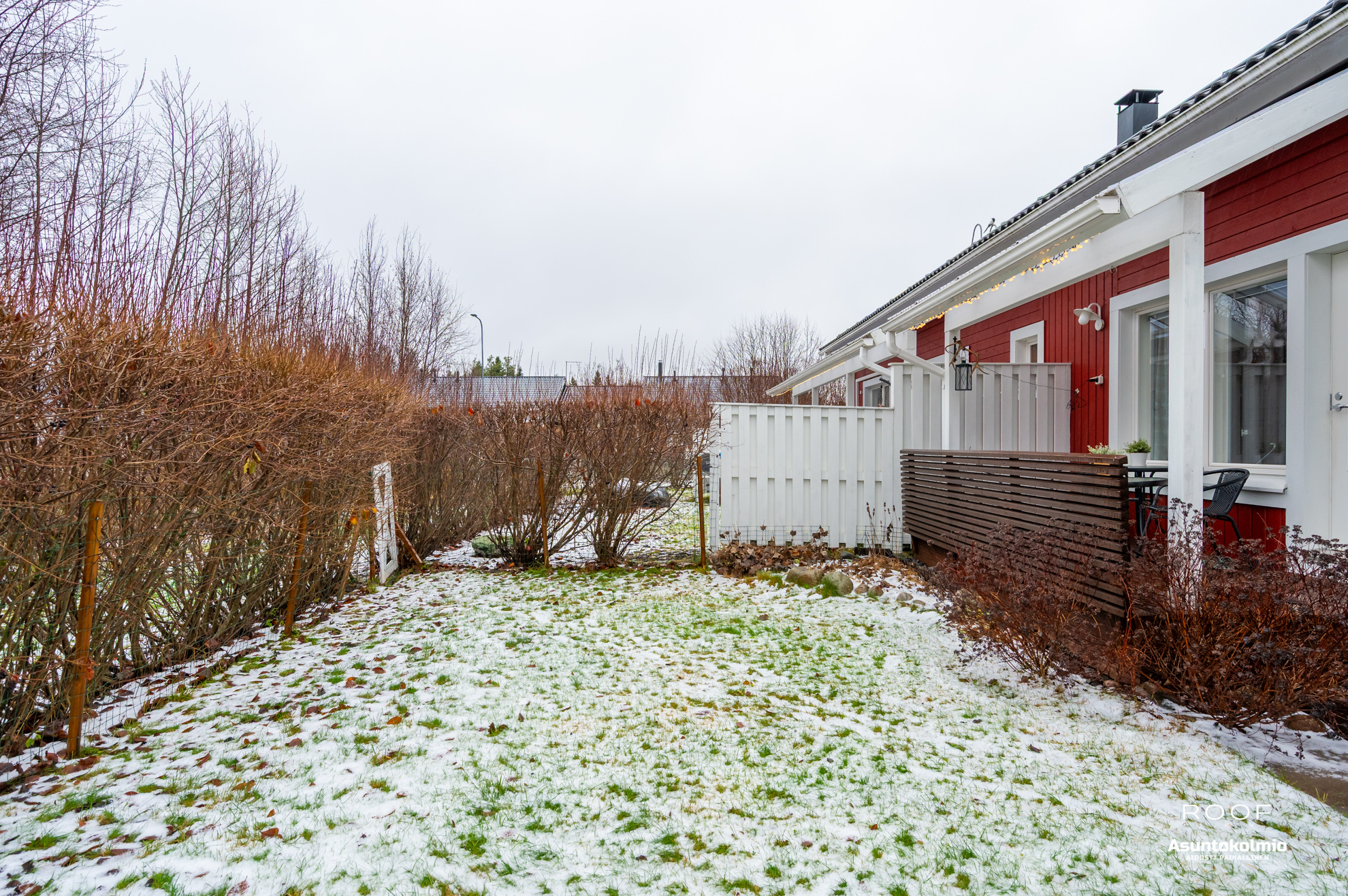 Suojaisalla, pensasaidan rajaamalla takapihalla on katettu terassi, joka avautuu ilta-auringon suuntaan länteen. Asunnon mukana myydään autokatospaikka erillisenä osakkeena hintaan 2 000 euroa.