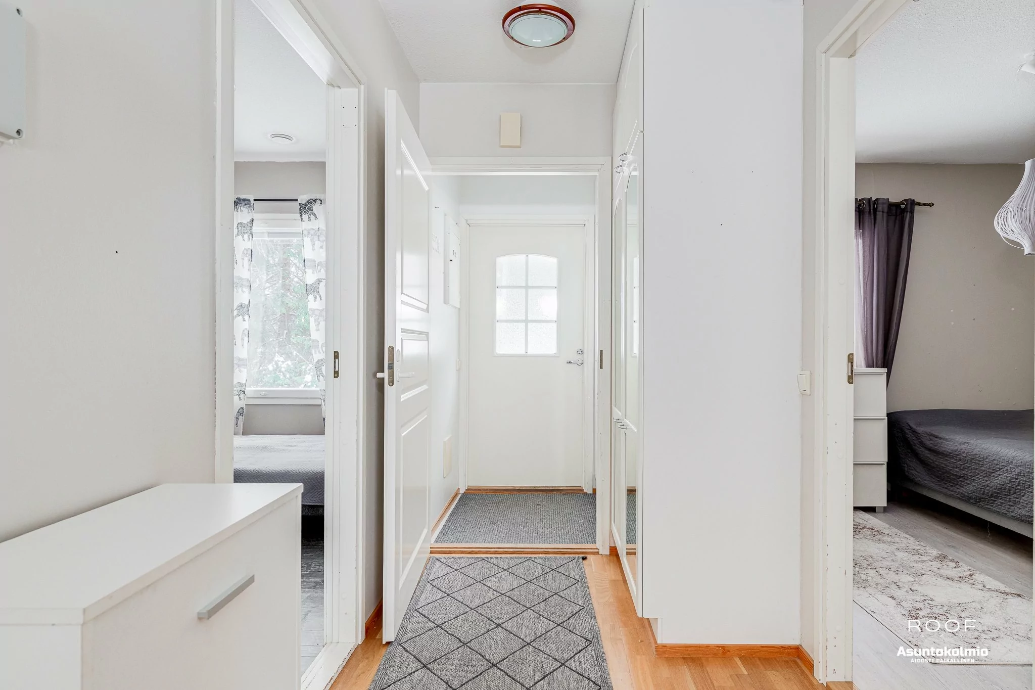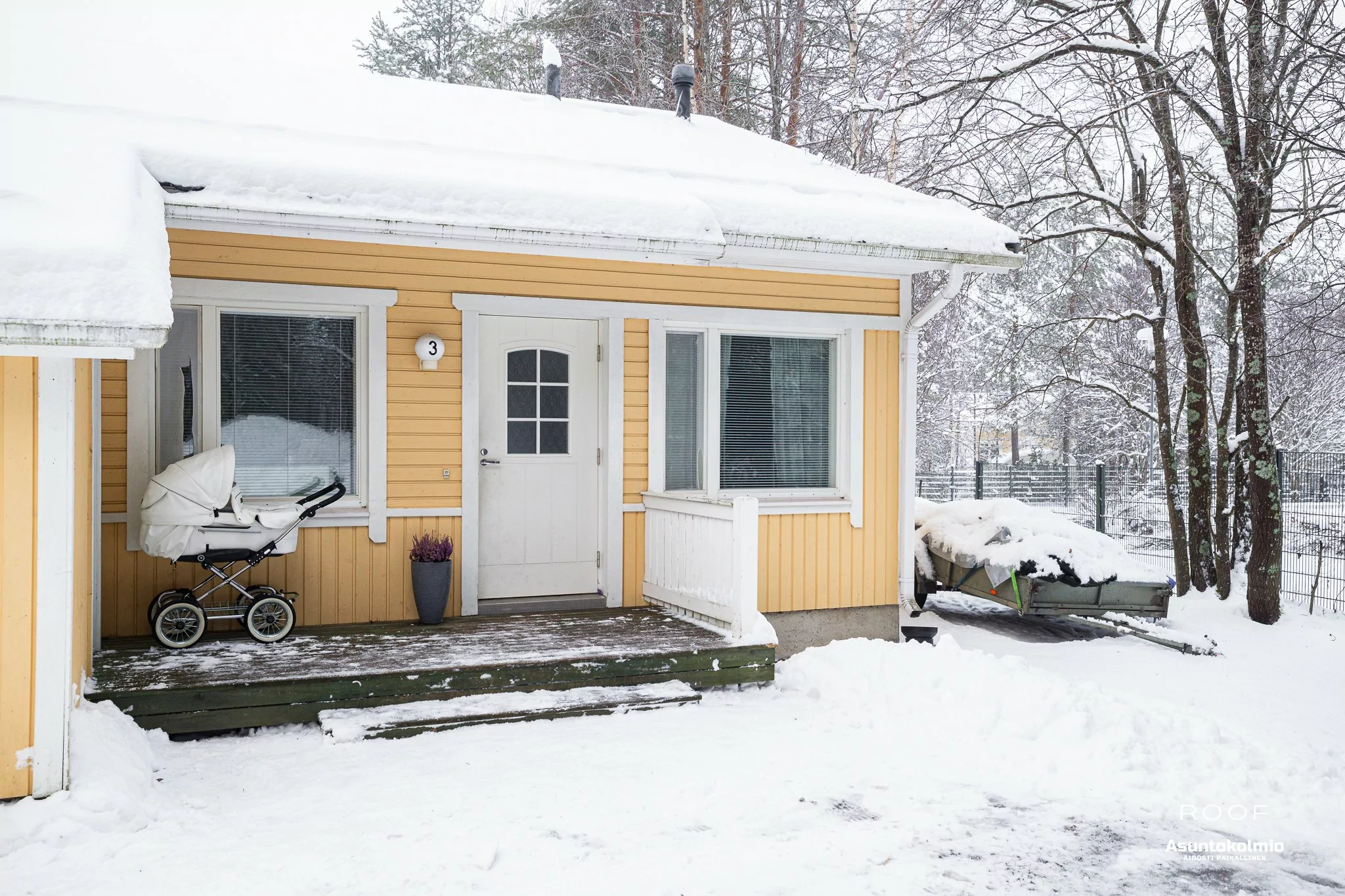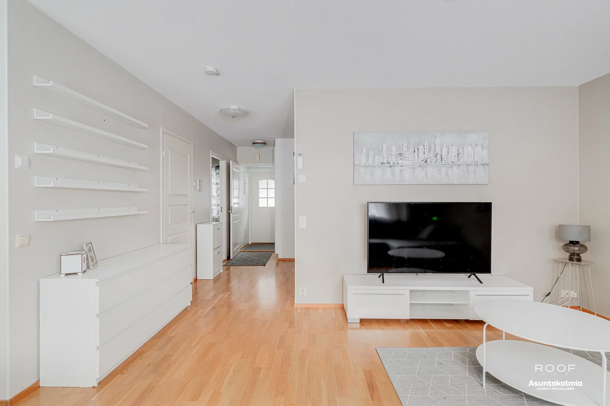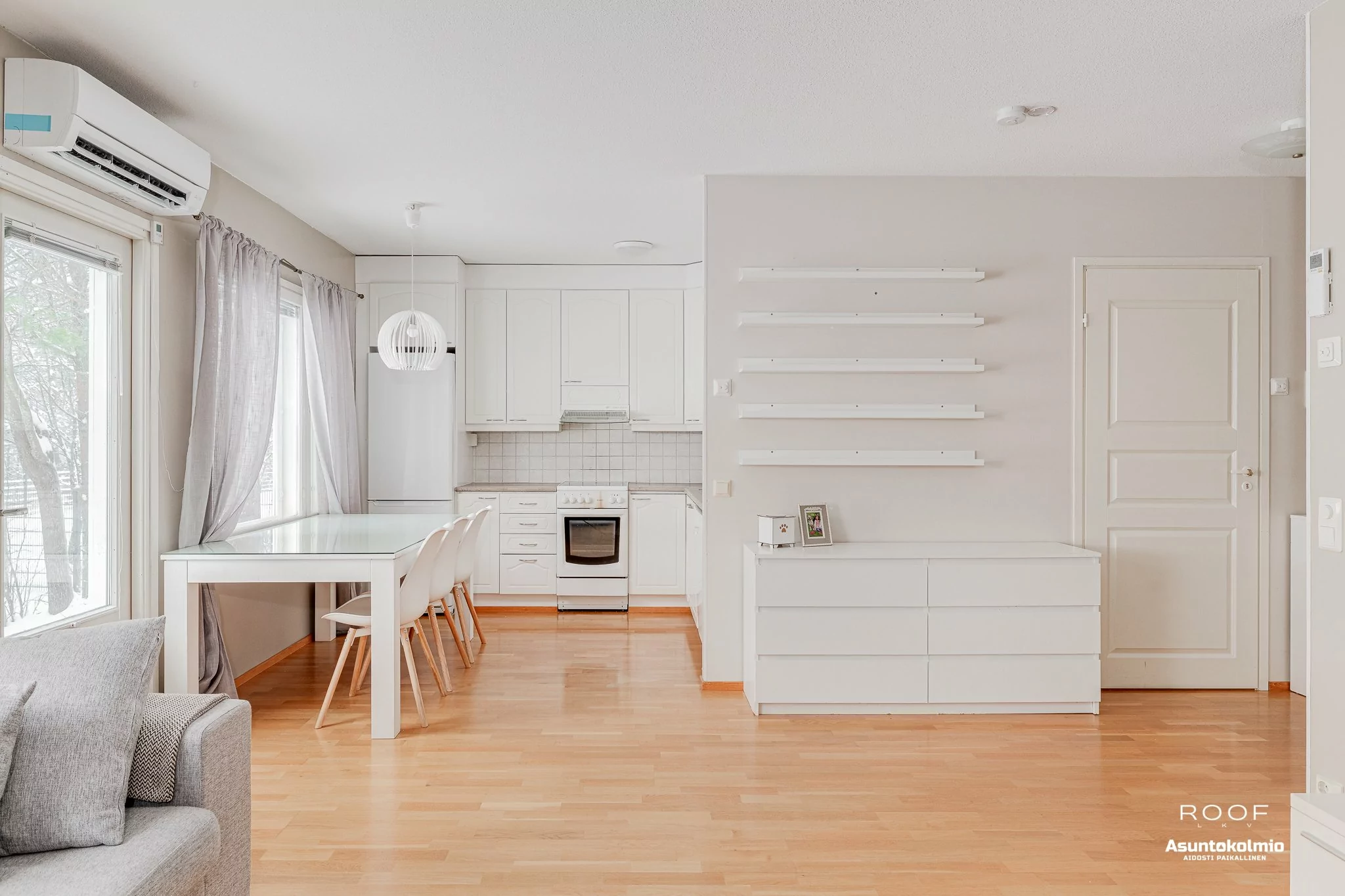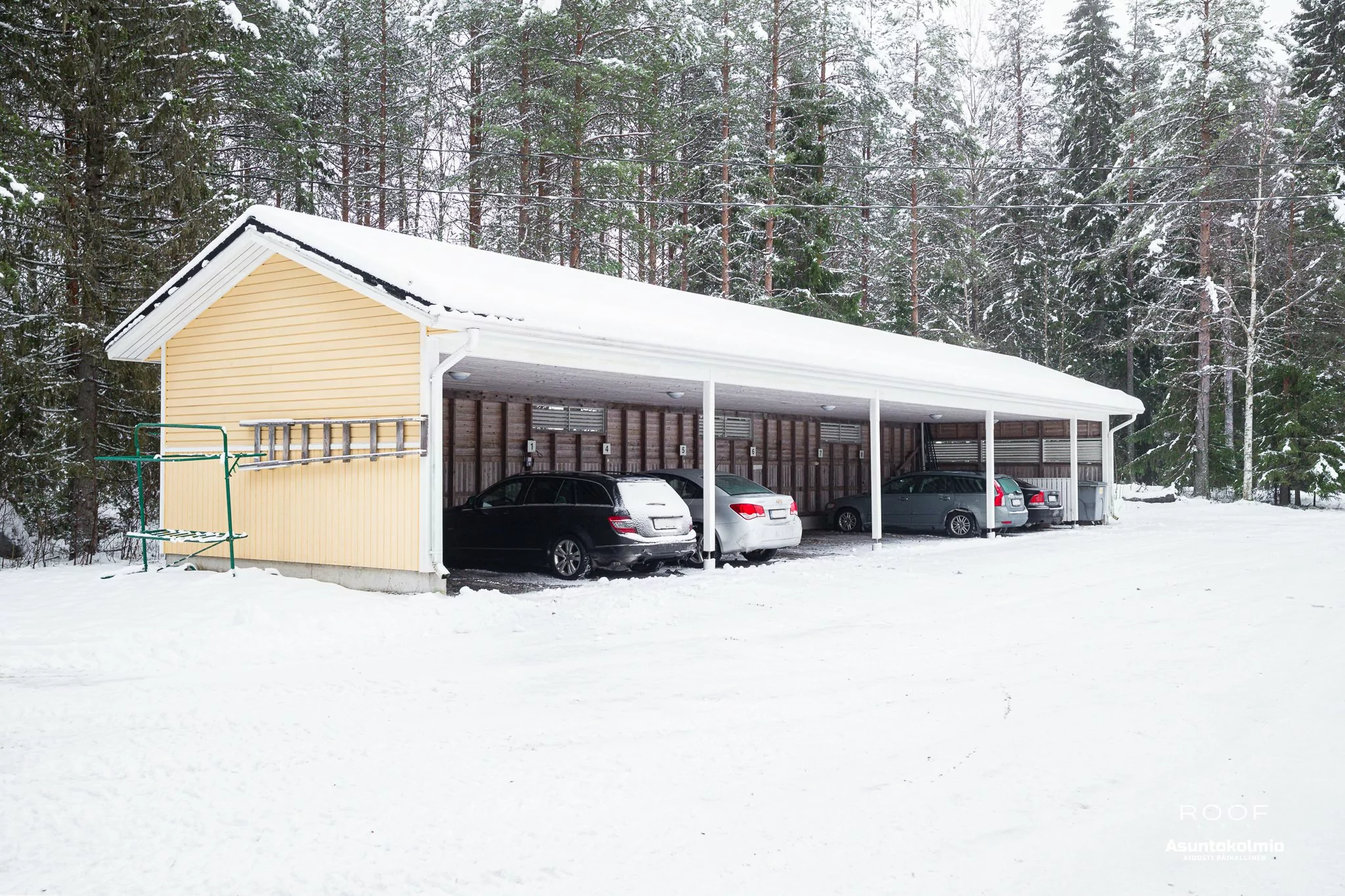 Olohuone on tilava ja valoisa. Olohuoneen yhteyteen sijoittuu keittiö, jossa hyvin kaappi- ja laskutilaa. Olohuoneesta on kulku omalle hyvän kokoiselle takapihalle. Takapihalle on mahdollista tehdä isompikin terassi. Makuuhuoneita on kaksi ja toisen huoneen yhteyteen sijoituu vaatehuone. Kylpyhuoneen yhteydessä on kodinhoitotila, jossa on kaapistot ja pöytätaso, tilaan on myös pyykkitornille. Sisäänkäynnin yhteydessä on huoneistolle kuuluva kylmä ulkovarasto. Autolle on autokatosp...