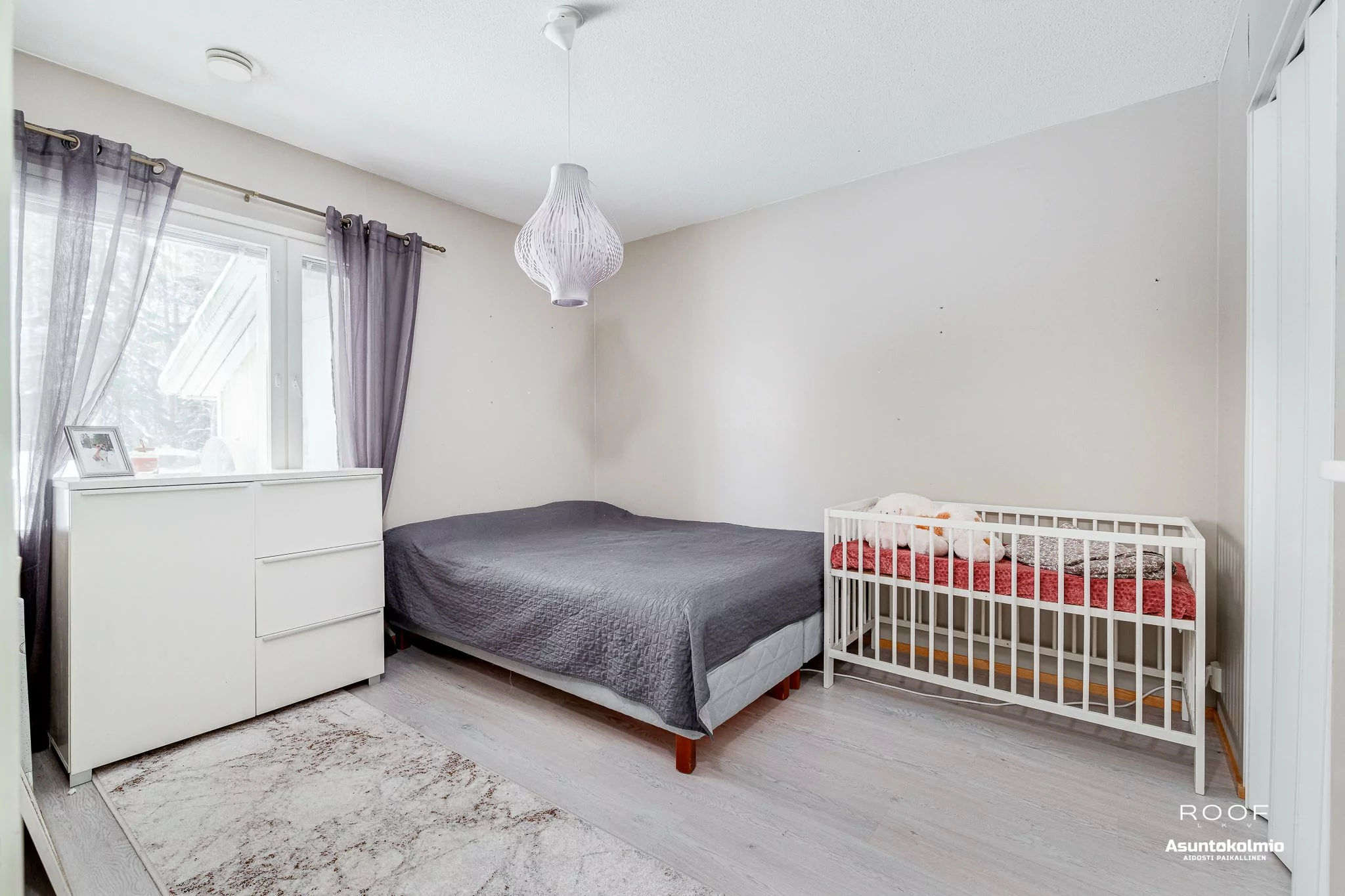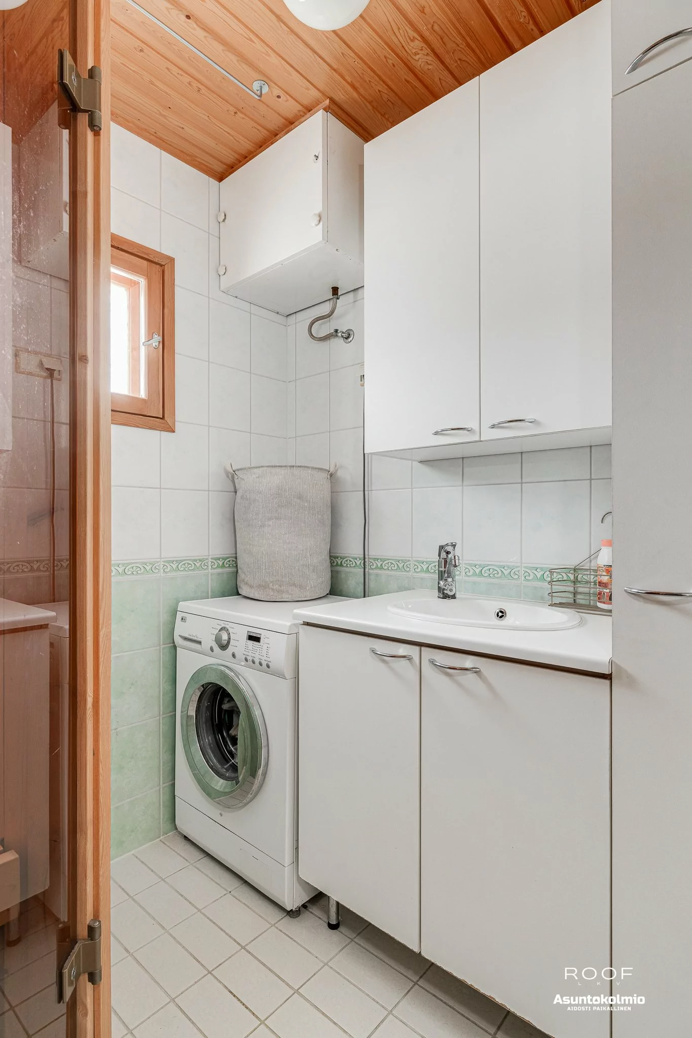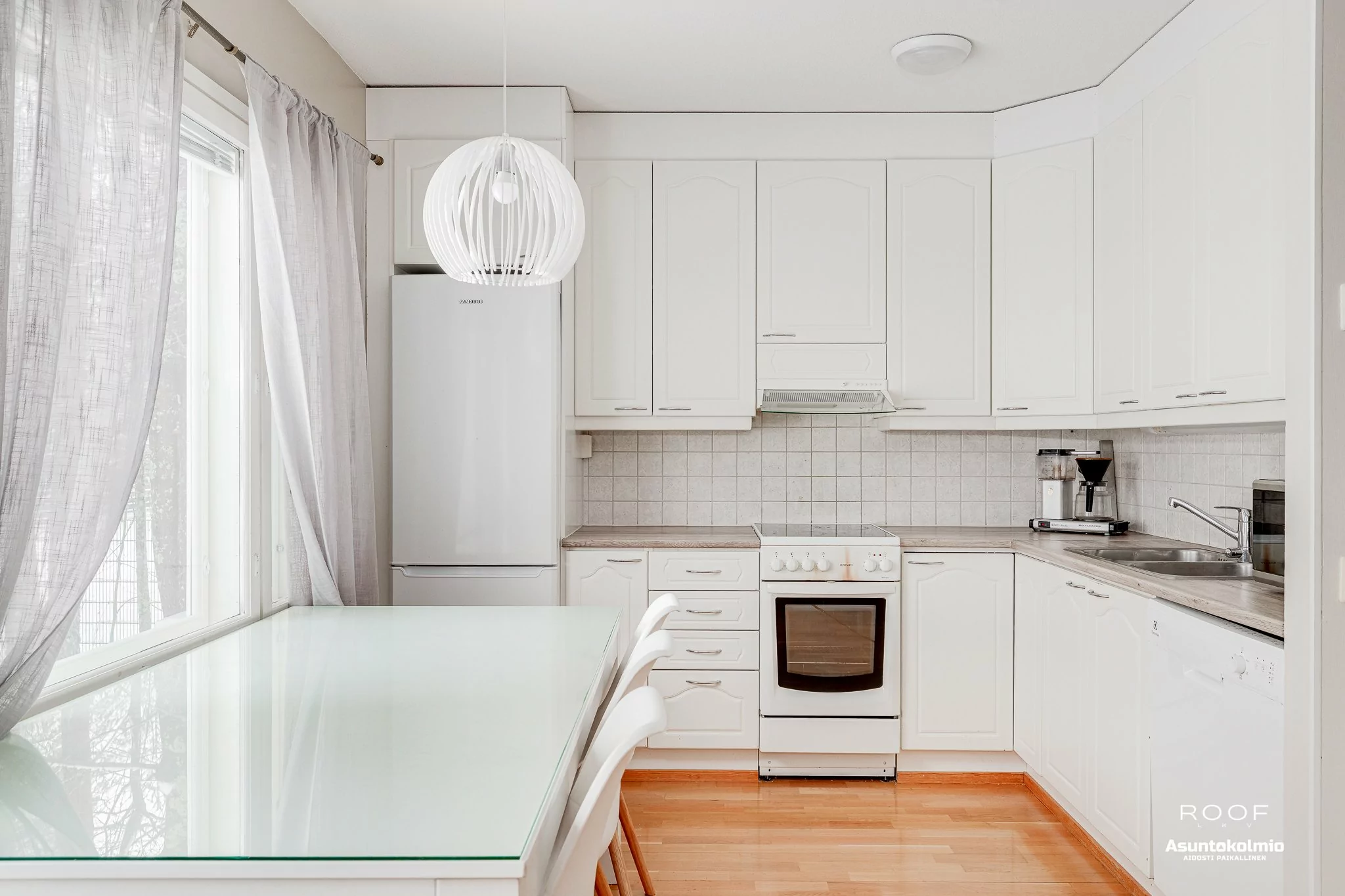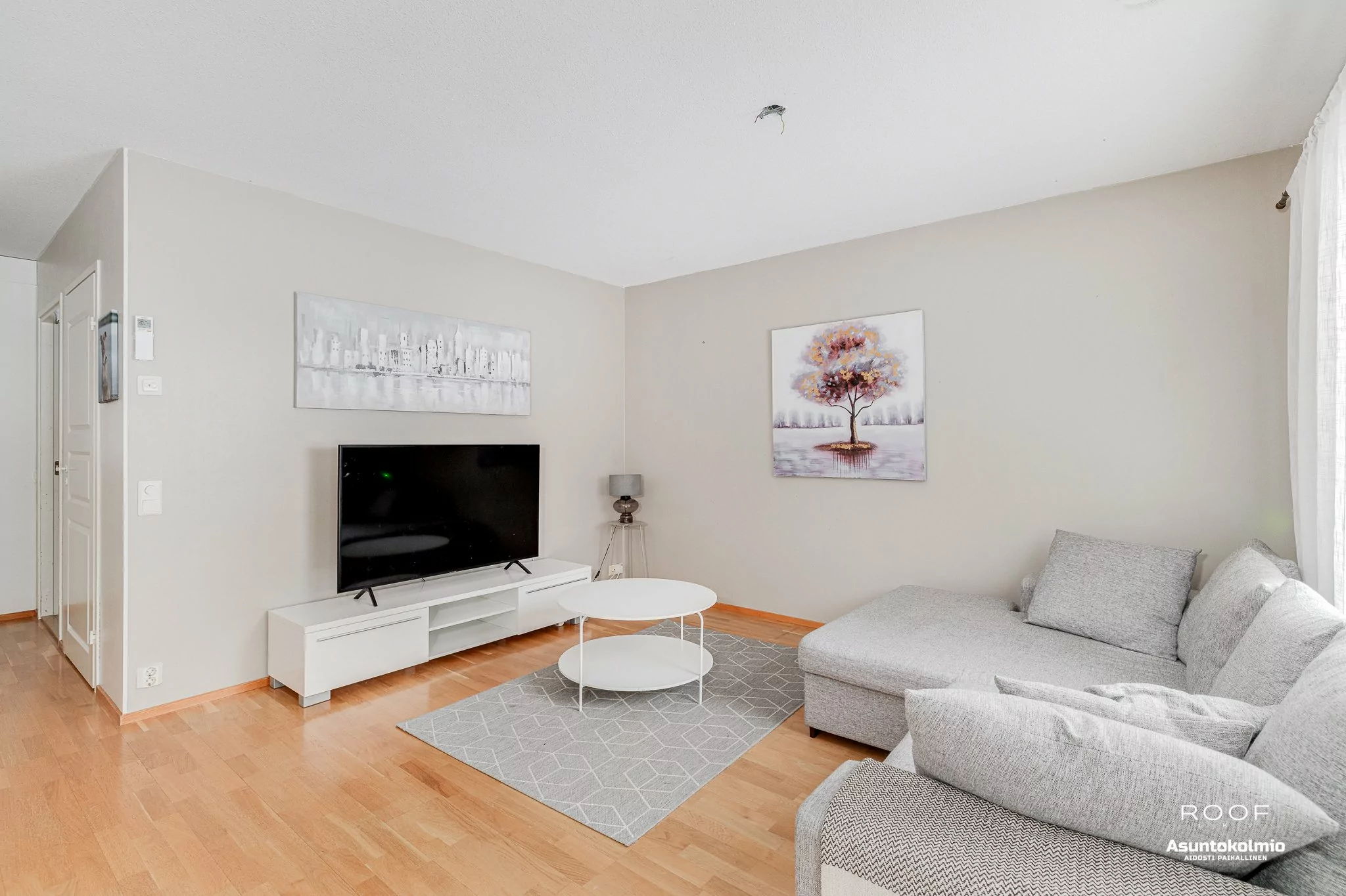 Olohuone on tilava ja valoisa. Olohuoneen yhteyteen sijoittuu keittiö, jossa hyvin kaappi- ja laskutilaa. Olohuoneesta on kulku omalle hyvän kokoiselle takapihalle. Takapihalle on mahdollista tehdä isompikin terassi. Makuuhuoneita on kaksi ja toisen huoneen yhteyteen sijoituu vaatehuone. Kylpyhuoneen yhteydessä on kodinhoitotila, jossa on kaapistot ja pöytätaso, tilaan on myös pyykkitornille. Sisäänkäynnin yhteydessä on huoneistolle kuuluva kylmä ulkovarasto. Autolle on autokatosp...