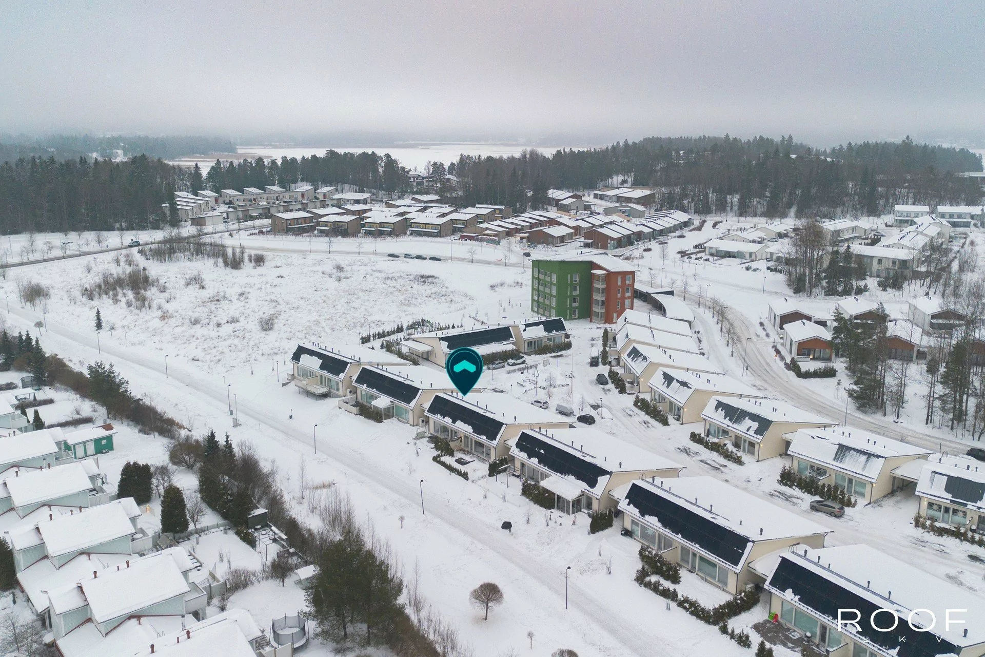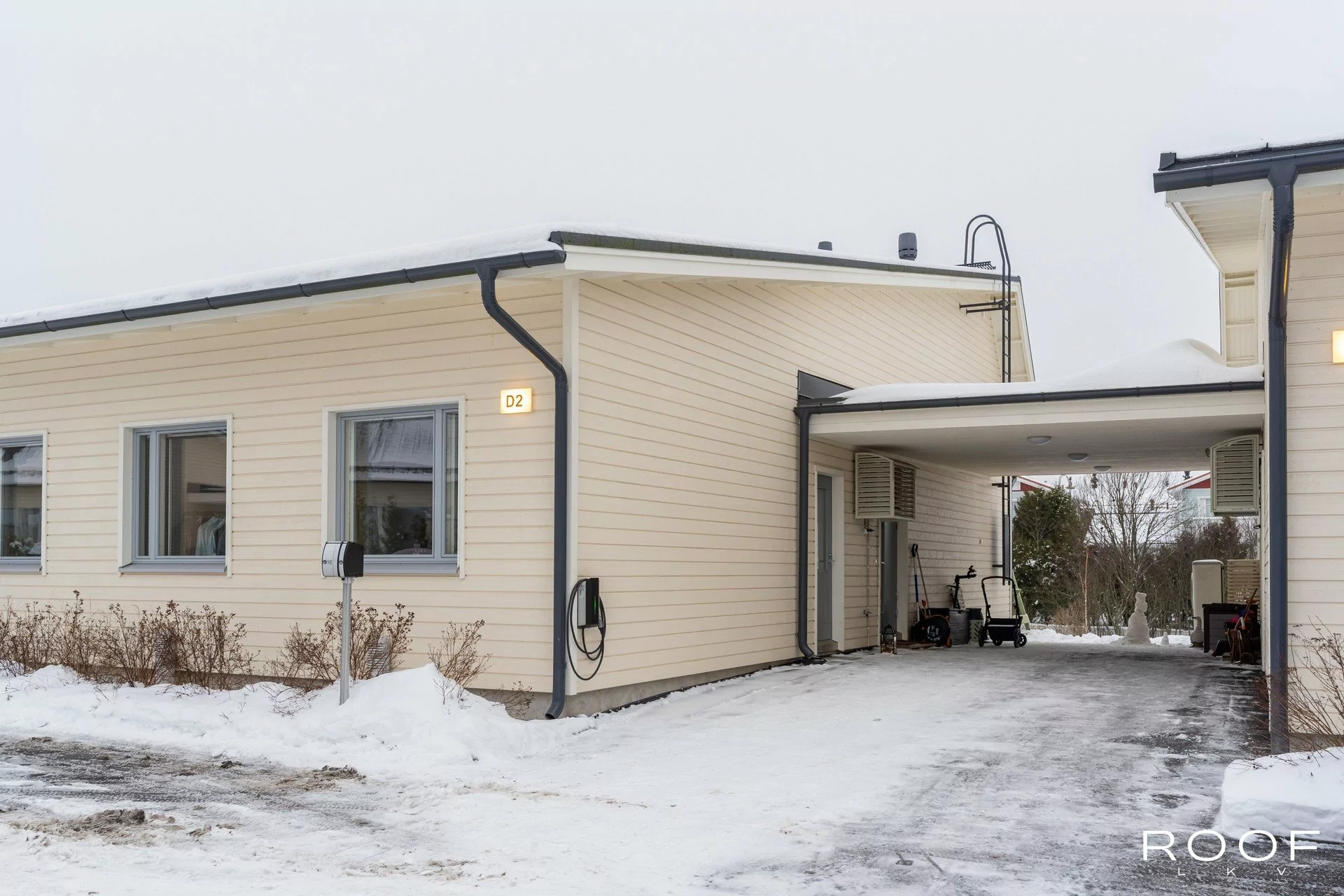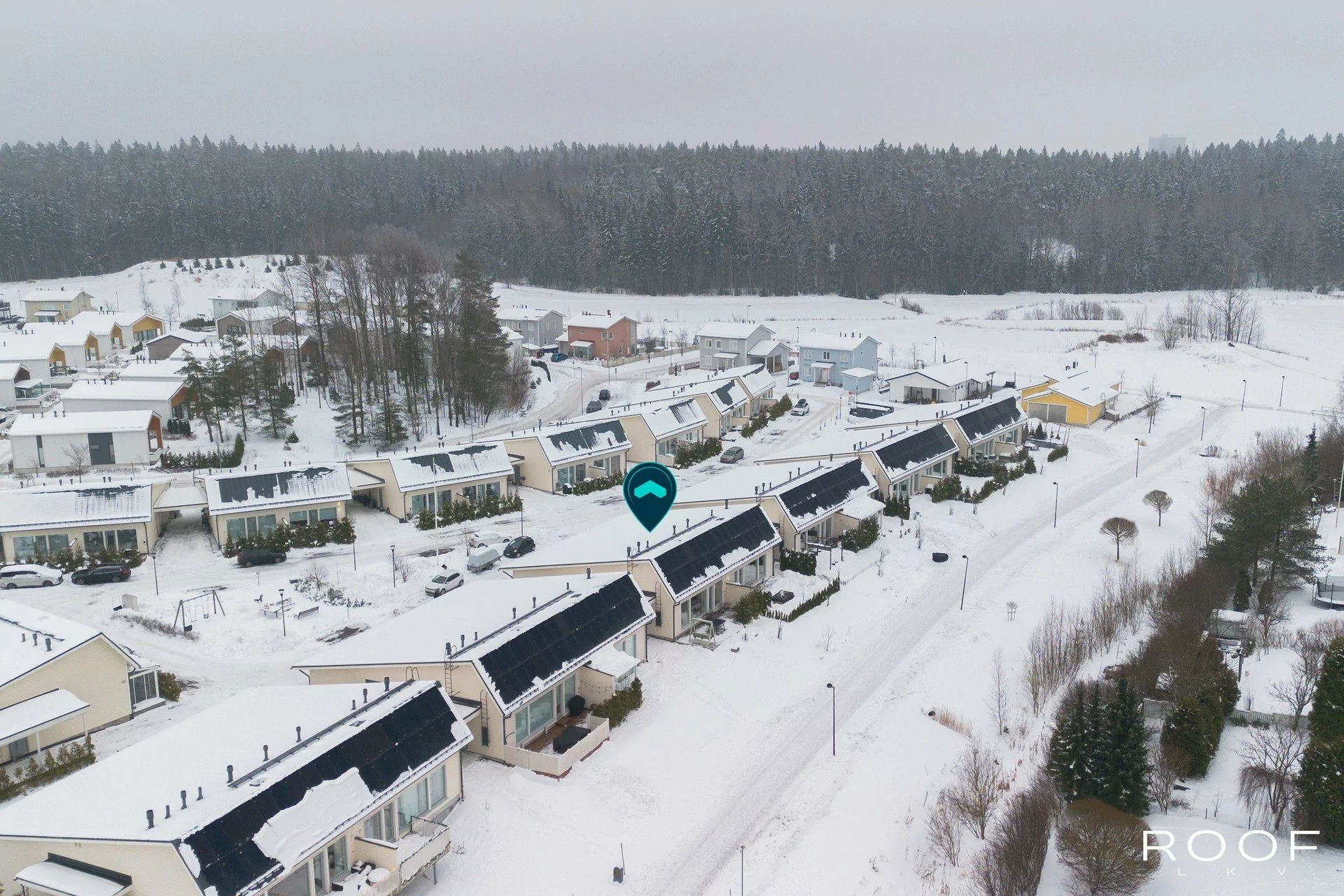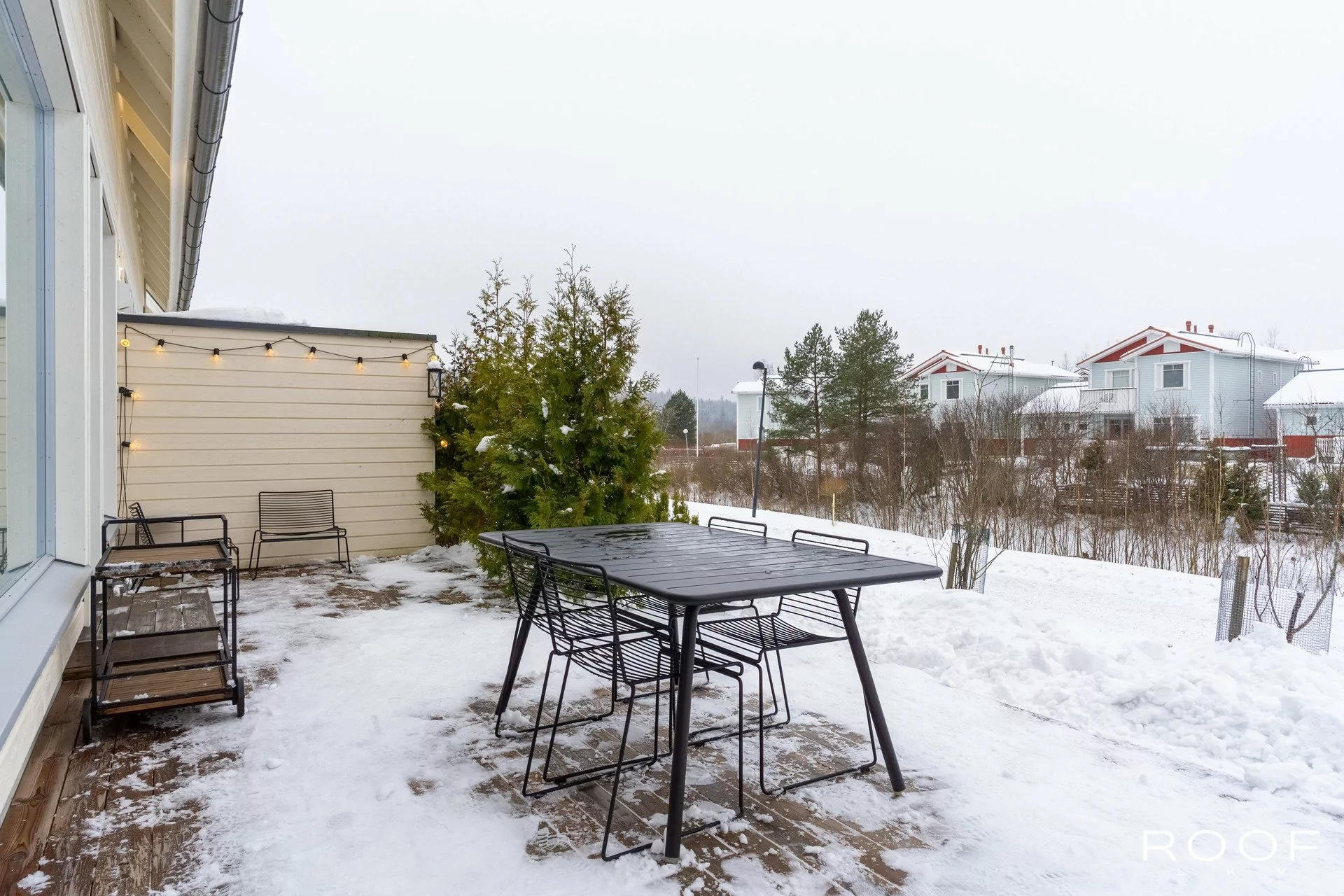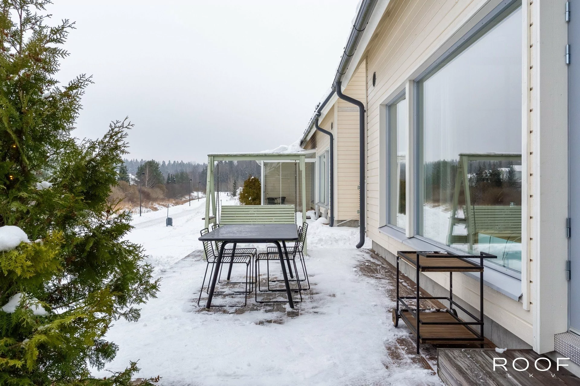 Suurista ikkunoista avautuvat vehreät näkymät, ja pihalla odottaa viihtyisä patio, jossa on helppo r...