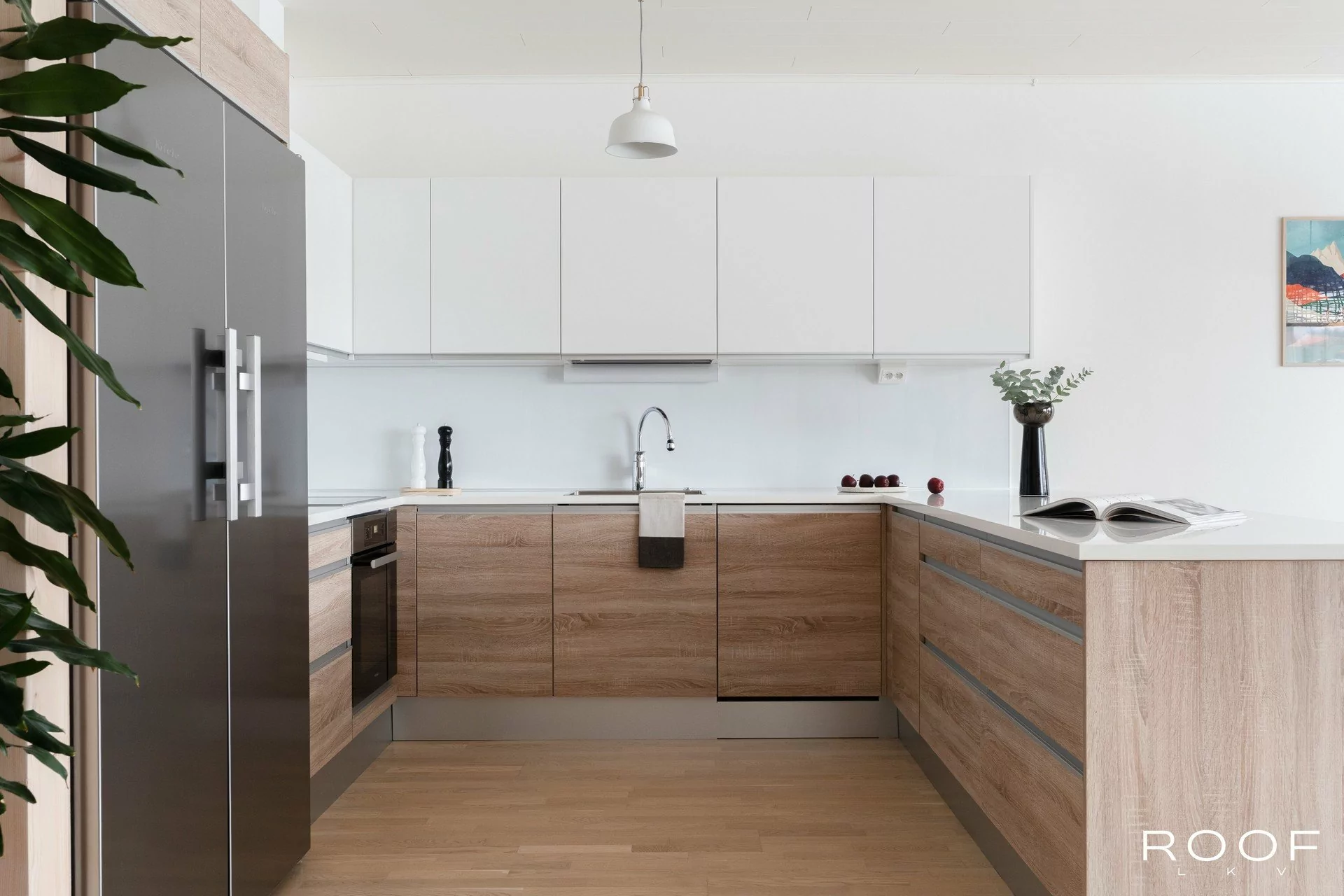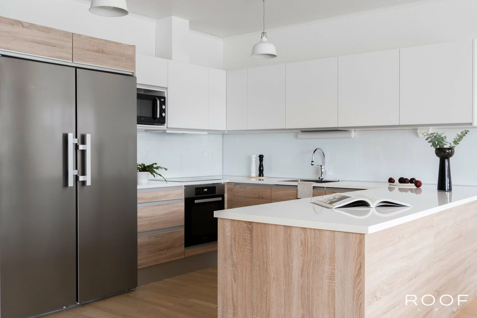 Kodin sydän on olohuoneen ja keittiön muodostama yhtenäinen tila, jossa on mukava kokoontua perheen kesken. Tyylikäs Ala Carte keittiö sointuu sulavasti kodin vaaleisiin pintoihin ja lämpimiin puunsävyihin.