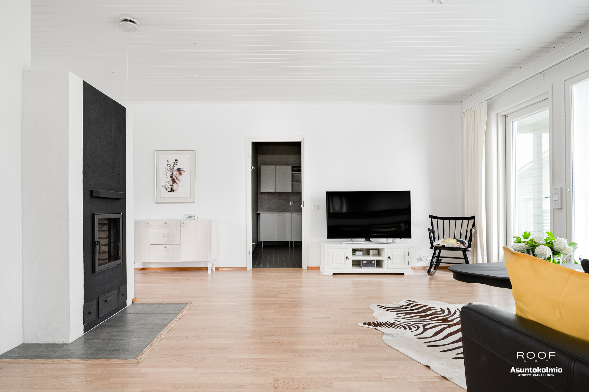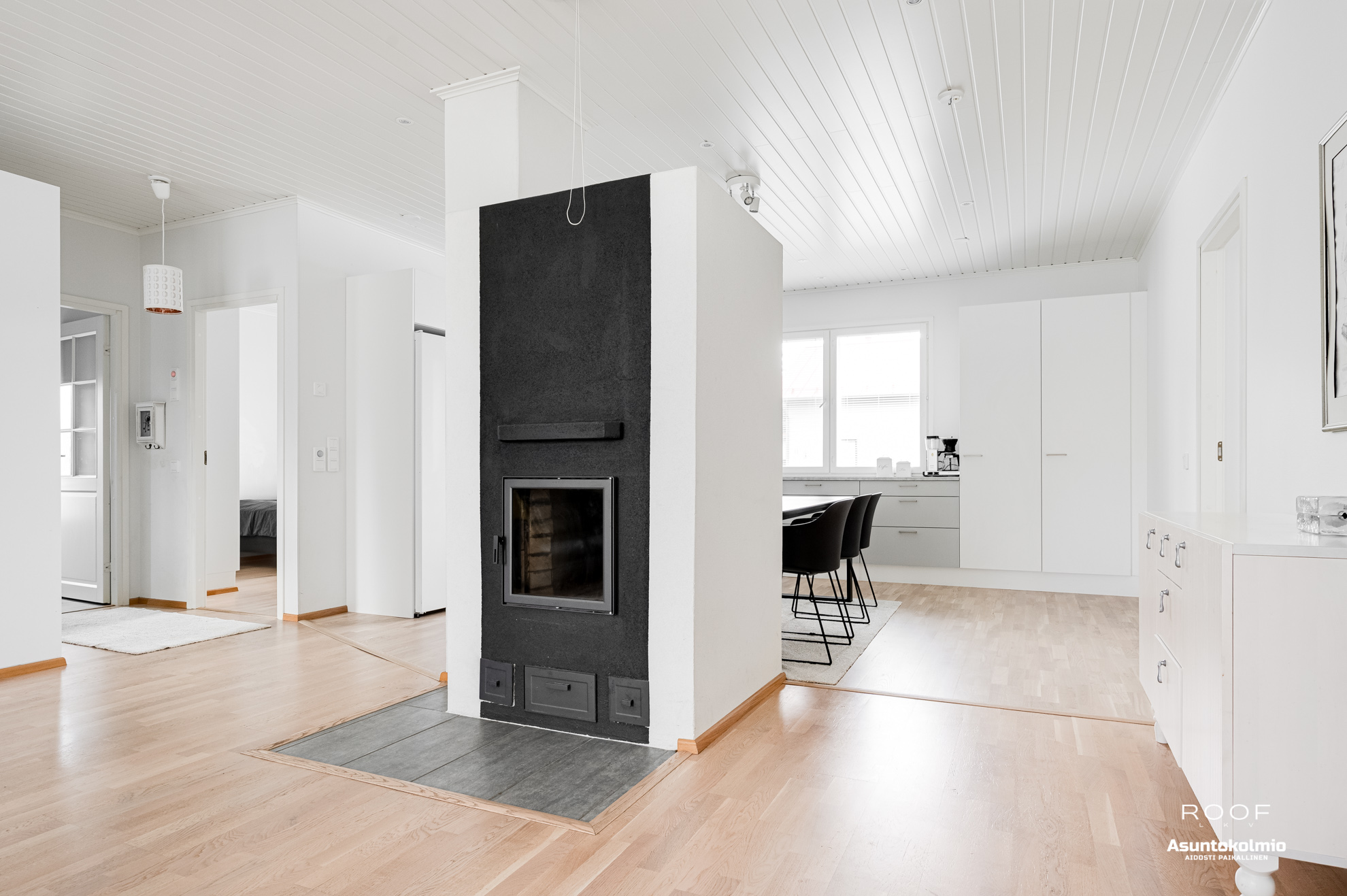 Asuintilat on sijoiteltu käytännöllisesti yhtenäisen olohuone-keittiön ympärille. Olohuoneen ja keittiön erottaa toisistaan varaava takka ja olohuoneesta on näkymät hyvänkokoiselle takapihalle. Piha-aluetta kiertää pensasaidat, jotka ovat hyvää vauhtia kasvamassa tontin suojaksi. Kodin erikoisuuksiin kuuluu erillinen ihastuttava pihasaunaosasto, johon kulku lasitetun terassin kautta. Saunaosastossa on kylpyhuone-wc:n ja puulämmitteisen saunan lisäksi erityisen tunnelmallinen saunatupa, jossa lattialämmitys ja oma takka.