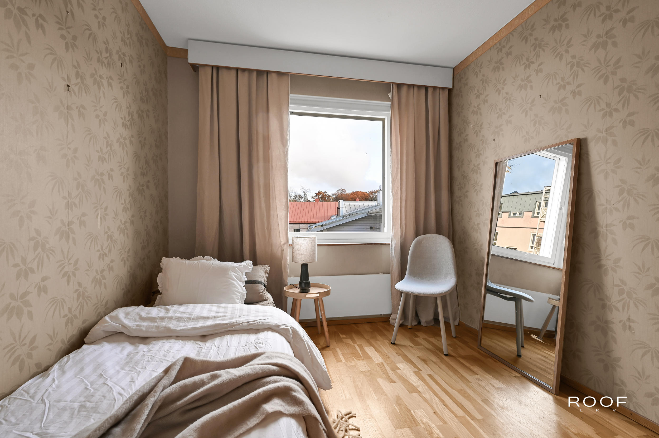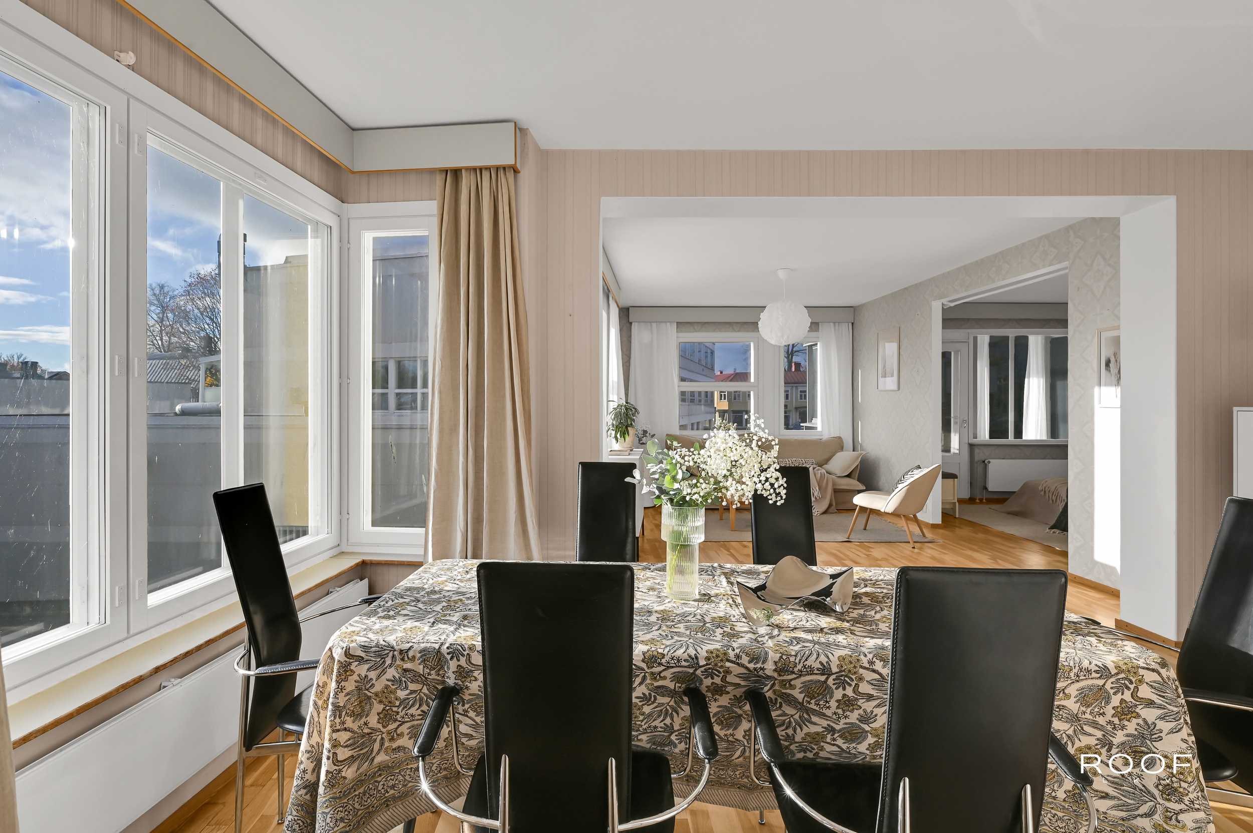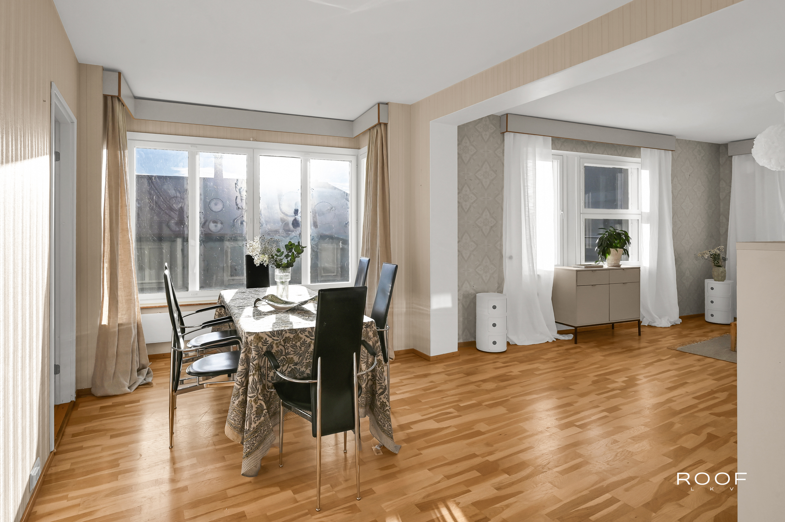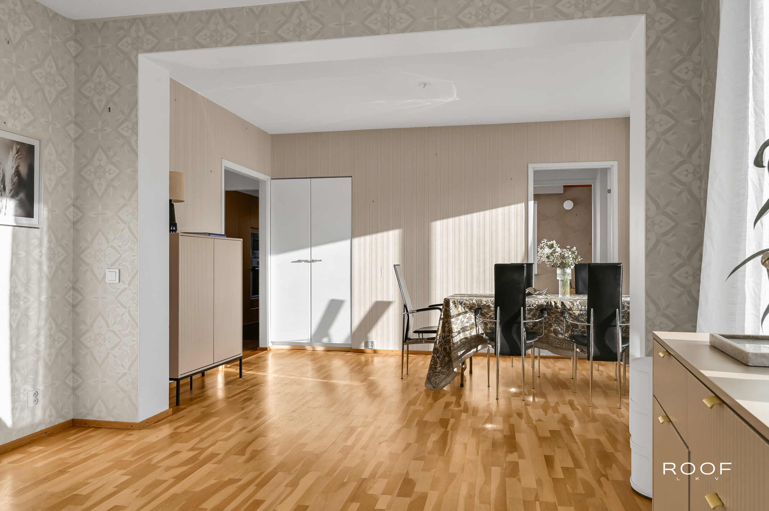 Lägenheten på andra våningen omfattar 4–5 rum och kök, badrum samt egen bastu. Perfekt för dig som önskar gott om utrymme för familjeliv, hemarbete eller gäster.